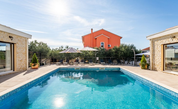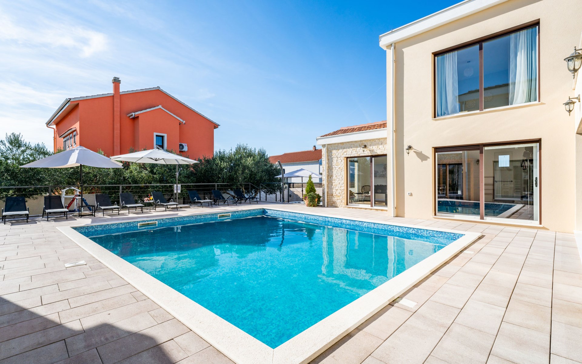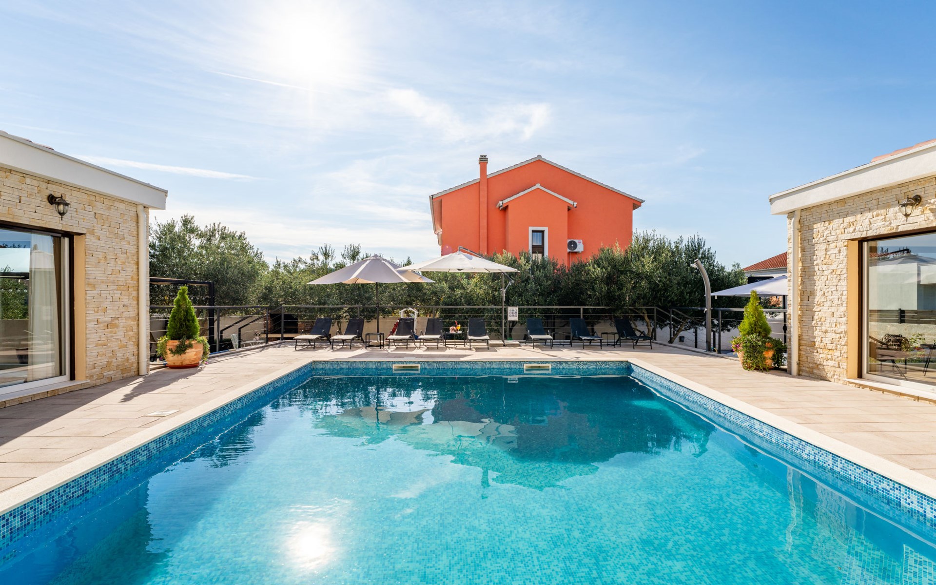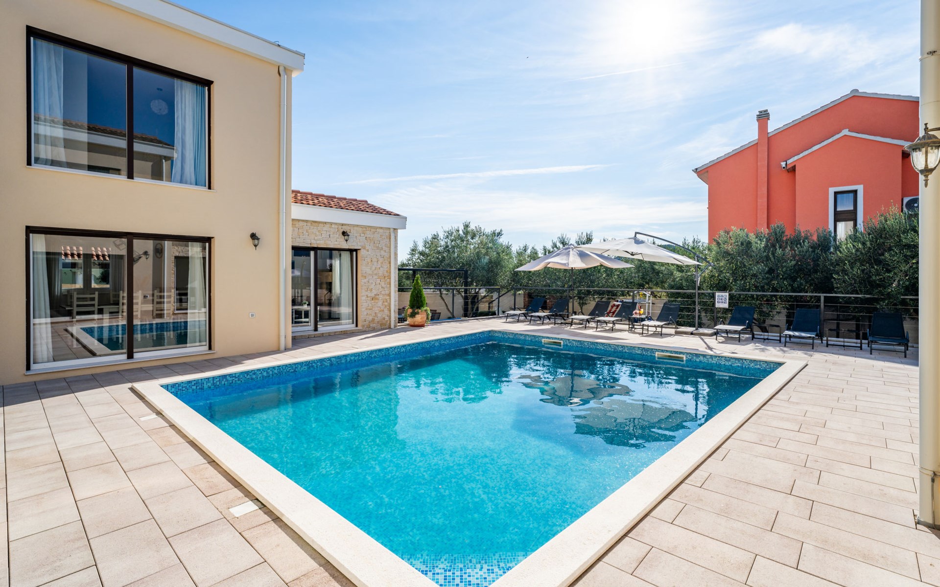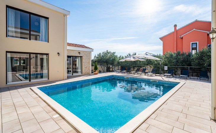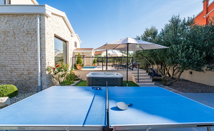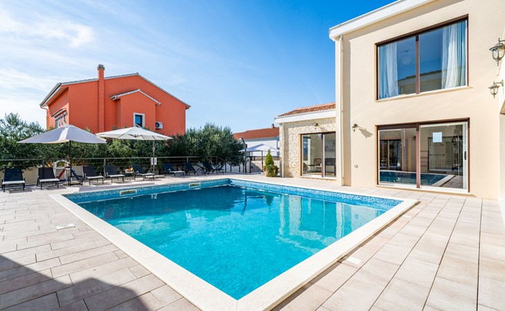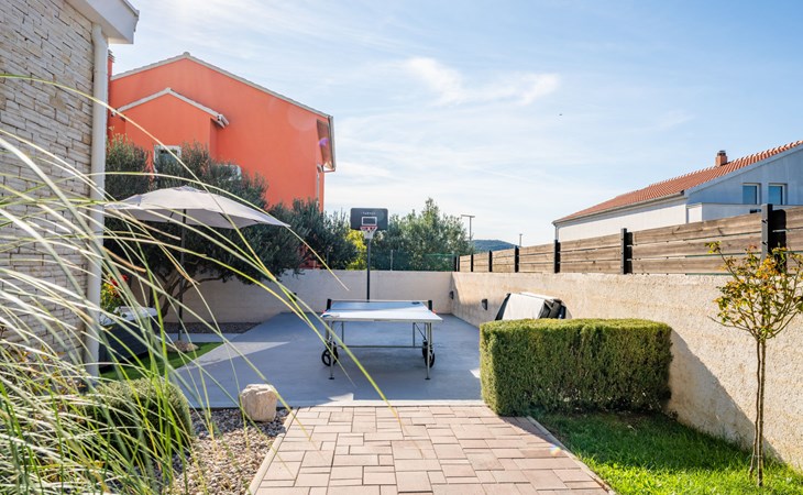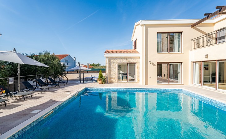 Gorica 10 km von Sukošan: Luxuriöses Einfamilienhaus "Jagoda". Ruhige, sonnige Lage, 8 km vom Meer. Zur Alleinbenutzung: Grundstück 700 m2 (eingezäunt), Pflanzen und Blumen, Schwimmbad (8 x 6 m, 48 m2, 150 cm tief, saisonale Verfügbarkeit: 01.Mai. - 01.Okt.) mit Innentreppe und Salzelektrolyse-Reinigungssystem. Aussendusche, Sprudelbad, Tischtennis, Gartenmöbel, Grill (Rutschbahn, Schaukel). Im Hause: Internetzugang, Sauna, Fitnessraum, Trampolin, Waschmaschine. Parkplatz (für 4 Autos) beim Haus auf dem Grundstück. Einkaufsgeschäft 500 m, Supermarkt 10 km, Restaurant 10 km, Bushaltestelle 8.9 km, Kieselstrand 8 km. Nahe gelegene Sehenswürdigkeiten: Nationalpark Paklenica 50 km, Nationalpark Krka 68 km, Nationalpark Plitvice 152 km. Bekannte Seen in der Umgebung sind gut erreichbar: Park prirode Vransko jezero 18 km. Der Besitzer akzeptiert keine Jugendgruppen.