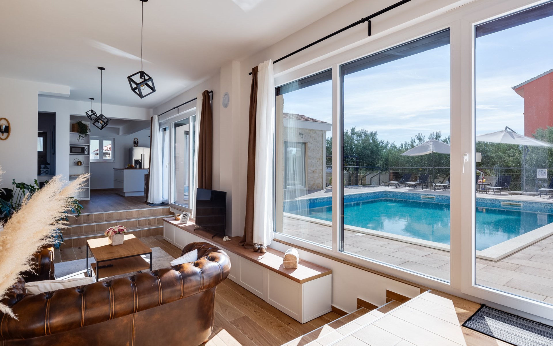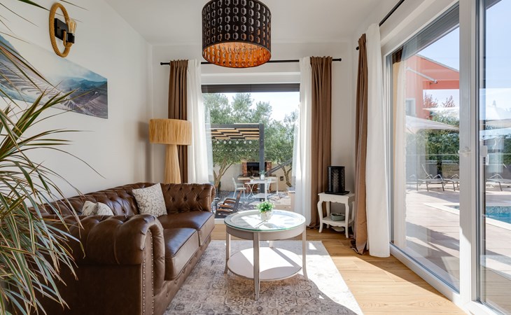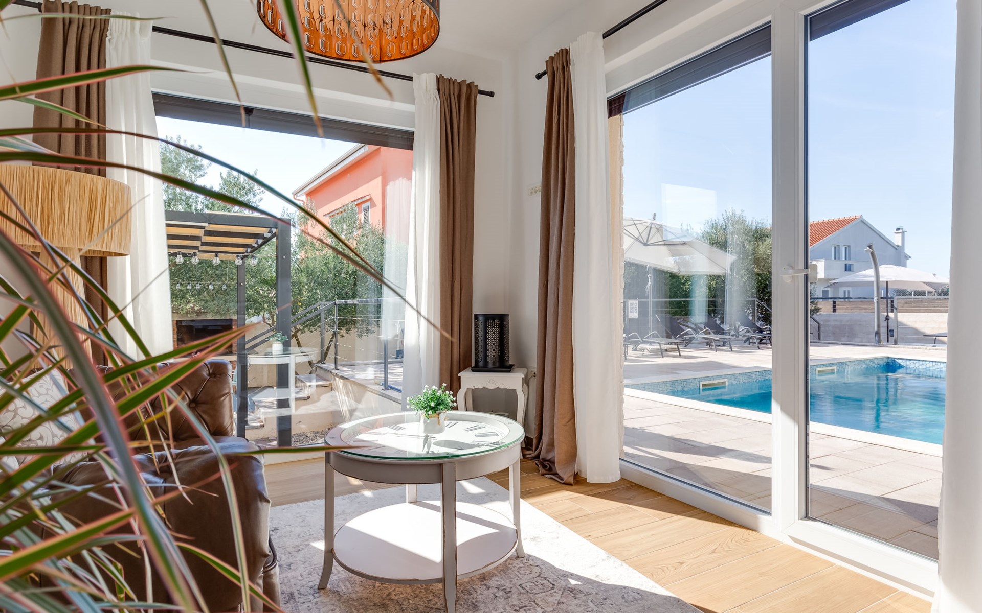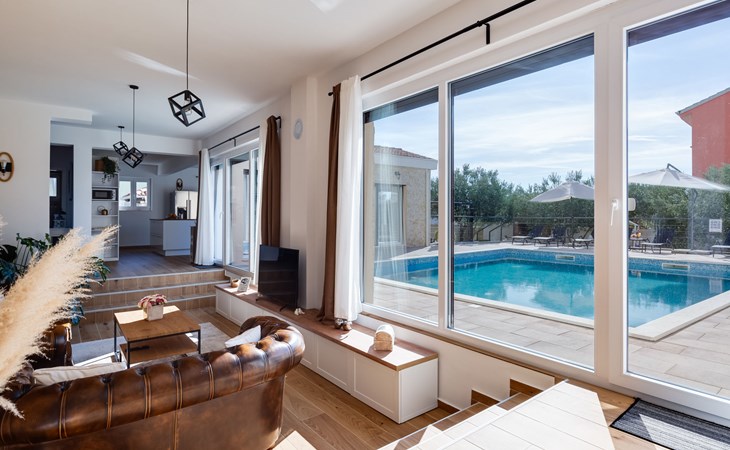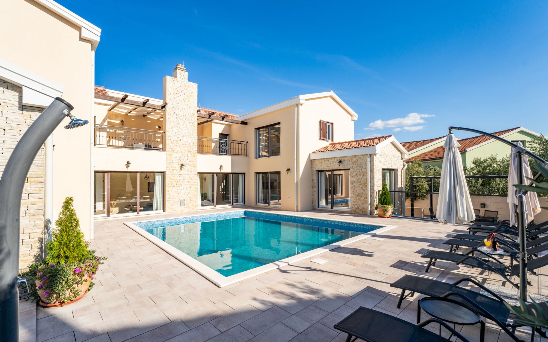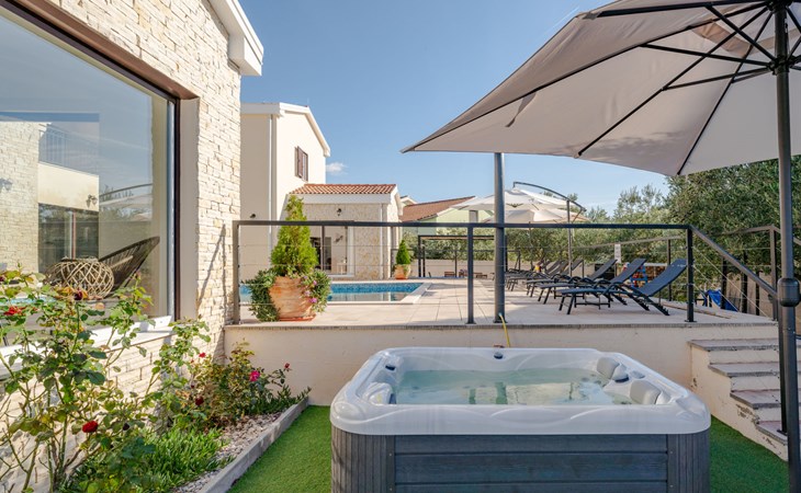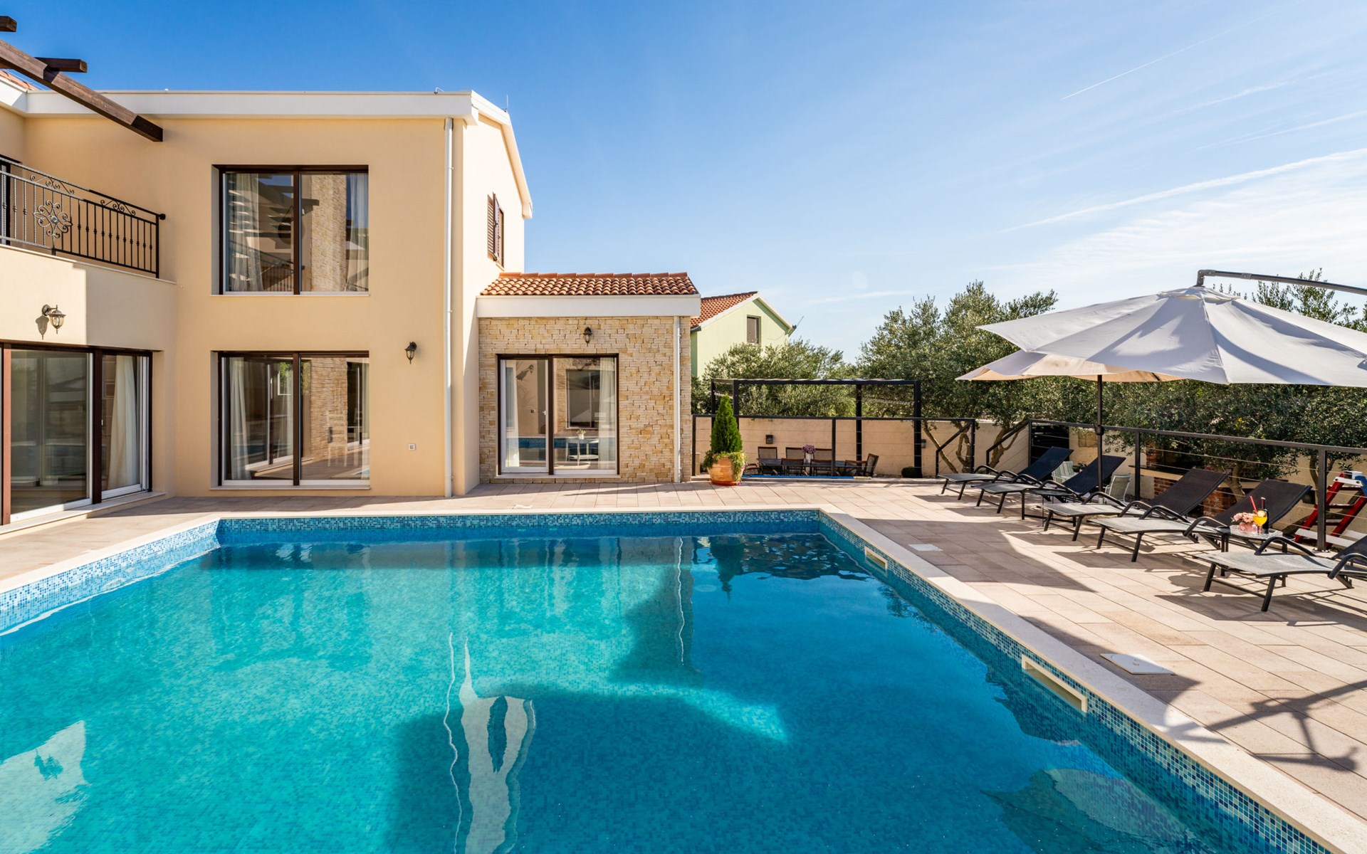 Gorica 10 km von Sukošan: Luxuriöses Einfamilienhaus "Jagoda". Ruhige, sonnige Lage, 8 km vom Meer. Zur Alleinbenutzung: Grundstück 700 m2 (eingezäunt), Pflanzen und Blumen, Schwimmbad (8 x 6 m, 48 m2, 150 cm tief, saisonale Verfügbarkeit: 01.Mai. - 01.Okt.) mit Innentreppe und Salzelektrolyse-Reinigungssystem. Aussendusche, Sprudelbad, Tischtennis, Gartenmöbel, Grill (Rutschbahn, Schaukel). Im Hause: Internetzugang, Sauna, Fitnessraum, Trampolin, Waschmaschine. Parkplatz (für 4 Autos) beim Haus auf dem Grundstück. Einkaufsgeschäft 500 m, Supermarkt 10 km, Restaurant 10 km, Bushaltestelle 8.9 km, Kieselstrand 8 km. Nahe gelegene Sehenswürdigkeiten: Nationalpark Paklenica 50 km, Nationalpark Krka 68 km, Nationalpark Plitvice 152 km. Bekannte Seen in der Umgebung sind gut erreichbar: Park prirode Vransko jezero 18 km. Der Besitzer akzeptiert keine Jugendgruppen.
