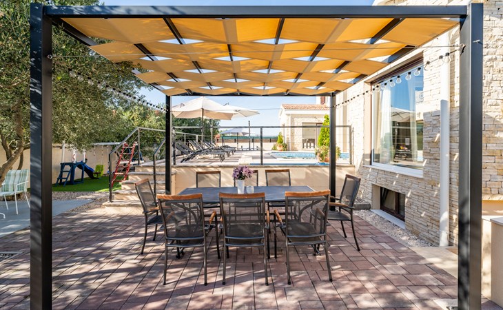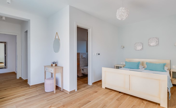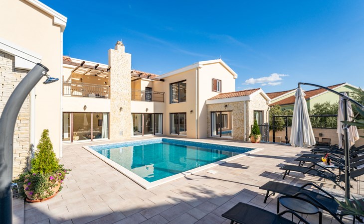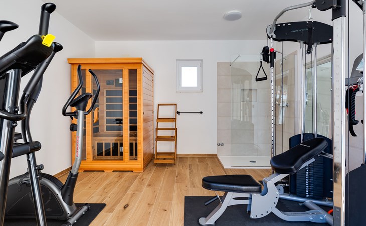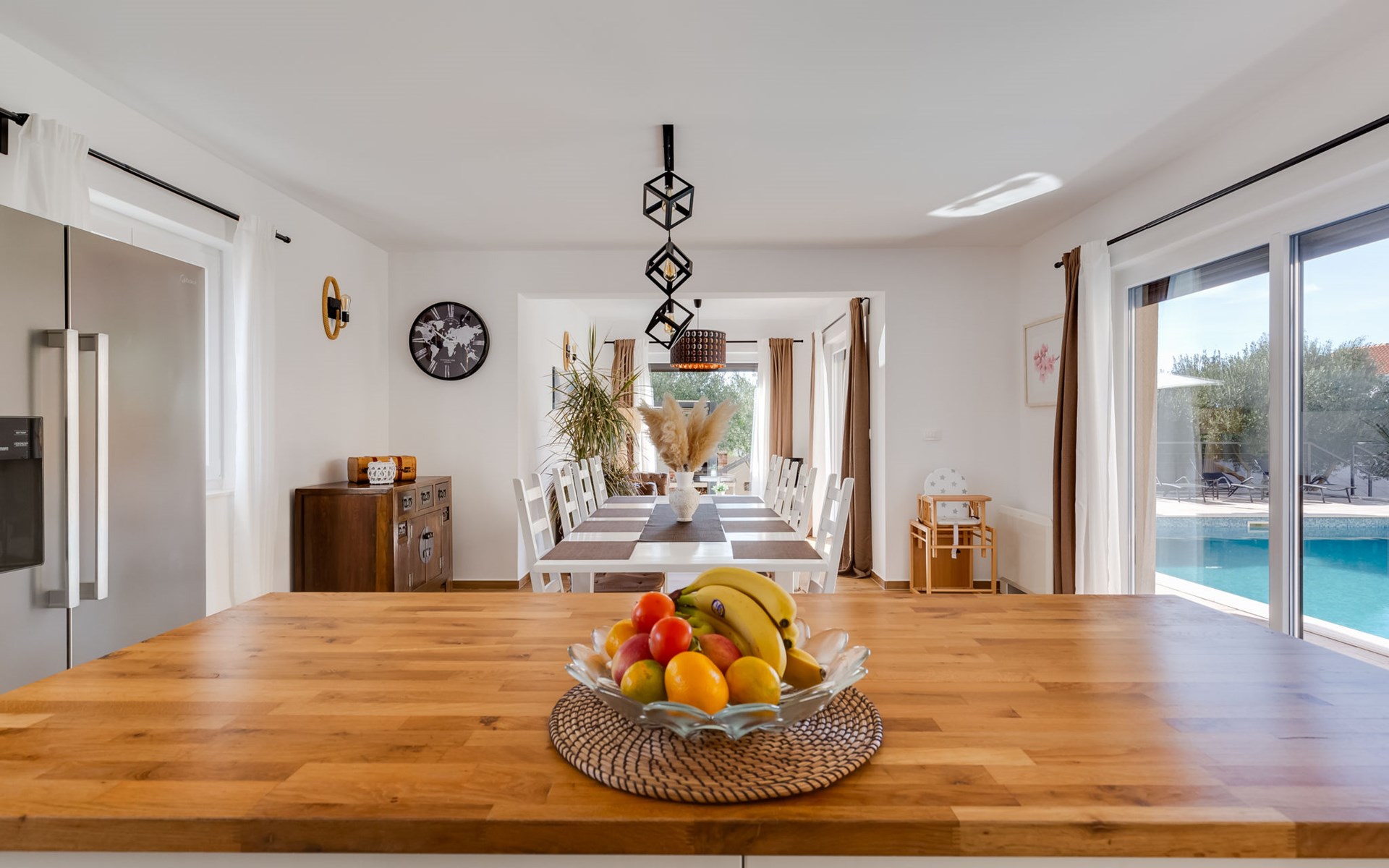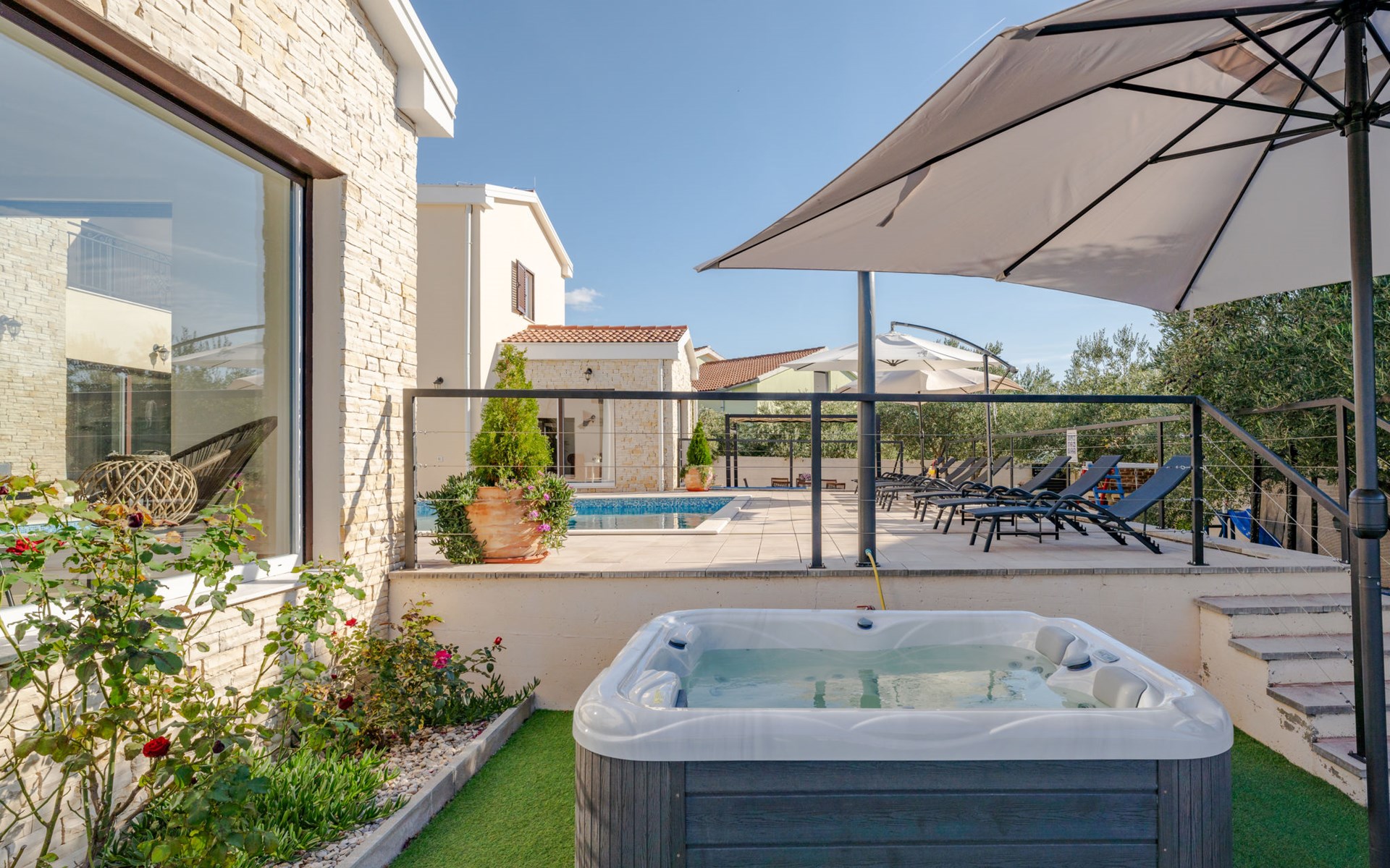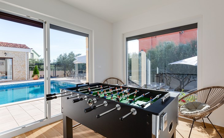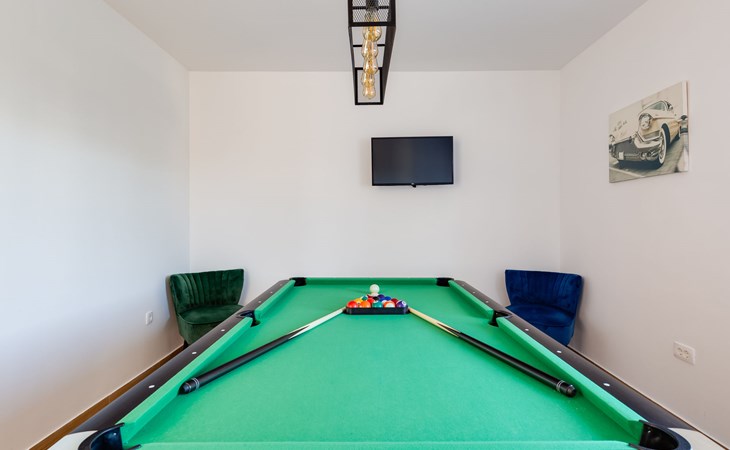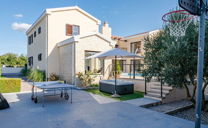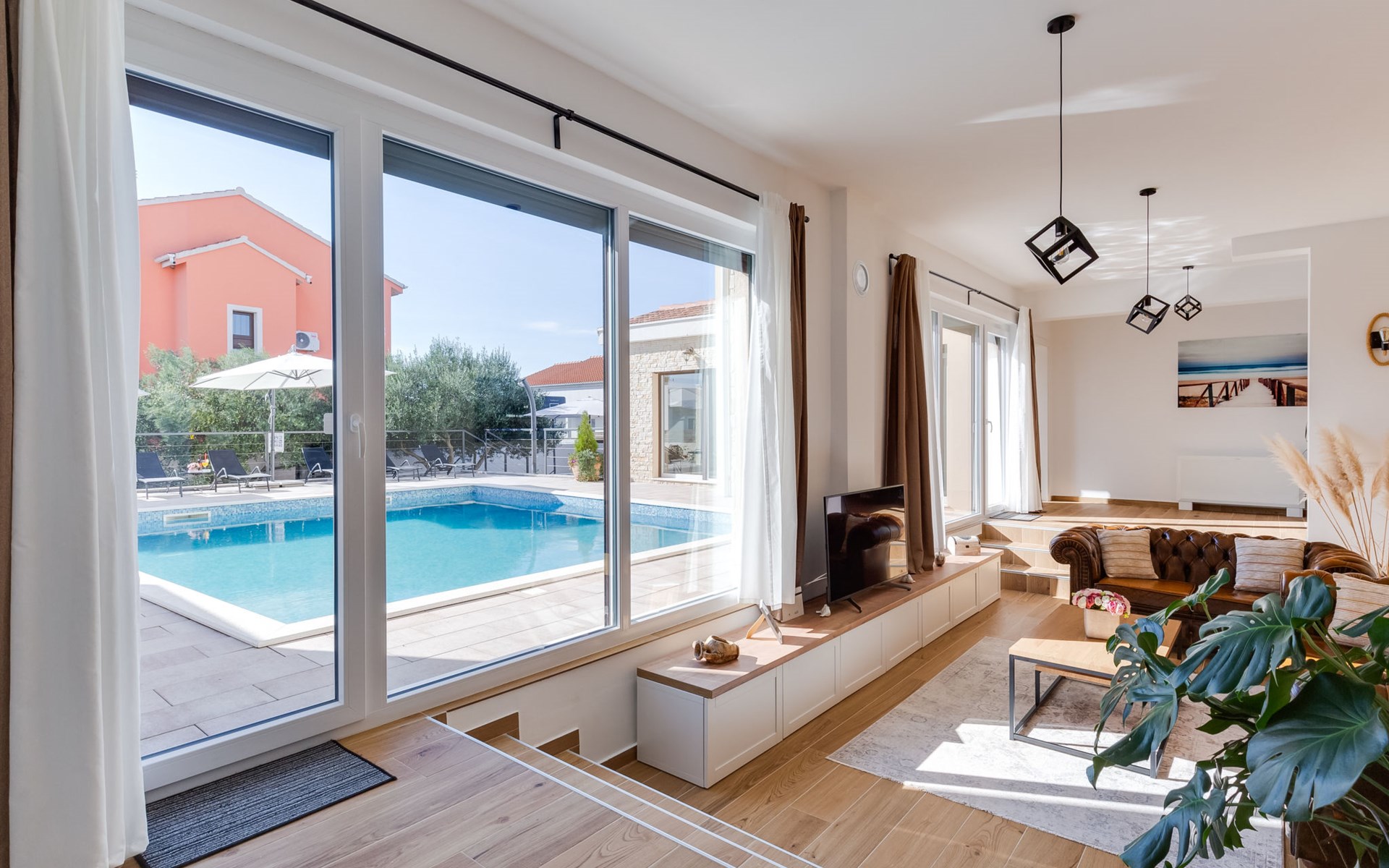 Gorica 10 km von Sukošan: Luxuriöses Einfamilienhaus "Jagoda". Ruhige, sonnige Lage, 8 km vom Meer. Zur Alleinbenutzung: Grundstück 700 m2 (eingezäunt), Pflanzen und Blumen, Schwimmbad (8 x 6 m, 48 m2, 150 cm tief, saisonale Verfügbarkeit: 01.Mai. - 01.Okt.) mit Innentreppe und Salzelektrolyse-Reinigungssystem. Aussendusche, Sprudelbad, Tischtennis, Gartenmöbel, Grill (Rutschbahn, Schaukel). Im Hause: Internetzugang, Sauna, Fitnessraum, Trampolin, Waschmaschine. Parkplatz (für 4 Autos) beim Haus auf dem Grundstück. Einkaufsgeschäft 500 m, Supermarkt 10 km, Restaurant 10 km, Bushaltestelle 8.9 km, Kieselstrand 8 km. Nahe gelegene Sehenswürdigkeiten: Nationalpark Paklenica 50 km, Nationalpark Krka 68 km, Nationalpark Plitvice 152 km. Bekannte Seen in der Umgebung sind gut erreichbar: Park prirode Vransko jezero 18 km. Der Besitzer akzeptiert keine Jugendgruppen.