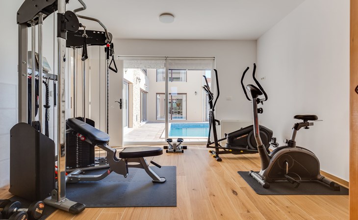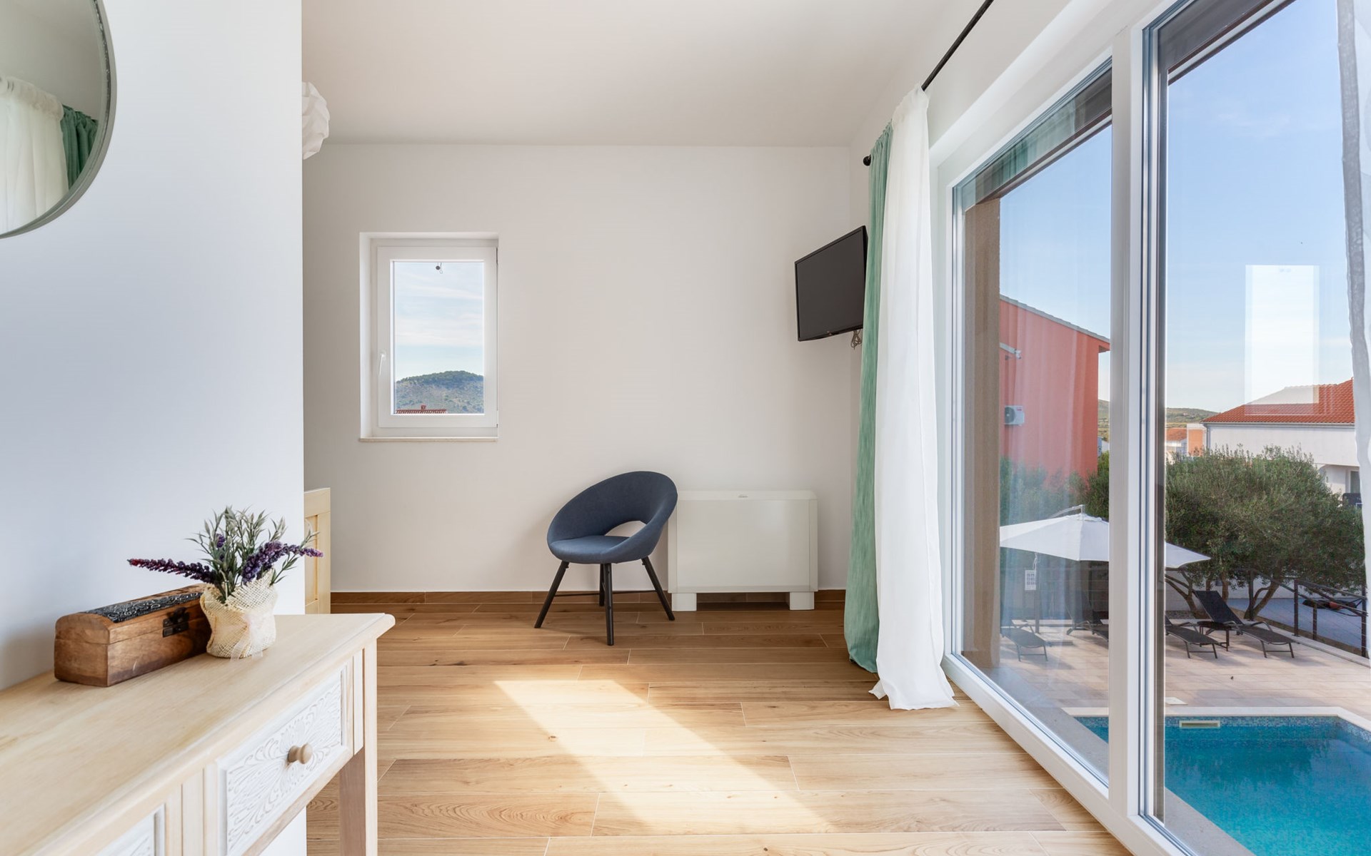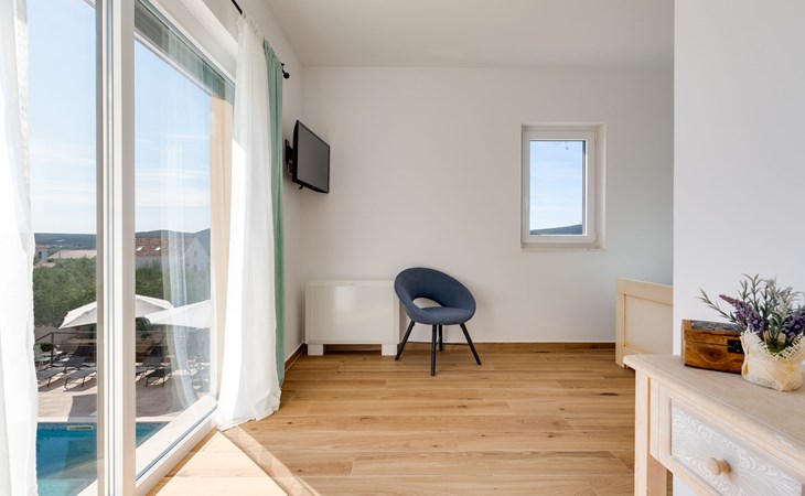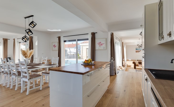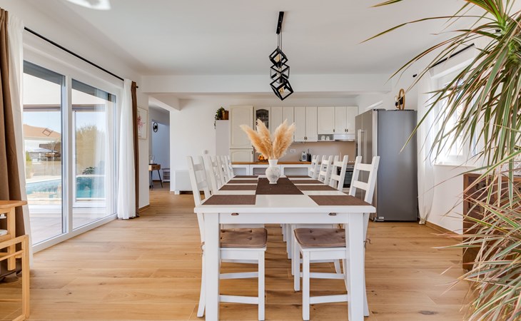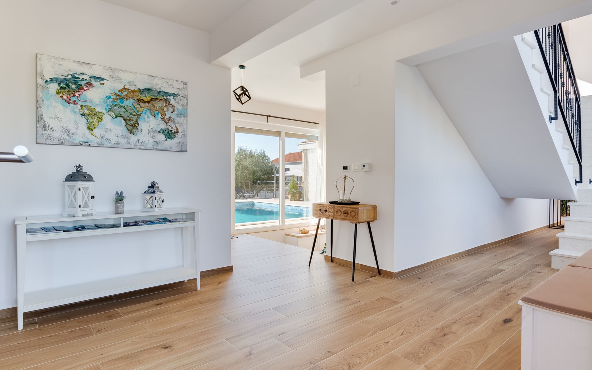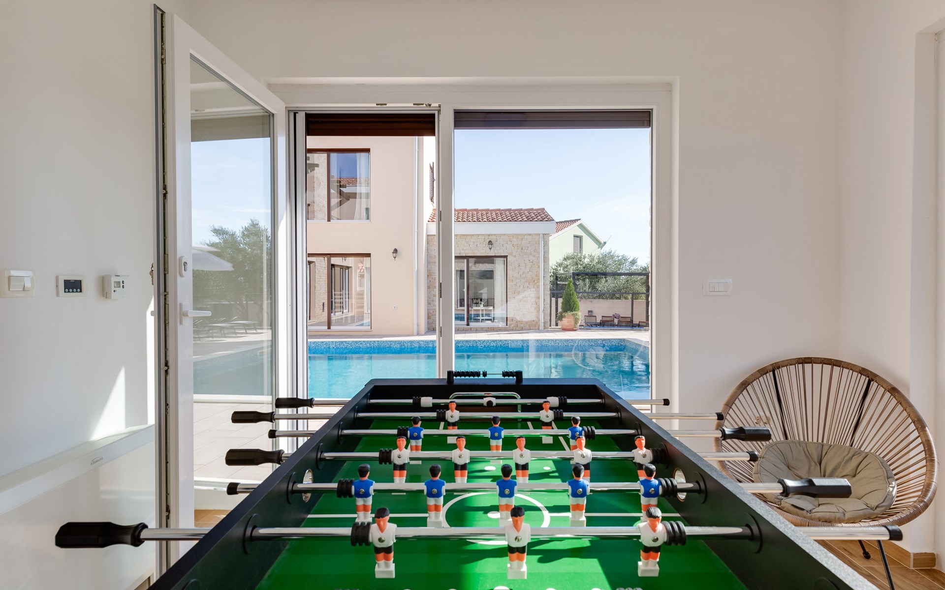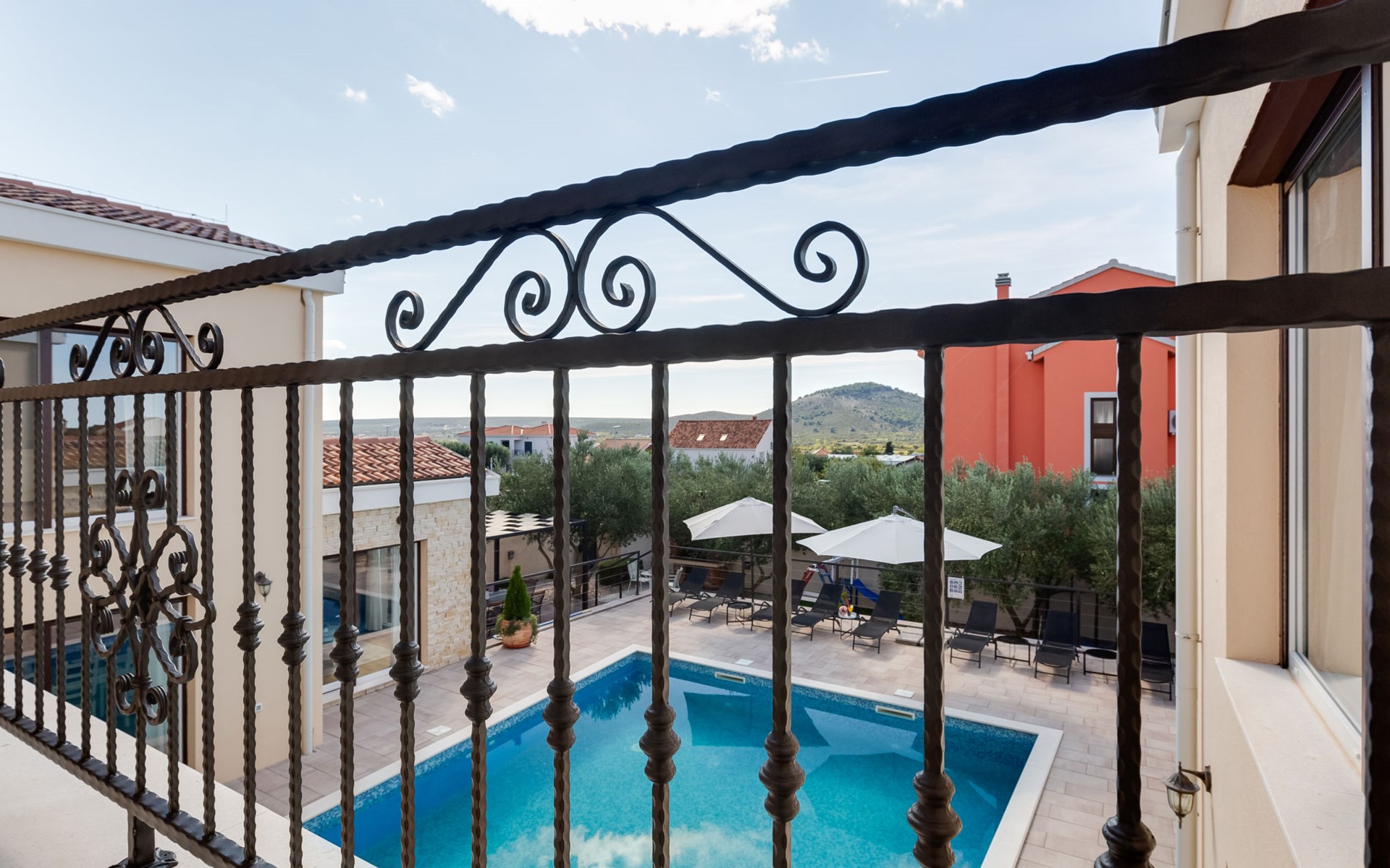 Gorica 10 km von Sukošan: Luxuriöses Einfamilienhaus "Jagoda". Ruhige, sonnige Lage, 8 km vom Meer. Zur Alleinbenutzung: Grundstück 700 m2 (eingezäunt), Pflanzen und Blumen, Schwimmbad (8 x 6 m, 48 m2, 150 cm tief, saisonale Verfügbarkeit: 01.Mai. - 01.Okt.) mit Innentreppe und Salzelektrolyse-Reinigungssystem. Aussendusche, Sprudelbad, Tischtennis, Gartenmöbel, Grill (Rutschbahn, Schaukel). Im Hause: Internetzugang, Sauna, Fitnessraum, Trampolin, Waschmaschine. Parkplatz (für 4 Autos) beim Haus auf dem Grundstück. Einkaufsgeschäft 500 m, Supermarkt 10 km, Restaurant 10 km, Bushaltestelle 8.9 km, Kieselstrand 8 km. Nahe gelegene Sehenswürdigkeiten: Nationalpark Paklenica 50 km, Nationalpark Krka 68 km, Nationalpark Plitvice 152 km. Bekannte Seen in der Umgebung sind gut erreichbar: Park prirode Vransko jezero 18 km. Der Besitzer akzeptiert keine Jugendgruppen.