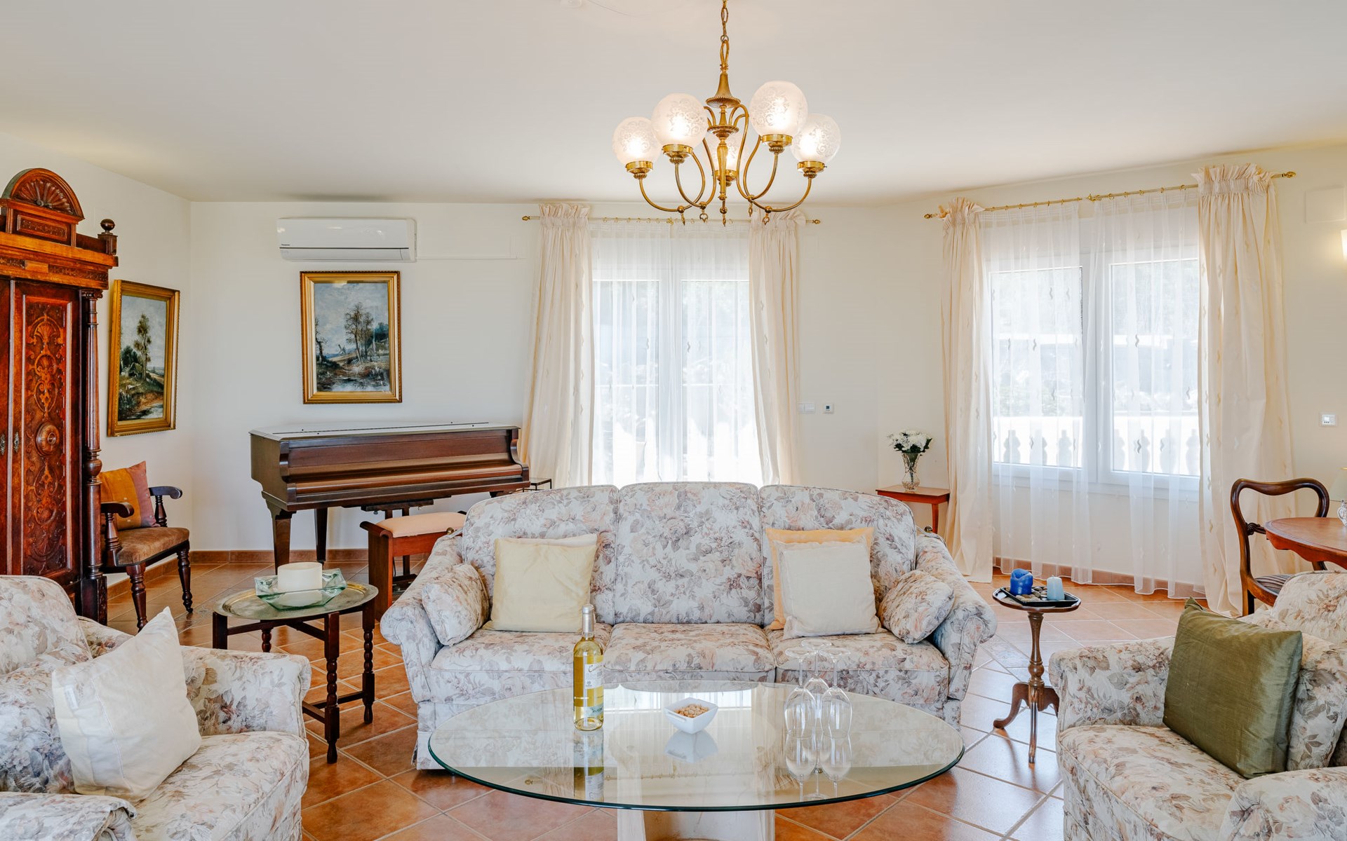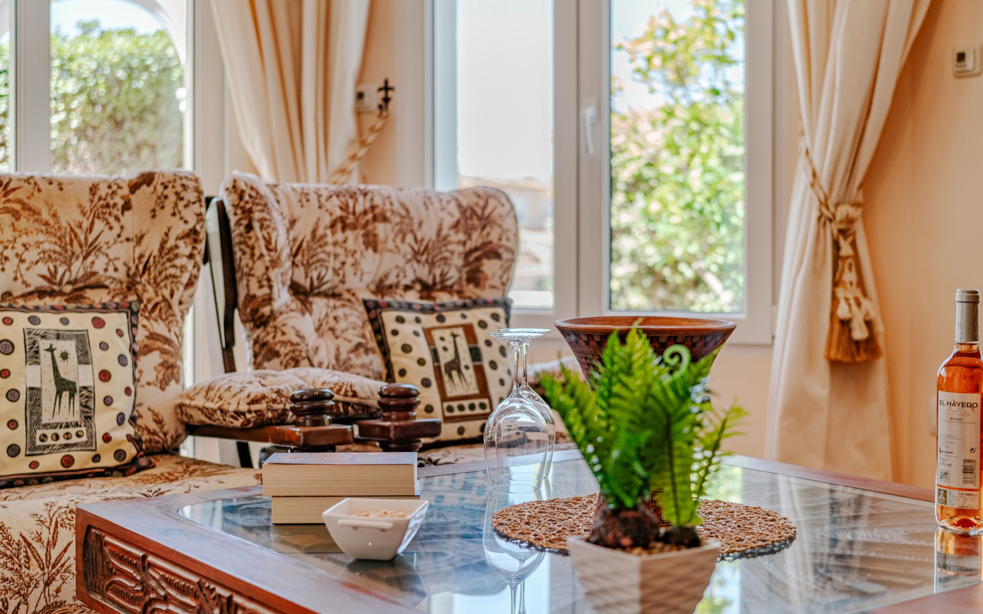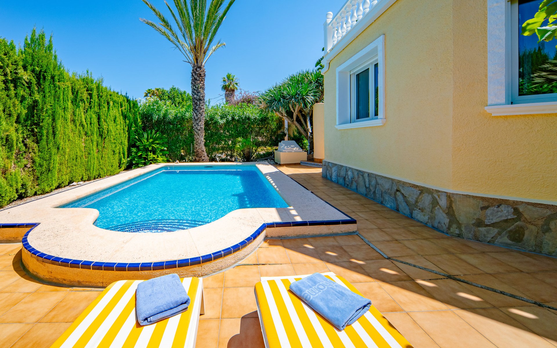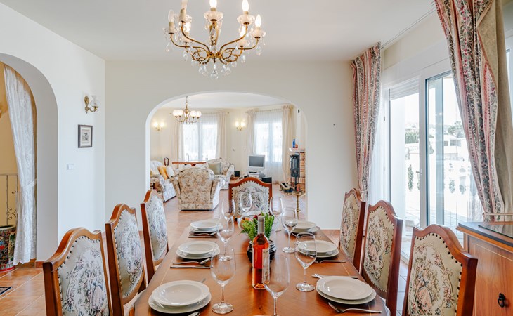 Sehr grosse, sehr schöne Villa "Marques", auf 2 Stockwerken. Im Ortsteil Marquesa VI, ruhige, sonnige Lage im Villenviertel, 5.3 km vom Meer, 5.3 km vom Strand. Zur Alleinbenutzung: grosser, schöner, gepflegter terrassierter Garten, Schwimmbad eckig (6 x 4 m, 120 - 170 cm tief, saisonale Verfügbarkeit: 01.Jan. - 31.Dez.) mit Innentreppe. Aussendusche, Pergola, Parkplatz (für 3 Autos) auf dem Grundstück. Supermarkt 3.7 km, Restaurant 2.8 km, Sandstrand "La Marineta Cassiana" 5.8 km. Surfschule 5.8 km, Segelschule 5.8 km. Der Besitzer akzeptiert keine Jugendgruppen.