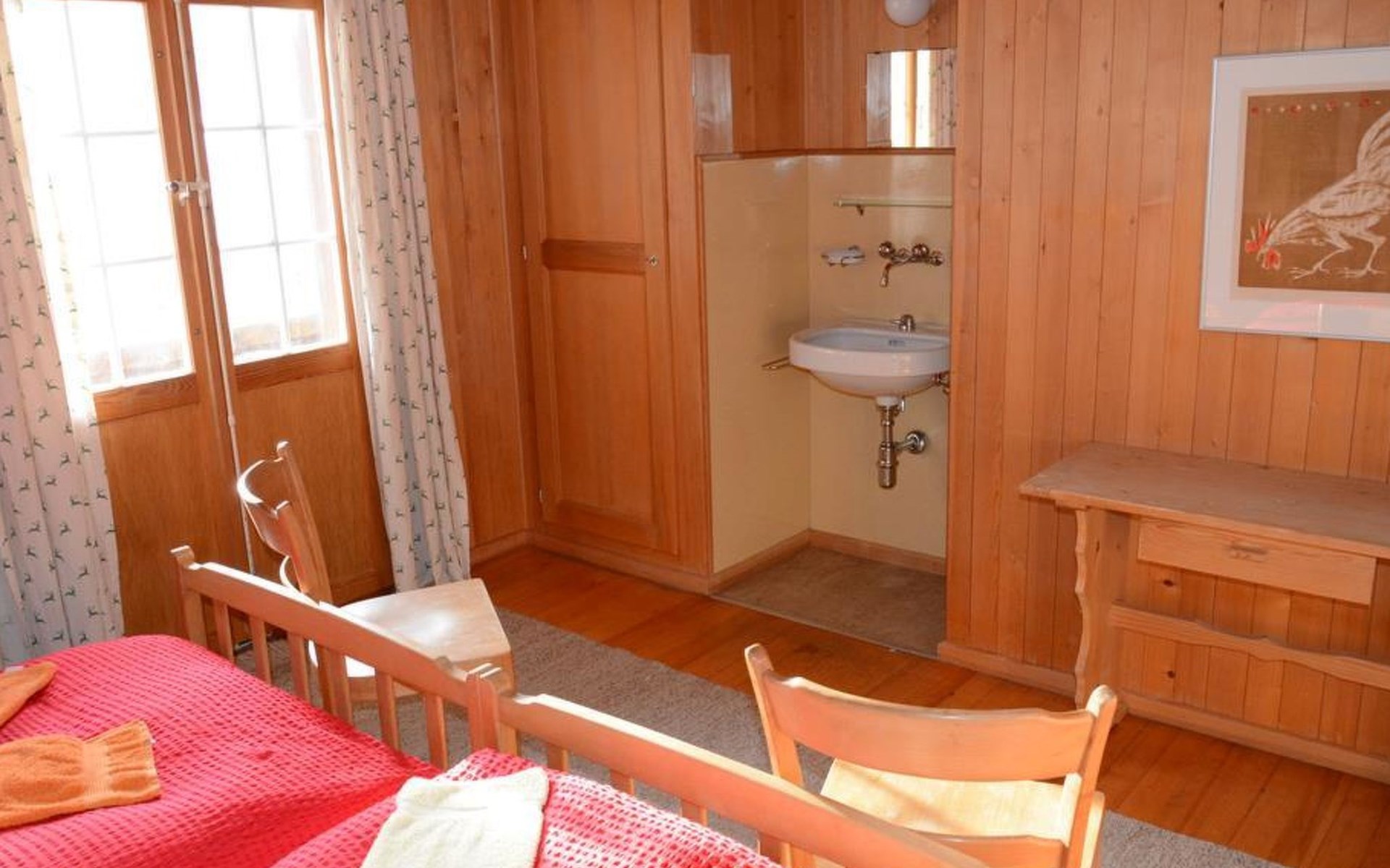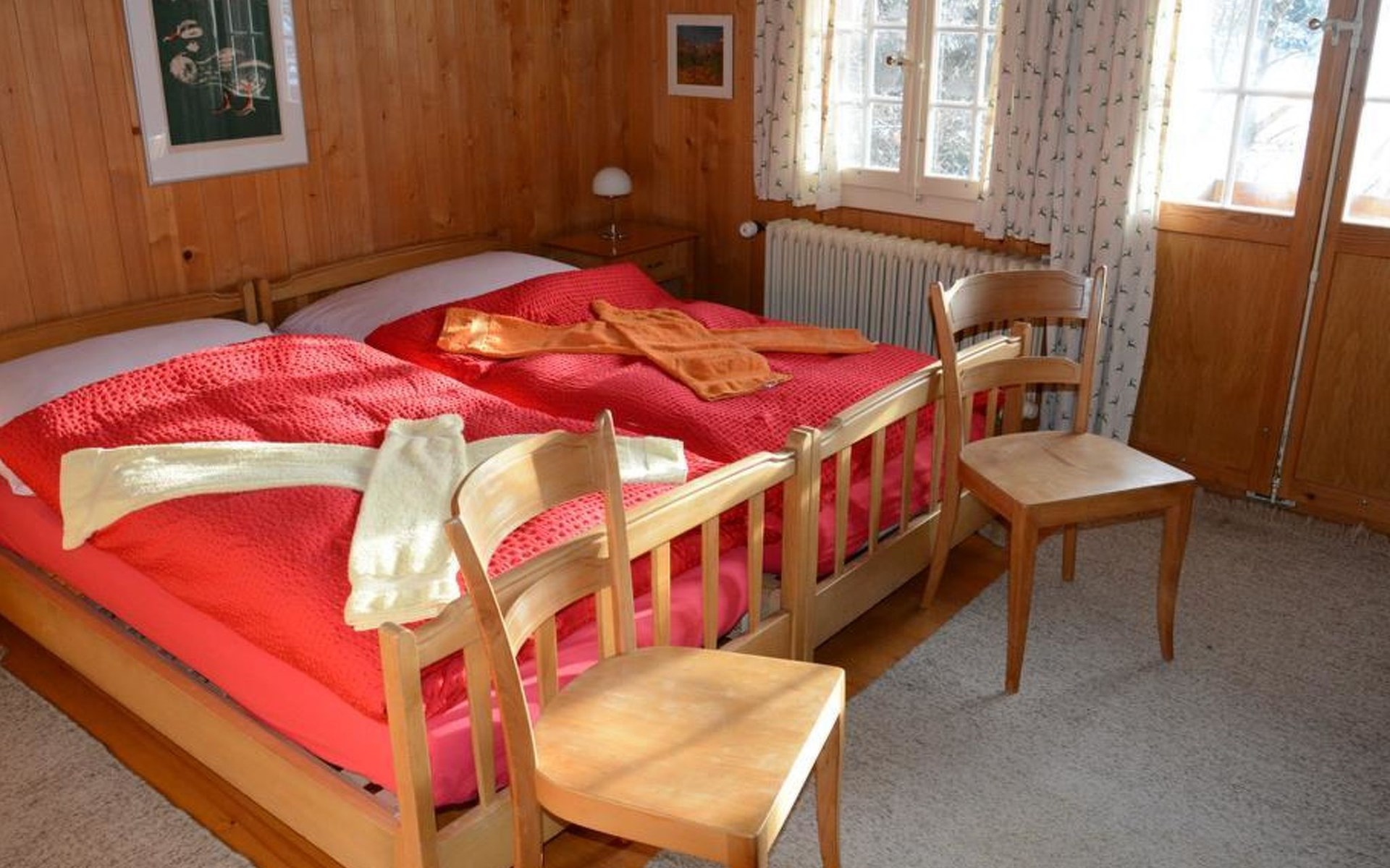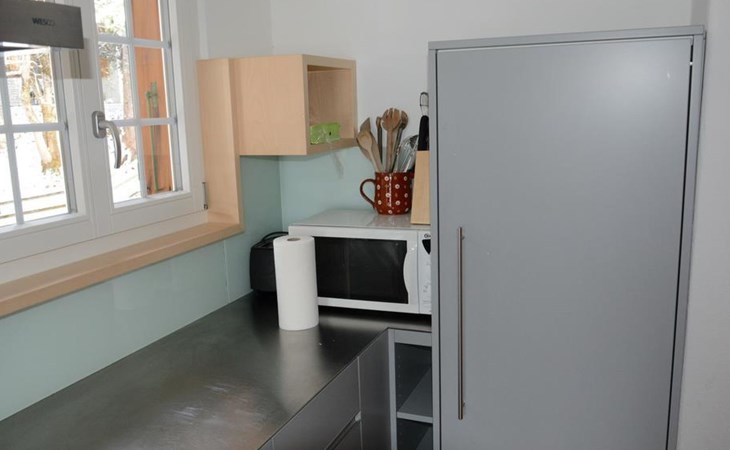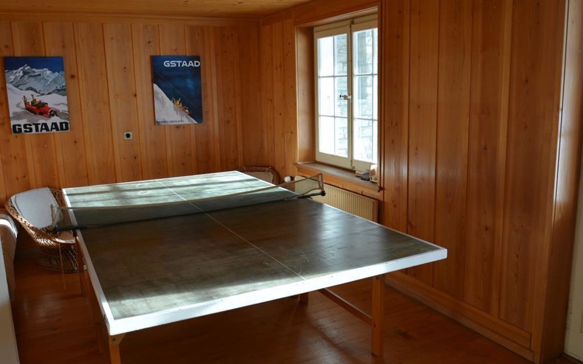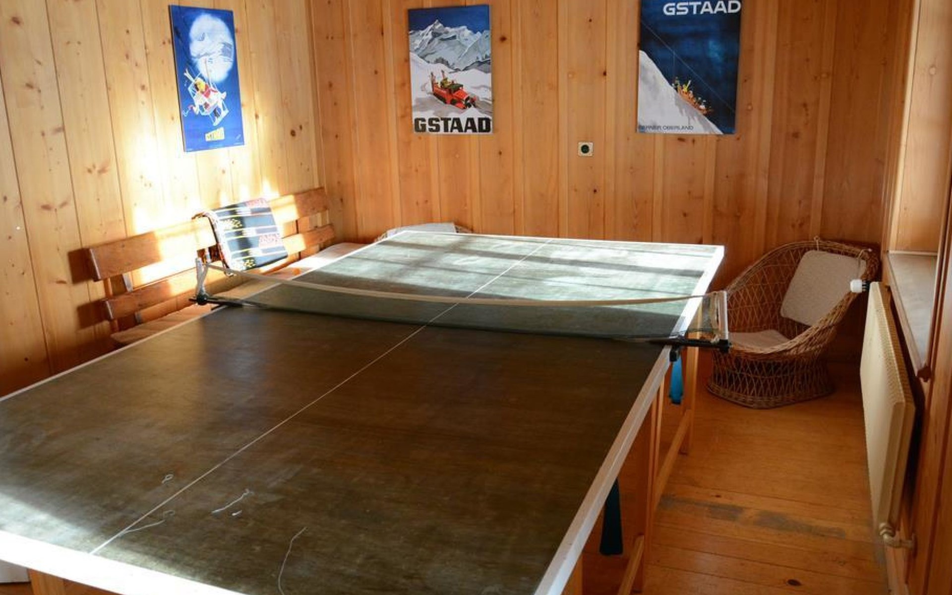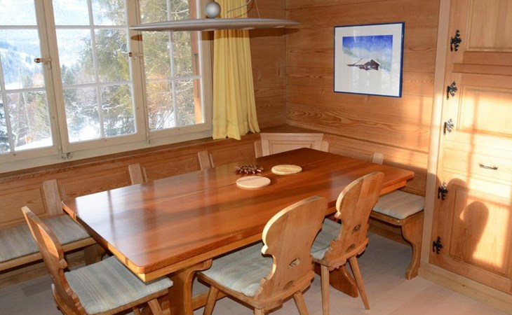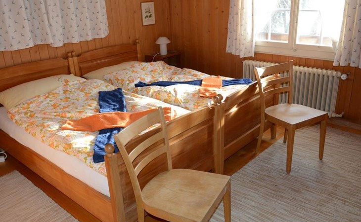 Gemütliches Holz-Chalet auf 3 Etagen. Erdgeschoss: Spielzimmer mit Tischtennistisch. Waschmaschine und Wäschetrockner. 1. Stock: Ess-/Wohnzimmer mit Sitzgruppe, Radio, TV, Balkon. Ältere Küche u.a. ausgestattet mit Mikrowelle, Geschirrspüler, Kühlschrank mit Gefrierfach, Kaffeevollautomat, Fondue- und Raclette-Set sowie Durchreiche ins Ess-/Wohnzimmer. 1 kleineres Schlafzimmer mit Doppelbett (2x90x200cm). Bad, WC. 2. Stock: 1 kleines Schlafzimmer mit Einzelbett (90x200cm) und Lavabo. 2 Schlafzimmer mit Doppelbett (2x90x200cm), Lavabo und Balkon. Dusche/WC. WiFi.