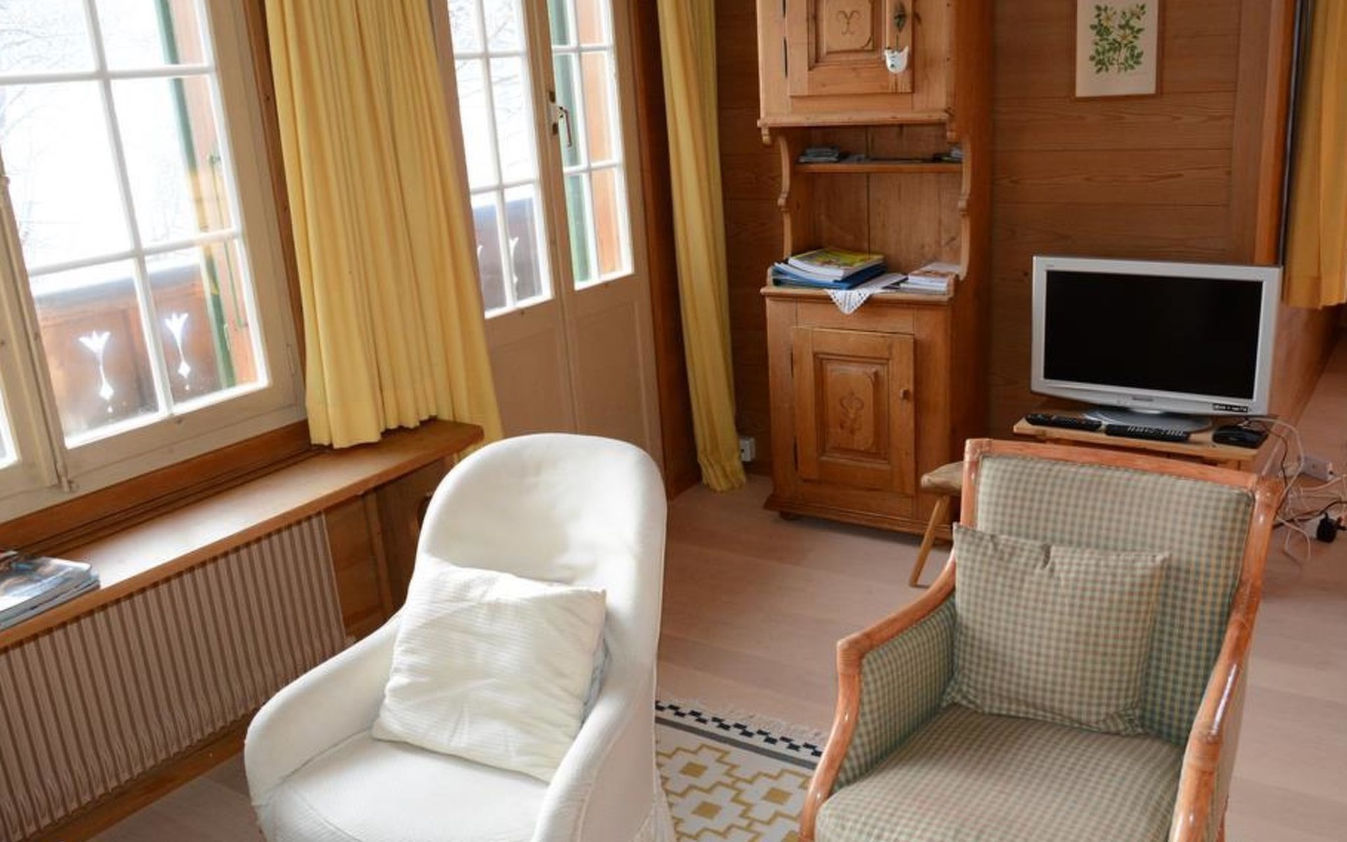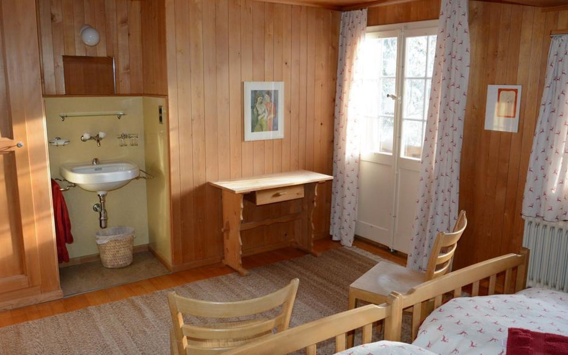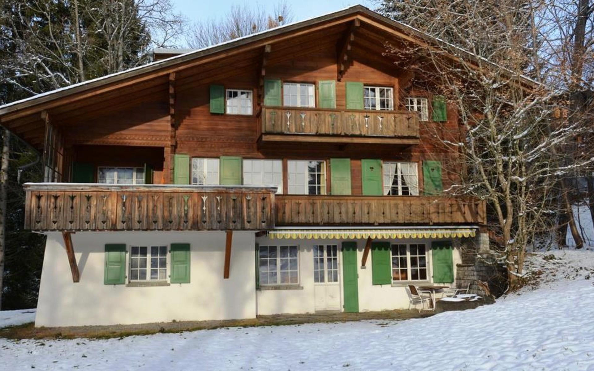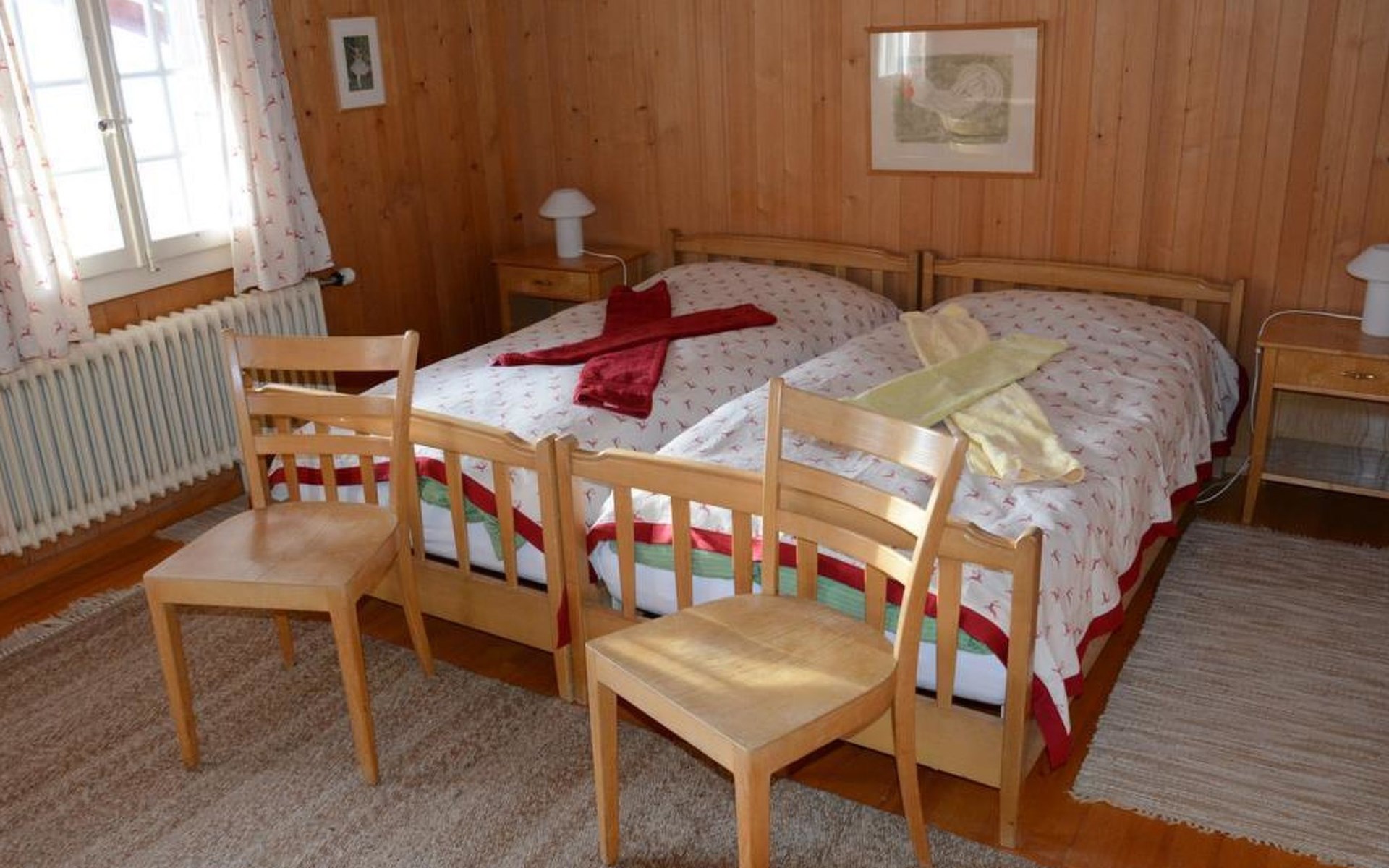 Gemütliches Holz-Chalet auf 3 Etagen. Erdgeschoss: Spielzimmer mit Tischtennistisch. Waschmaschine und Wäschetrockner. 1. Stock: Ess-/Wohnzimmer mit Sitzgruppe, Radio, TV, Balkon. Ältere Küche u.a. ausgestattet mit Mikrowelle, Geschirrspüler, Kühlschrank mit Gefrierfach, Kaffeevollautomat, Fondue- und Raclette-Set sowie Durchreiche ins Ess-/Wohnzimmer. 1 kleineres Schlafzimmer mit Doppelbett (2x90x200cm). Bad, WC. 2. Stock: 1 kleines Schlafzimmer mit Einzelbett (90x200cm) und Lavabo. 2 Schlafzimmer mit Doppelbett (2x90x200cm), Lavabo und Balkon. Dusche/WC. WiFi.
