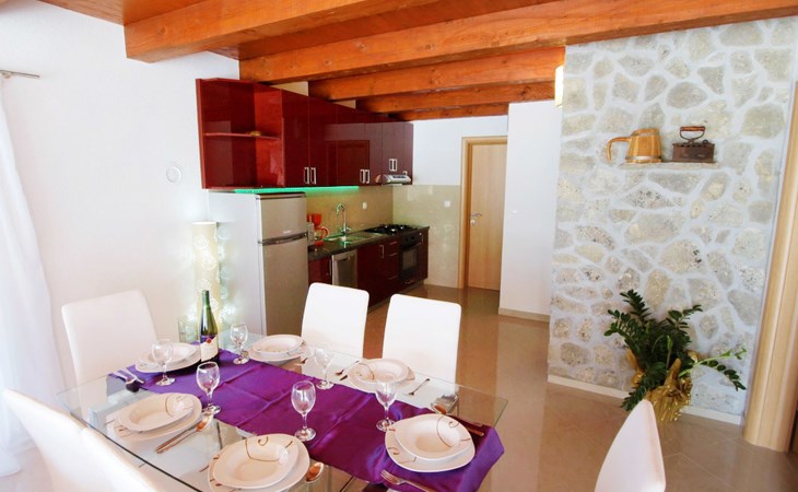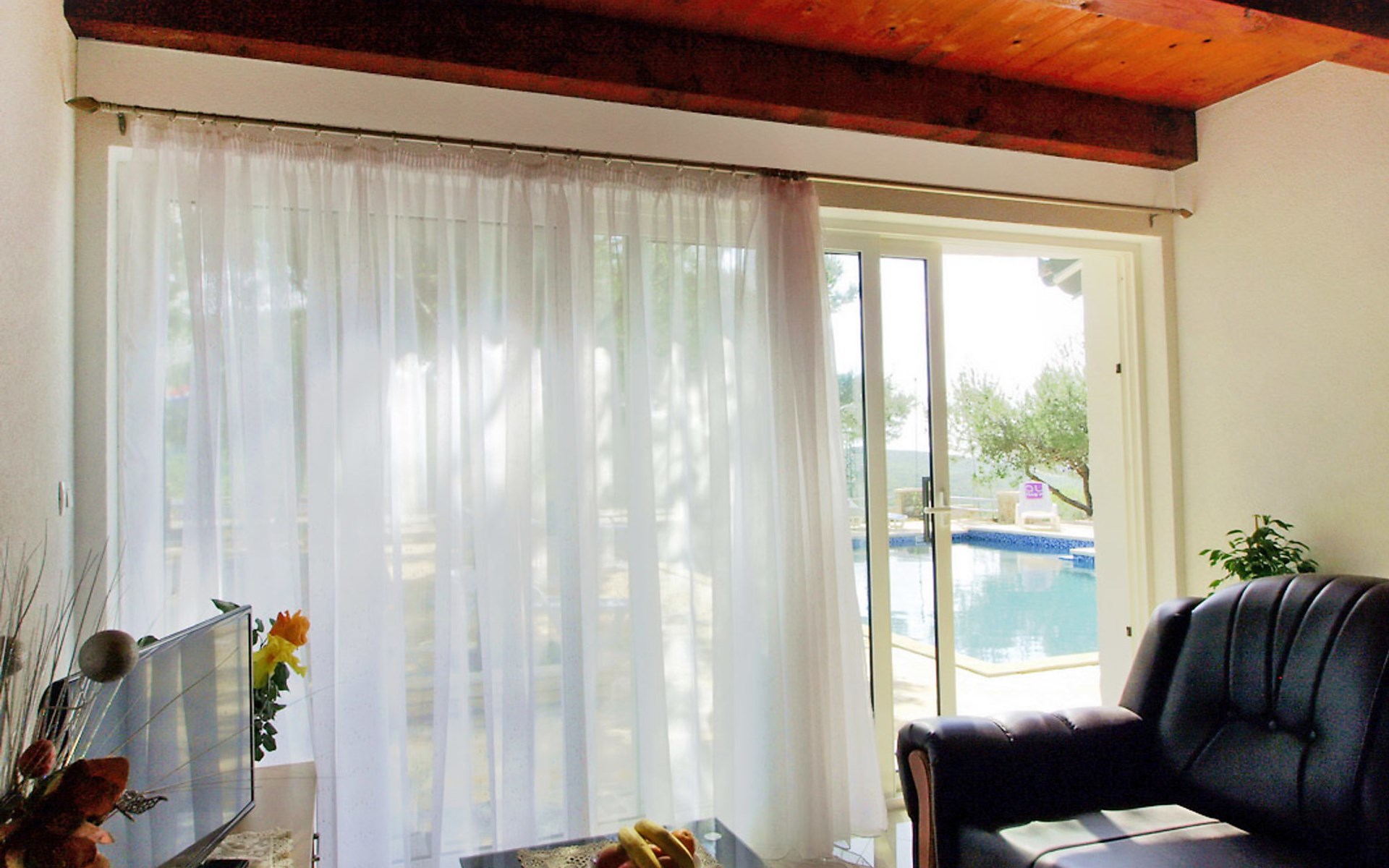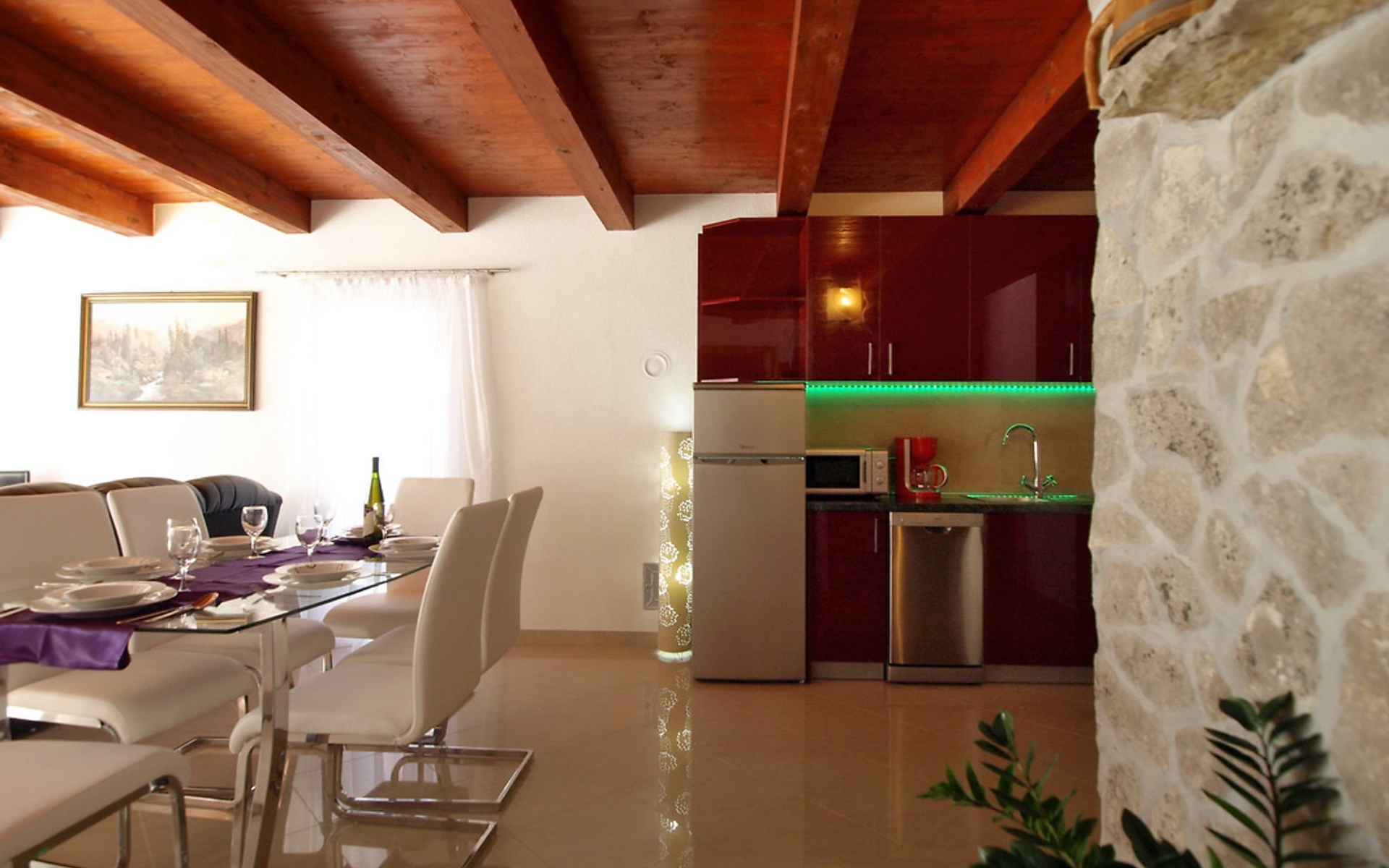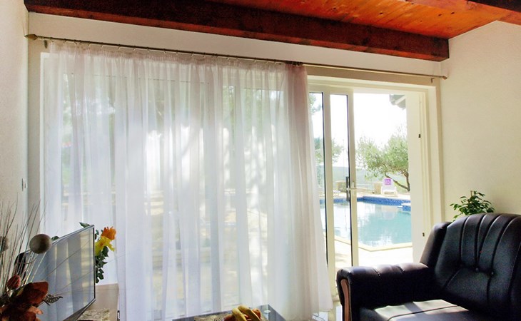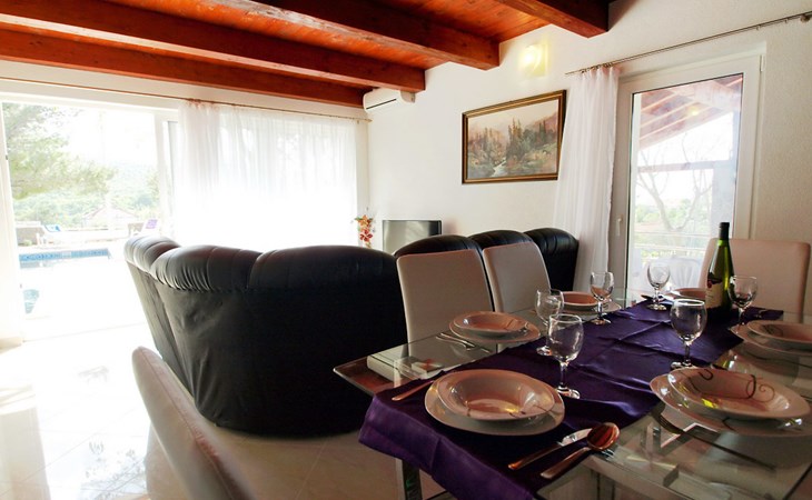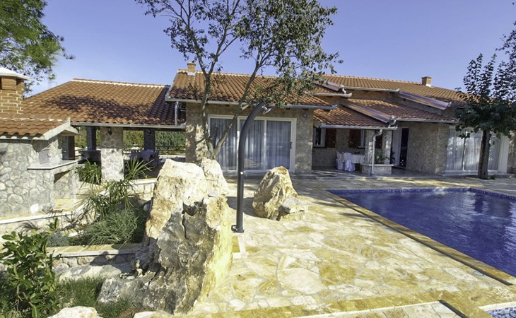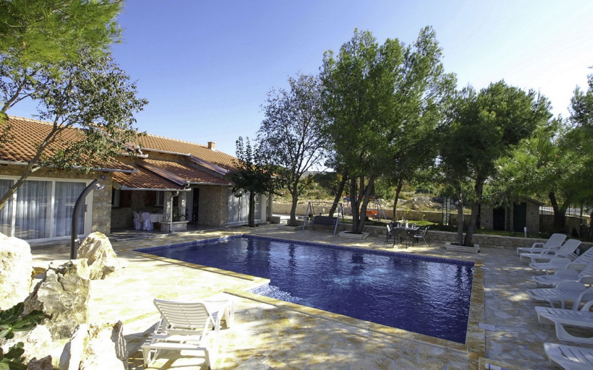 Die Wohneinheit besteht aus 2 Wohnungen, die aber zusammen vermietet werden. Einfamilienhaus "Villa Sandra". Im Ortszentrum von Kruševo, 10 km vom Zentrum von Obrovac, sonnige Lage am Hang, 5 km vom Meer, im Grünen. Zur Alleinbenutzung: Grundstück 1'000 m2, Garten, Schwimmbad (10 x 6 m, 63 m2, 140 cm tief, saisonale Verfügbarkeit: 09.Mai. - 19.Sep.) mit Innentreppe. Aussendusche, Grill, Kinderspielplatz. Im Hause: Internetzugang, Waschmaschine. Abholservice vom Flughafen (extra). Parkplatz beim Haus auf dem Grundstück. Einkaufsgeschäft 100 m, Restaurant 4.5 km, Bushaltestelle 23.2 km, Kieselstrand 5 km. Nahe gelegene Sehenswürdigkeiten: Rafting Zrmanja 10 km. Jugendgruppen nur auf Anfrage.