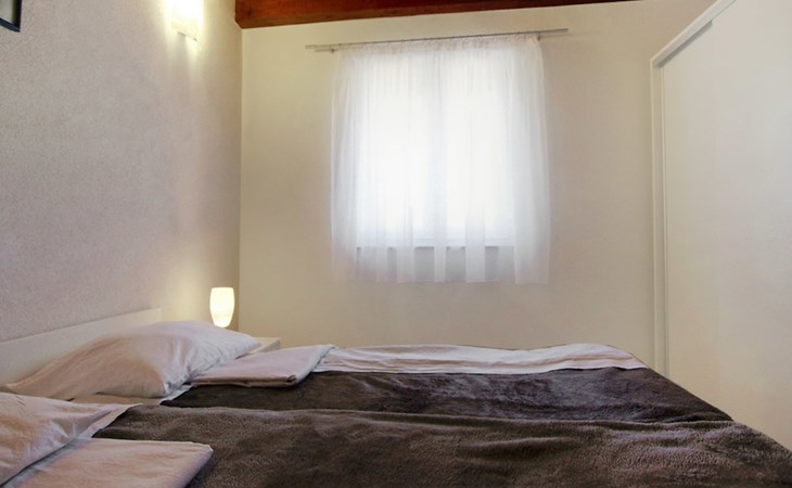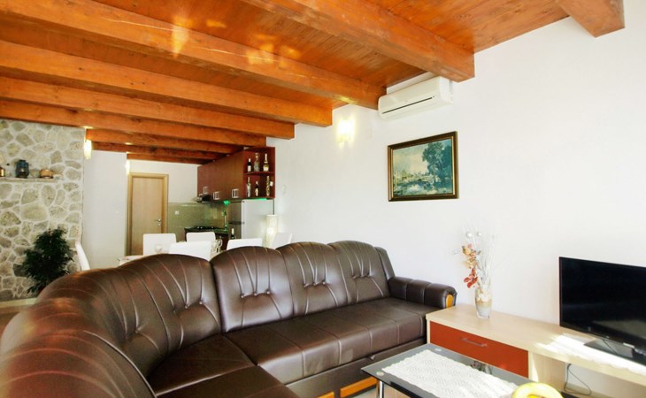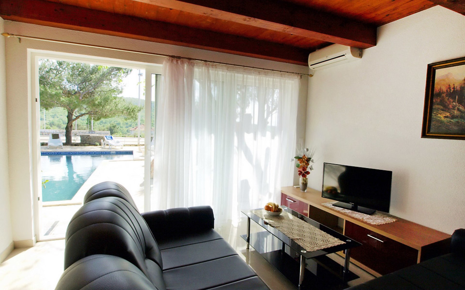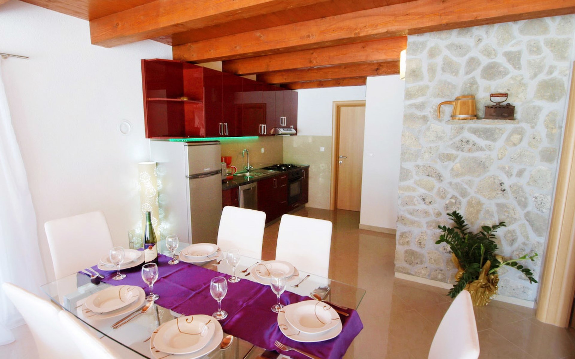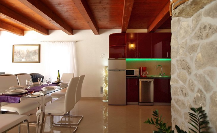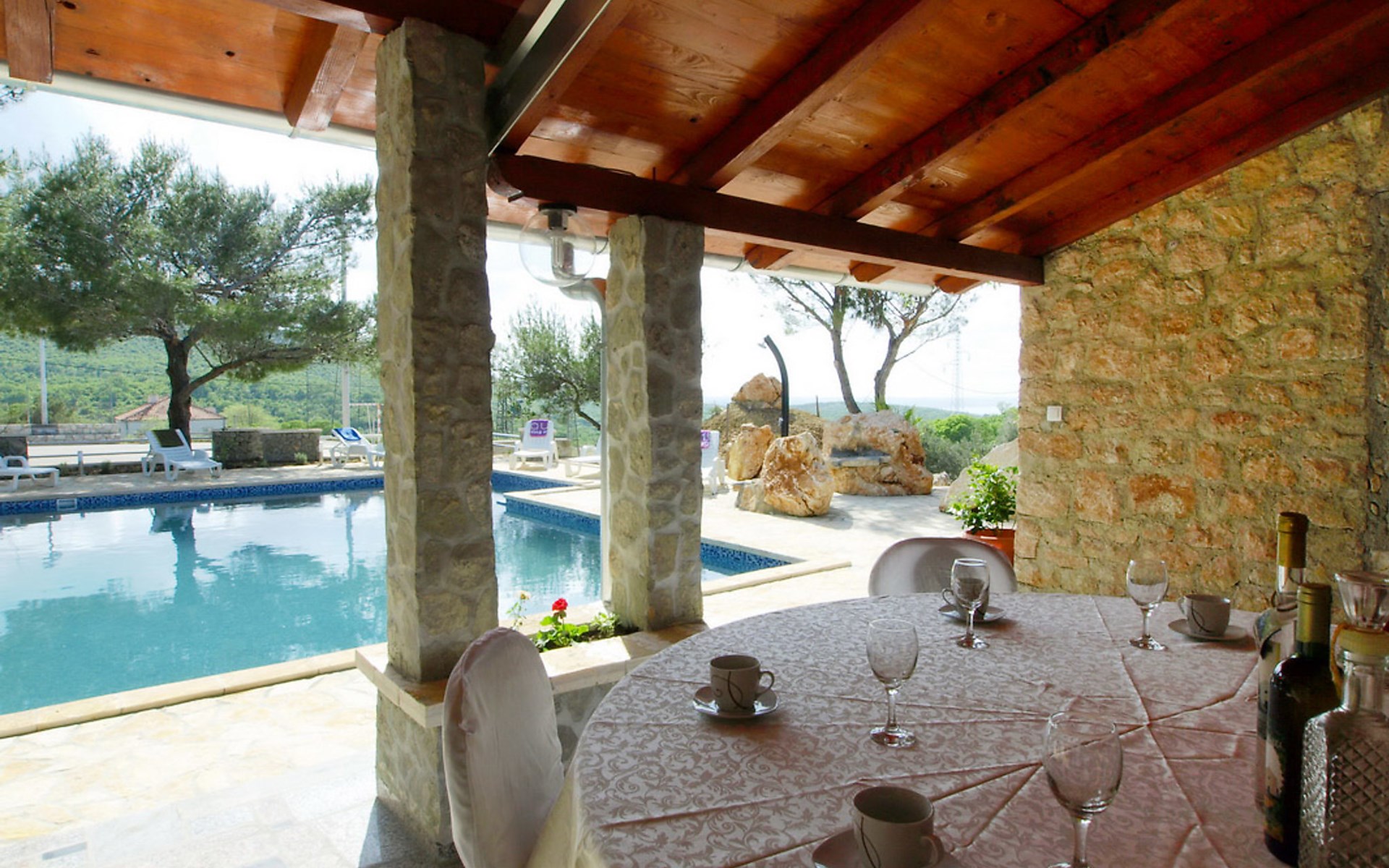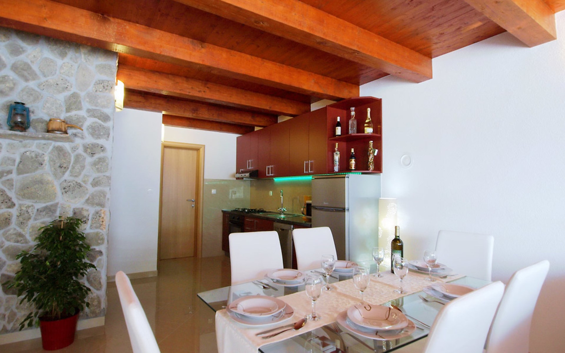Die Wohneinheit besteht aus 2 Wohnungen, die aber zusammen vermietet werden. Einfamilienhaus "Villa Sandra". Im Ortszentrum von Kruševo, 10 km vom Zentrum von Obrovac, sonnige Lage am Hang, 5 km vom Meer, im Grünen. Zur Alleinbenutzung: Grundstück 1'000 m2, Garten, Schwimmbad (10 x 6 m, 63 m2, 140 cm tief, saisonale Verfügbarkeit: 09.Mai. - 19.Sep.) mit Innentreppe. Aussendusche, Grill, Kinderspielplatz. Im Hause: Internetzugang, Waschmaschine. Abholservice vom Flughafen (extra). Parkplatz beim Haus auf dem Grundstück. Einkaufsgeschäft 100 m, Restaurant 4.5 km, Bushaltestelle 23.2 km, Kieselstrand 5 km. Nahe gelegene Sehenswürdigkeiten: Rafting Zrmanja 10 km. Jugendgruppen nur auf Anfrage.