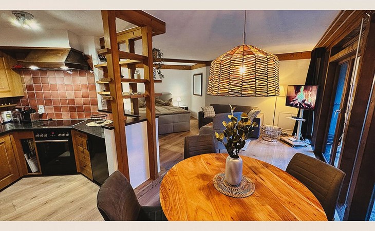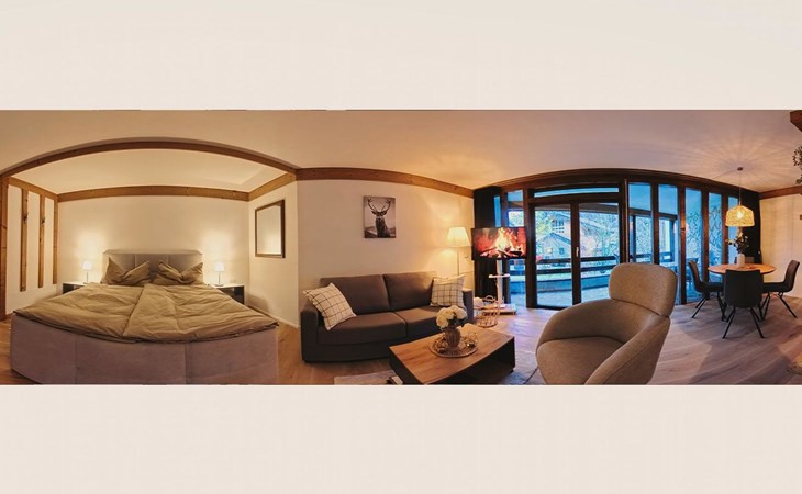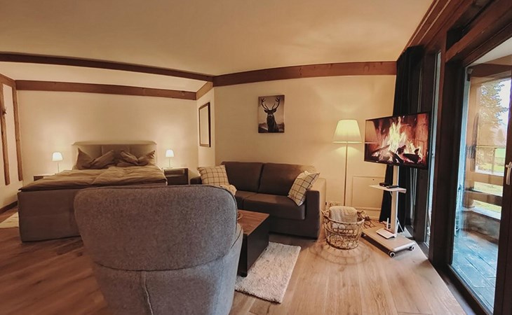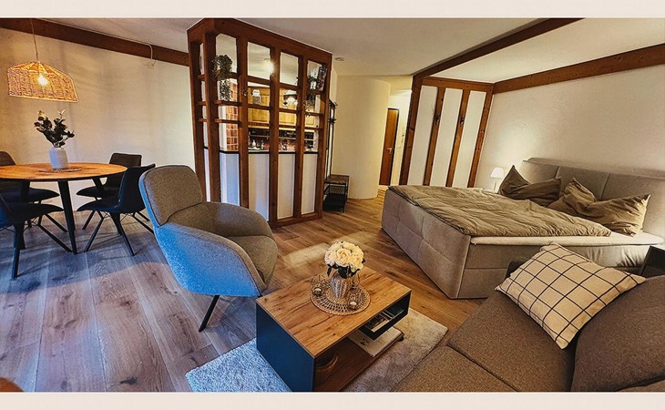 1-Zimmerwohnung, Erdgeschoss: Wohn-Schlafzimmer mit 1 Doppelbett, Essecke, Küche, Dusche/WC.