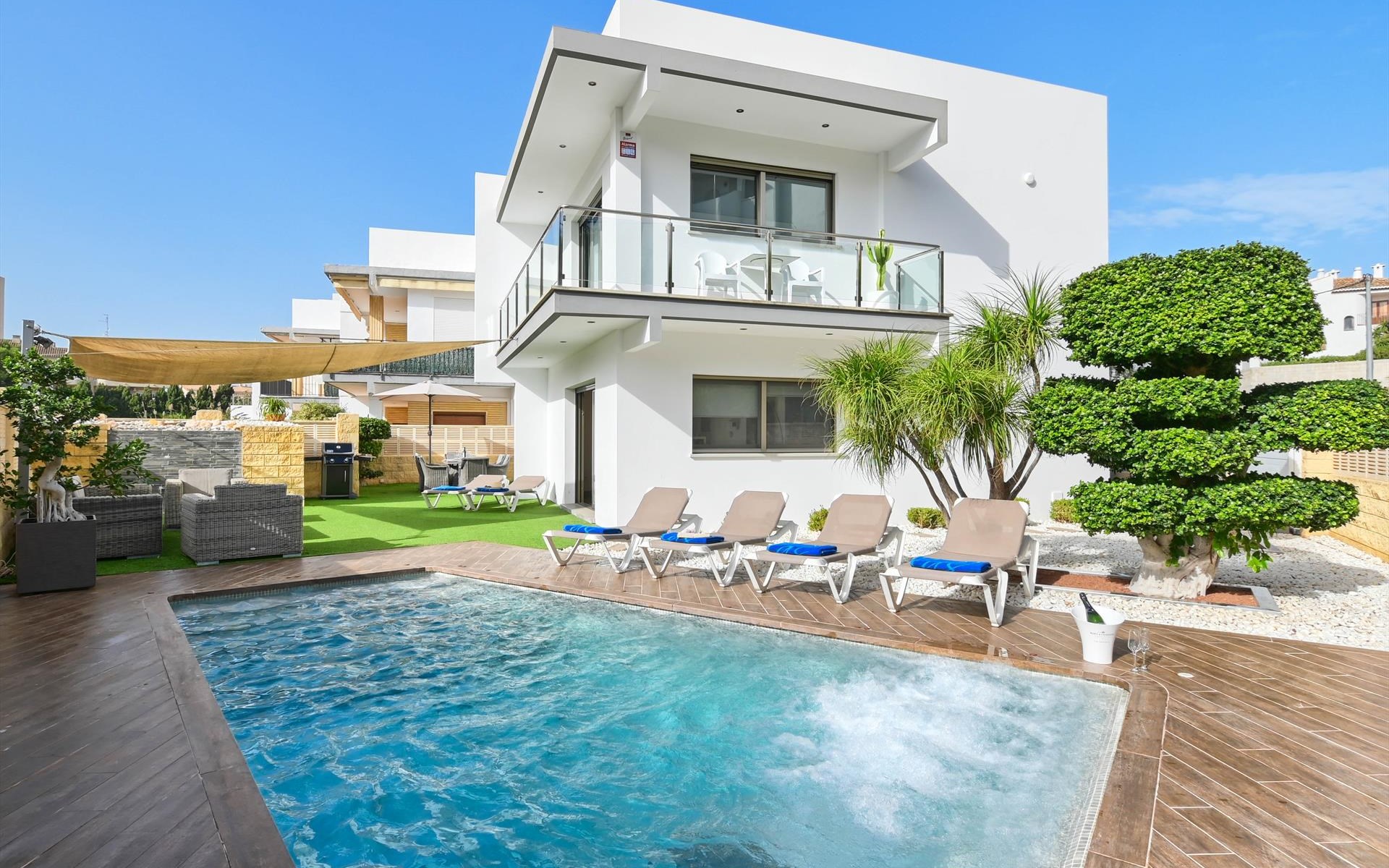 Wunderschöne und luxuriöse Villa in Jávea, Costa Blanca, Spanien mit privatem Pool für 10 Personen. Das Haus befindet sich in einem Wohnviertel am Strand, in der Nähe von Restaurants, Bars, Geschäften und Supermärkten, nur 100 m vom Strand El Arenal, Jávea und 0,1 km vom Mittelmeer, Jávea entfernt.