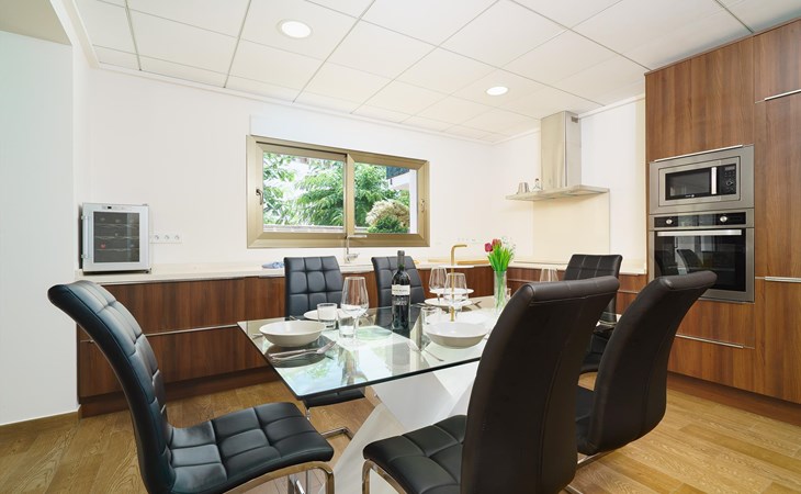 - 2 offene Küchen mit Elektroherd, Elektrobackofen, Mikrowelle, Geschirrspüler, Kühlschrank, Gefrierschrank, Kaffeemaschine, Wasserkocher, Mixer, Toaster und Entsafter