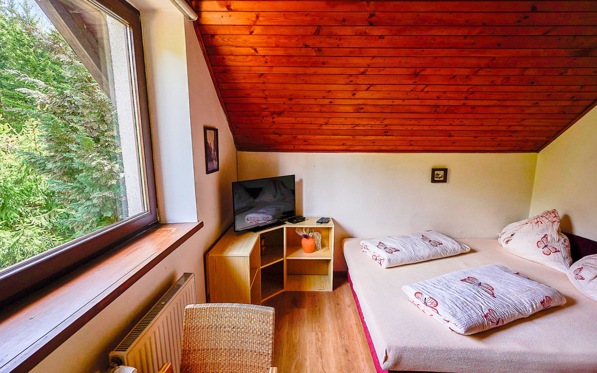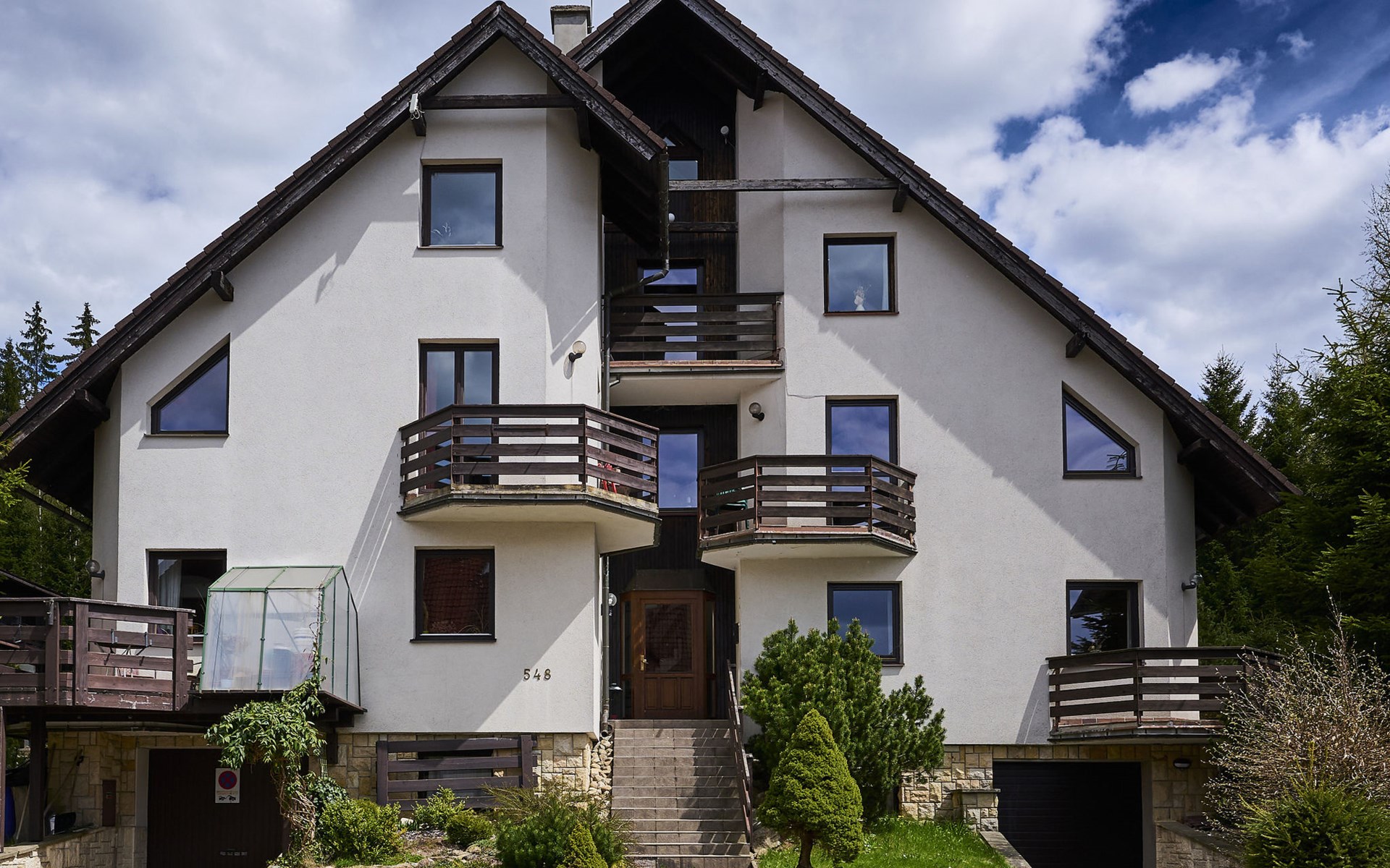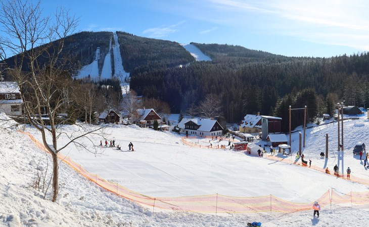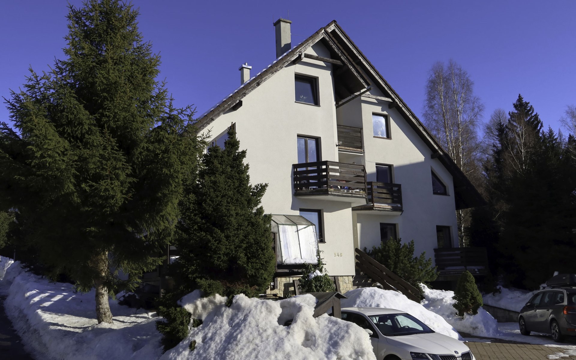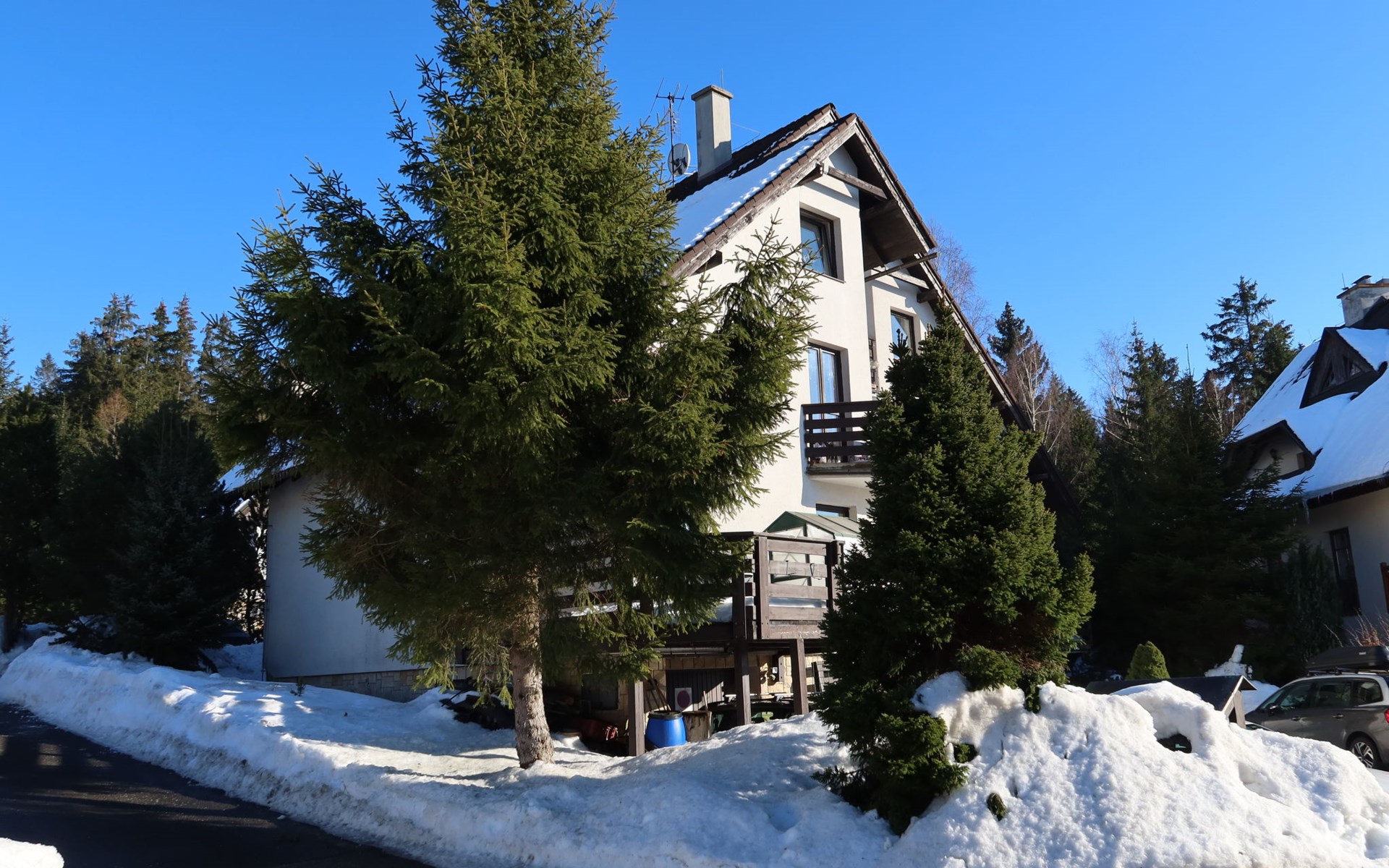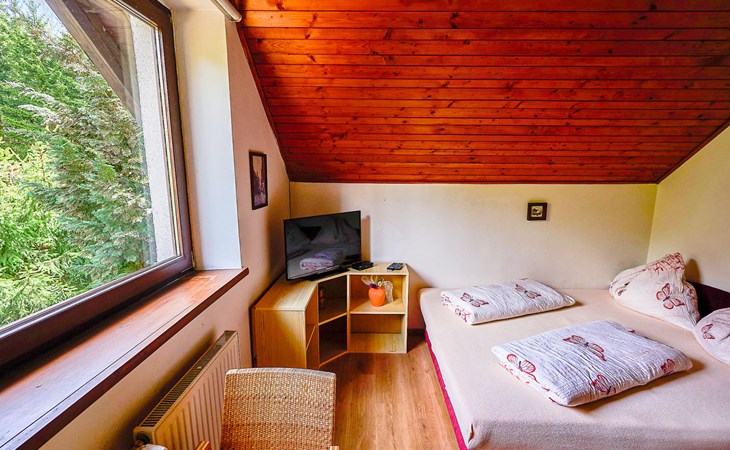 Gemütliches, freistehendes Appartementhaus auf 3 Stockwerken, Baujahr 2000, umgeben von Bäumen. 3 Wohnungen in der Residenz. Im Ortsteil Klondajk, zentrale, ruhige Lage, 1 km vom Skigebiet. Zur Mitbenutzung: Garten. Im Hause: Zentralheizung. Parkplatz (für 8 Autos) beim Haus. Einkaufsgeschäft 200 m, Einkaufszentrum 10 m, Bäckerei 10 m, Fußgängerzone, Bushaltestelle "Harrachov, U sklárny" 800 m, Bahnstation "Harrachov, Mýtiny" 2 km, Freibad 1 km. Tennis 1 km, Wanderwege ab Haus 10 m, Radweg 100 m, Skilift 700 m, Skiverleih 700 m, Skischule, Kinderskischule. Nahe gelegene Sehenswürdigkeiten: Bobová dráha 1 km, Sklárna Novosad a syn 500 m, Mumlavský vodopád 2 km, Terenní tříkolky Hilbert+ lyžařský vlek 700 m, Skokanské můstky 1.3 km, Polsko - vodopád 6.6 km. Bekannte Skigebiete sind gut erreichbar: Harrachov 1 km, Rokytnice nad Jizerou 14 km, Rejdice, Tanvaldský Špičák, Paseky n/J. Bekannte Seen in der Umgebung sind gut erreichbar: Jablonecká přehrada 30 km. Wandergebiete: Western City(Pl) 40 km, Karpacz Wang,Park miniatury Kowary (Pl) 44 km, Giganteria Piechowice 23km, Dinopark(Pl) 15 km. Bitte beachten: kein Fahrstuhl vorhanden.