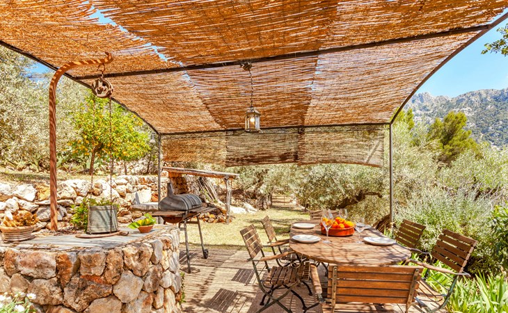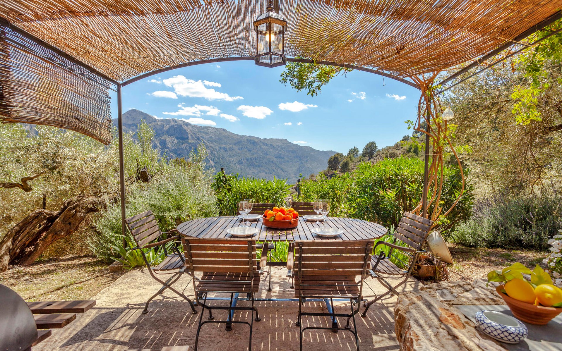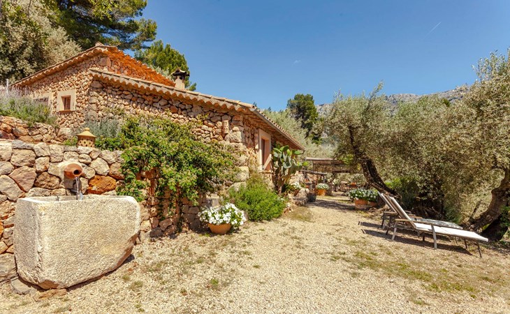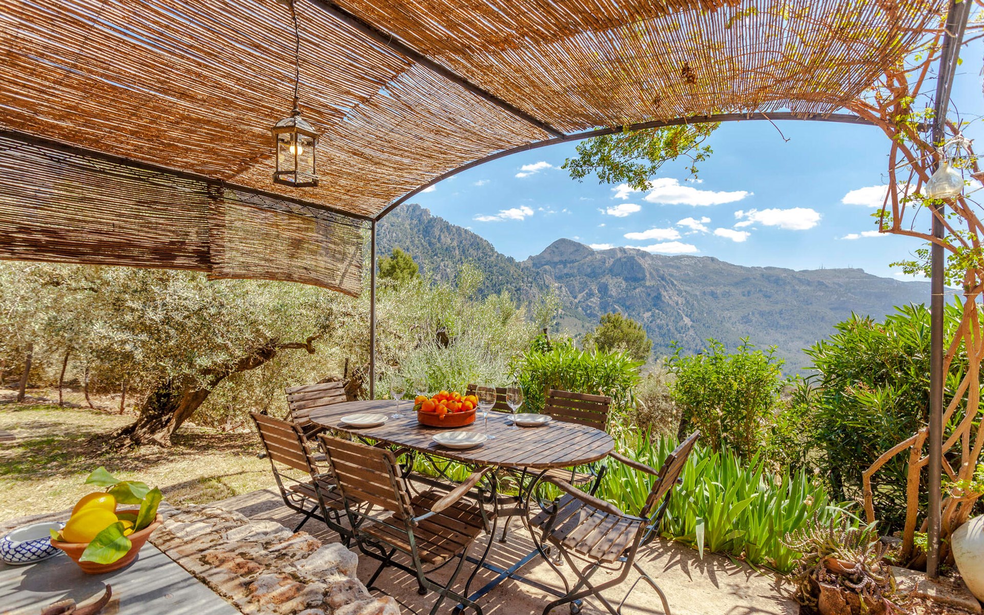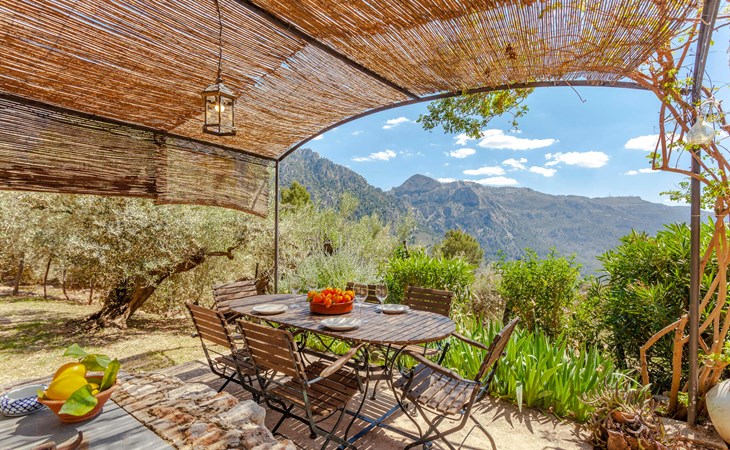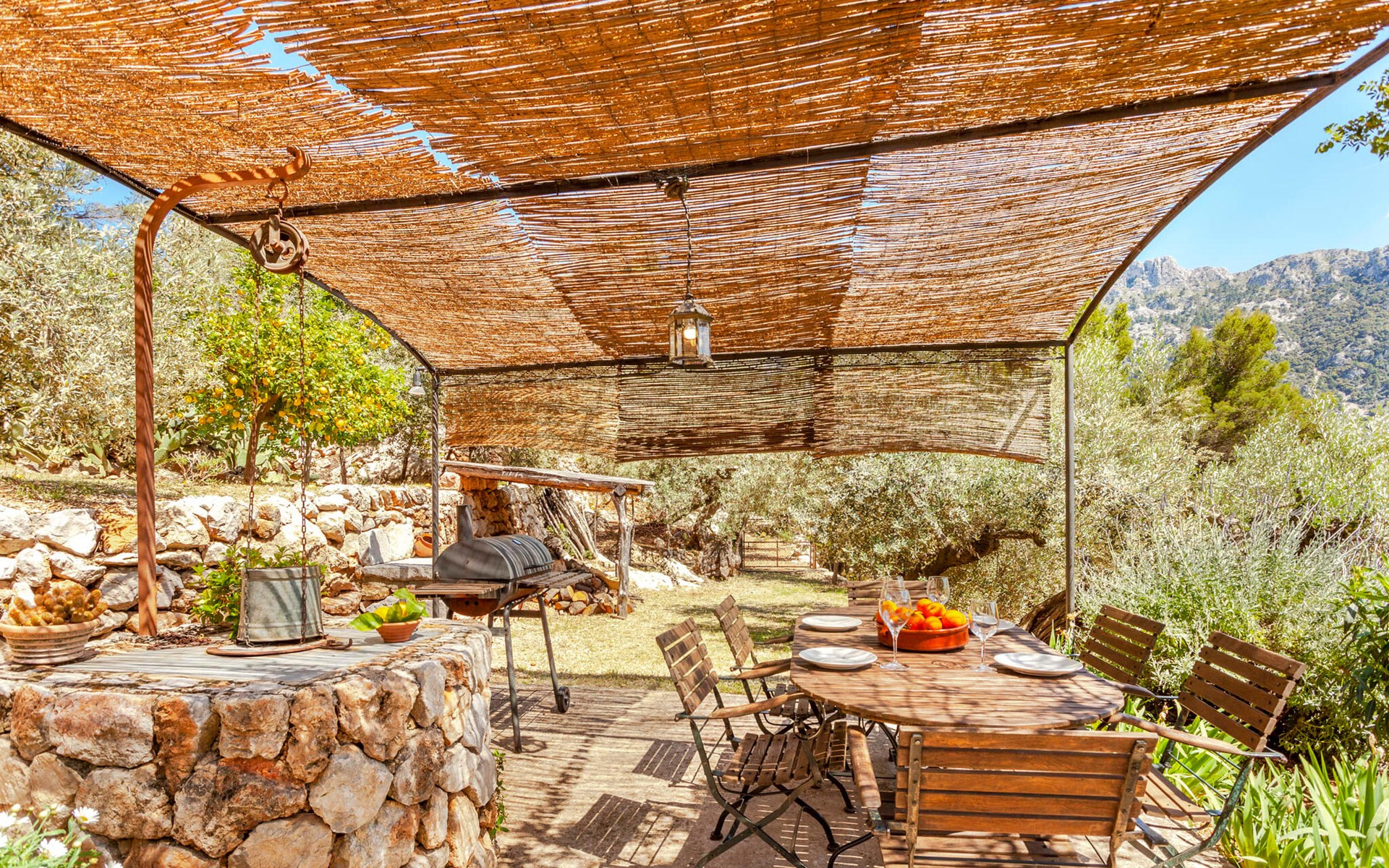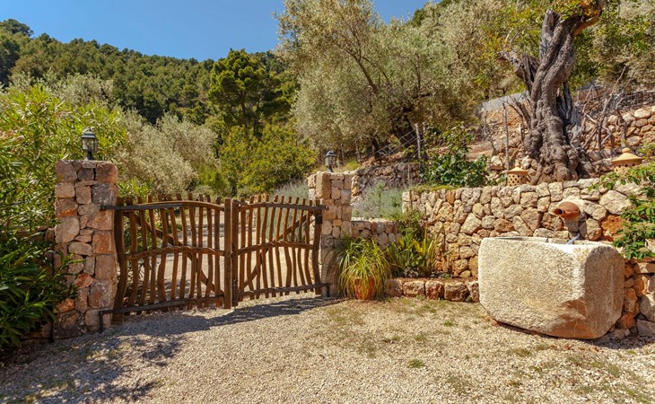 Diese kleine, hochgelegene Bergoase der Ruhe vermittelt einen zauberhaften Eindruck, eingebettet in die beeindruckende Kulisse des Tramuntana-Gebirges mit uriger Eleganz. Finden Sie Ihren Lieblingsplatz unter einem knorrigen Olivenbaum oder auf der luftigen, überdachten Terrasse und genießen Sie die Ruhe rund um dieses herrliche Plätzchen, den Ausblick auf das Tal, die Berge und Wälder in vollen Zügen. Lauschen Sie dem Vogelgezwitscher, erleben Sie die beruhigende Wirkung einer wildromantischen Kulisse, die Sie sonst nirgendwo finden werden. Die Natursteinmauern, die verstreuten Blumentöpfe und das urige Tor rahmen Ihr temporäres Schmuckstück malerisch ein und sorgen für ein wildromantisches Flair. Unter den Hängelampen neben dem Zierbrunnen wird es auf der Terrasse abends besonders üppig, vor allem, wenn Sie auf dem Grill ein paar mediterrane Köstlichkeiten zubereiten und diese dann beim Ausklingen des Tages genießen.