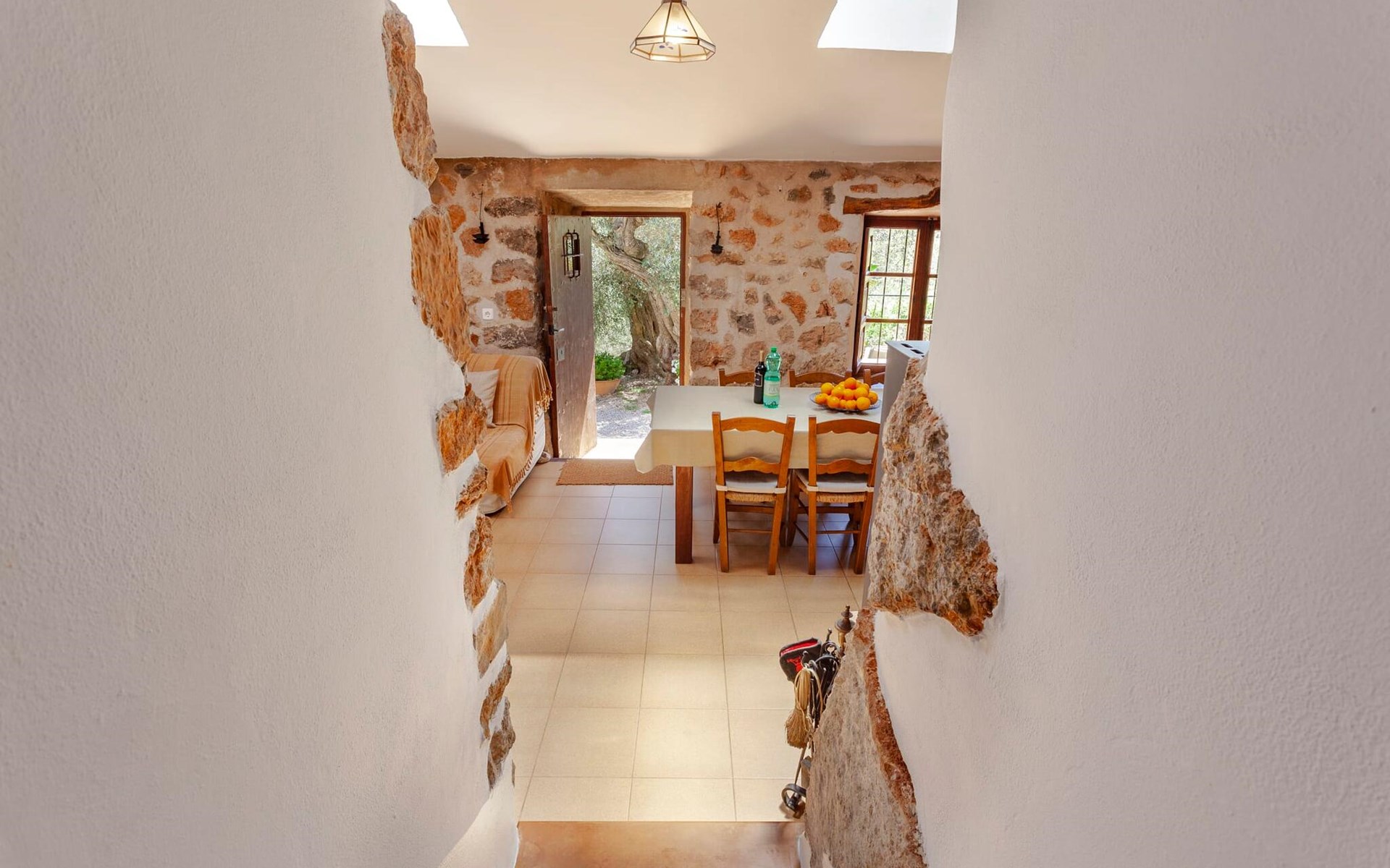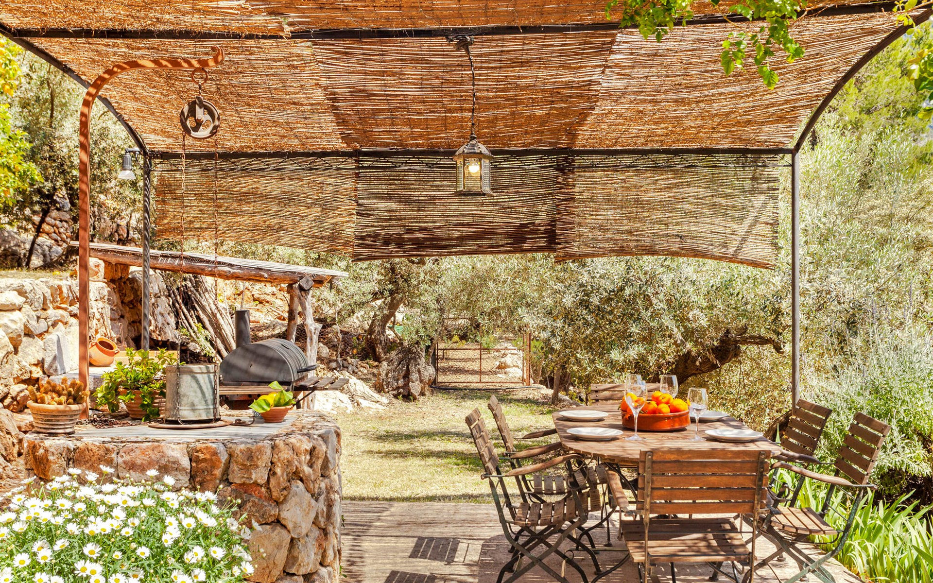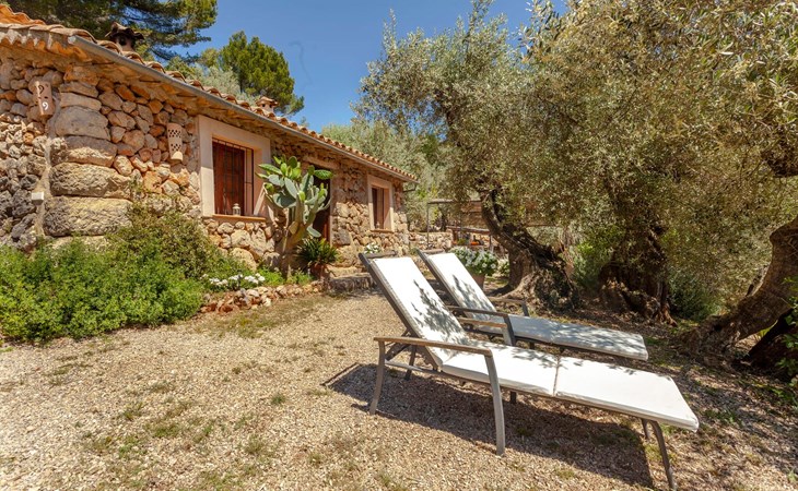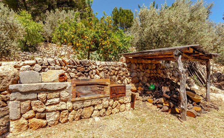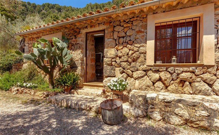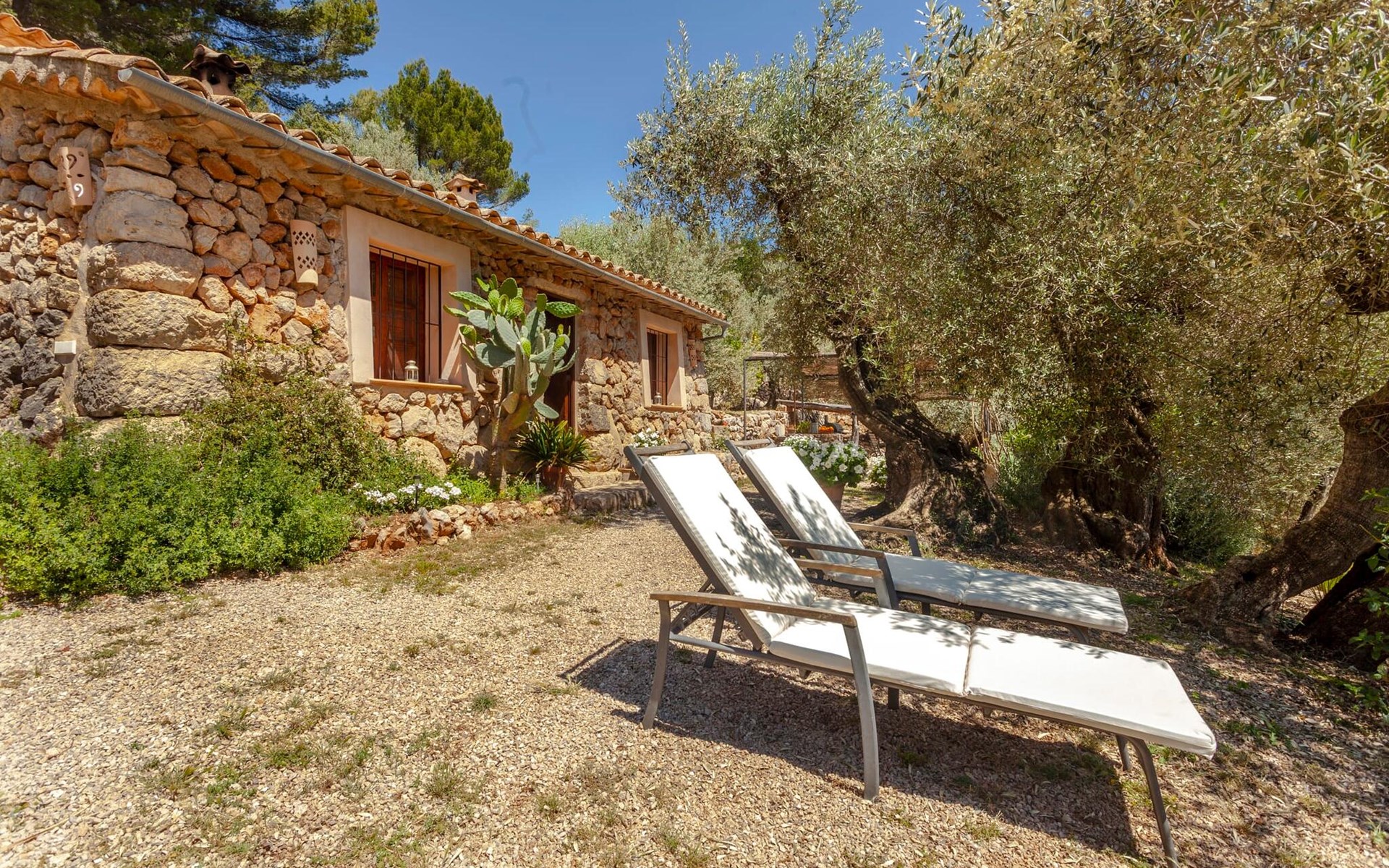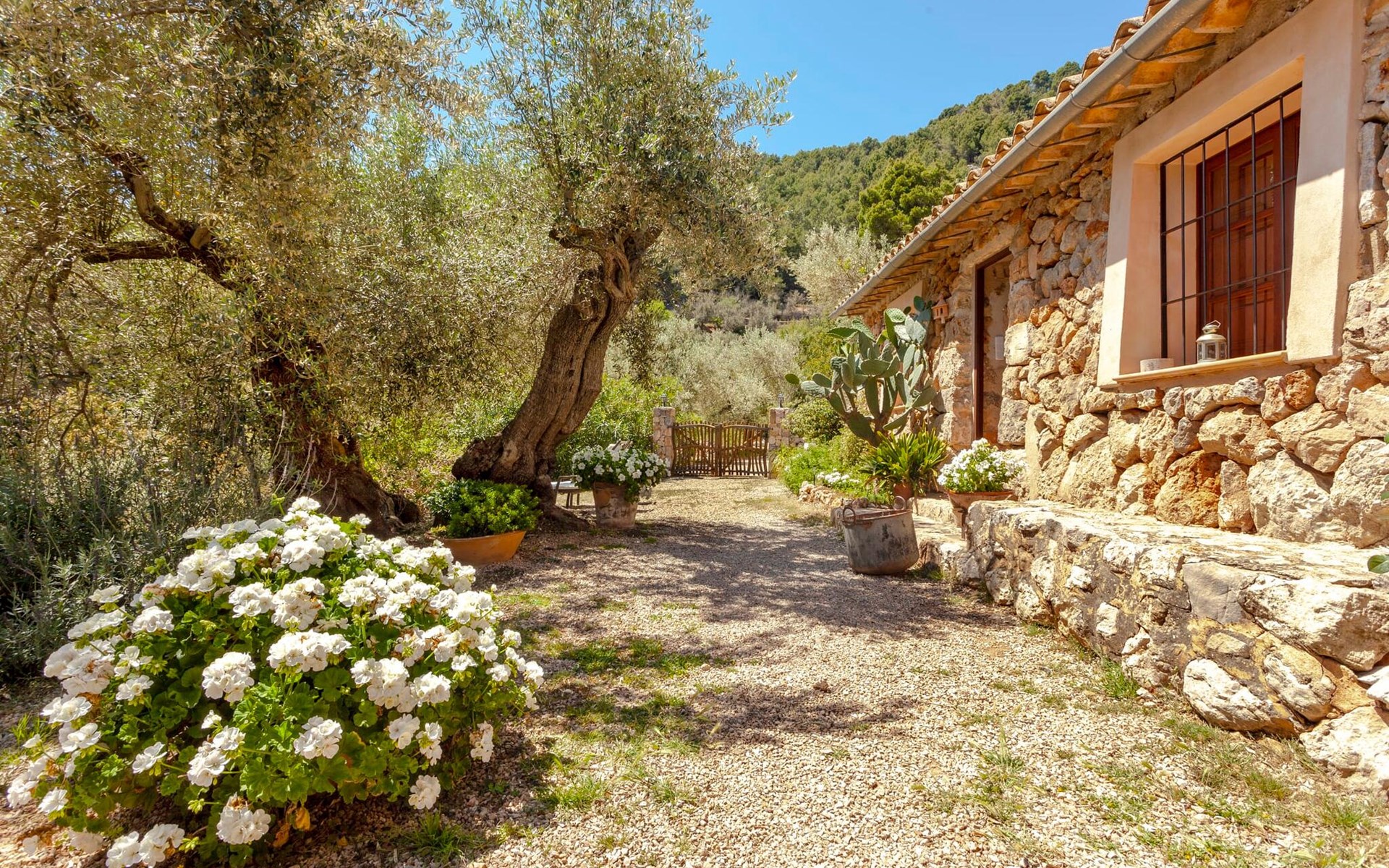 Diese kleine, hochgelegene Bergoase der Ruhe vermittelt einen zauberhaften Eindruck, eingebettet in die beeindruckende Kulisse des Tramuntana-Gebirges mit uriger Eleganz. Finden Sie Ihren Lieblingsplatz unter einem knorrigen Olivenbaum oder auf der luftigen, überdachten Terrasse und genießen Sie die Ruhe rund um dieses herrliche Plätzchen, den Ausblick auf das Tal, die Berge und Wälder in vollen Zügen. Lauschen Sie dem Vogelgezwitscher, erleben Sie die beruhigende Wirkung einer wildromantischen Kulisse, die Sie sonst nirgendwo finden werden. Die Natursteinmauern, die verstreuten Blumentöpfe und das urige Tor rahmen Ihr temporäres Schmuckstück malerisch ein und sorgen für ein wildromantisches Flair. Unter den Hängelampen neben dem Zierbrunnen wird es auf der Terrasse abends besonders üppig, vor allem, wenn Sie auf dem Grill ein paar mediterrane Köstlichkeiten zubereiten und diese dann beim Ausklingen des Tages genießen.