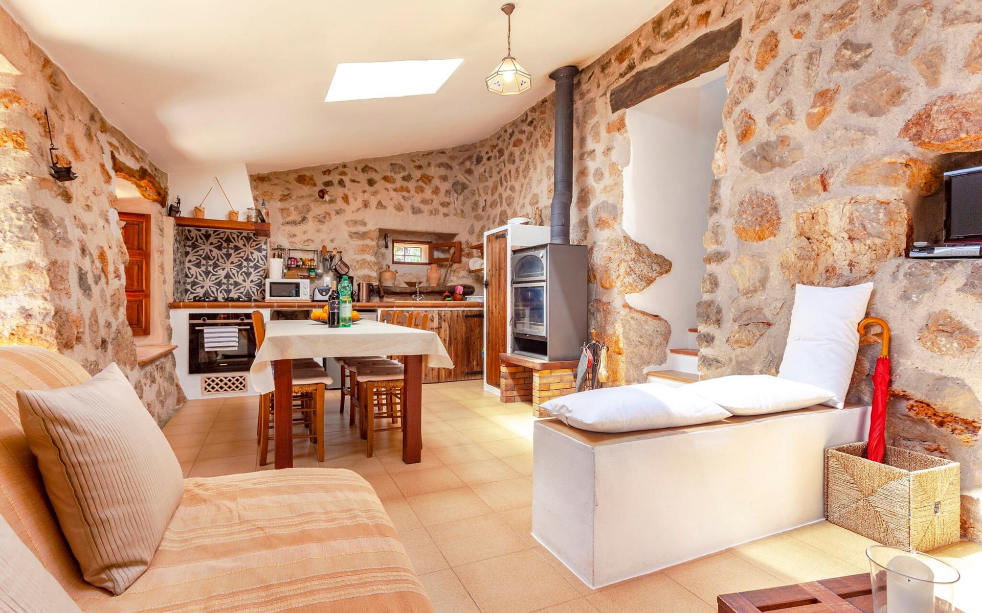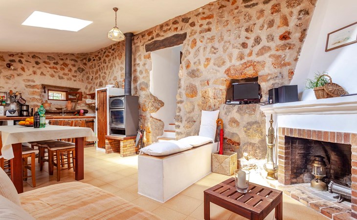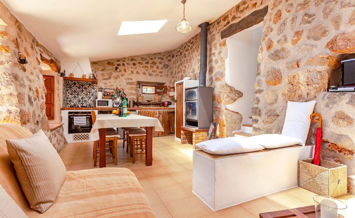 Auch in den Wohnräumen entdecken Sie authentisches Flair – mit viel Naturstein und Holz. Weiße Wände, Decken mit sichtbaren Balken, schöne große Bodenfliesen, urige Stufen und helle, sorgfältig aufeinander abgestimmte Stoffe bieten zeitgemäßen Komfort und bilden eine absolut wohltuende Harmonie. Die Natursteinwände sorgen zudem für eine optimale Temperaturregulierung. Die offene, rustikale Küche ist gut ausgestattet und der hier installierte Backofen wärmt nicht nur das Haus an kalten Tagen, sondern eignet sich auch hervorragend zum Zubereiten von Mahlzeiten (der offene Kamin ist zusätzlich eine hübsche Dekoration). Auf dem Sofa am anderen Ende des gemütlichen Zimmers können Sie entspannte Abende verbringen. Vom Wohn-/Esszimmer gelangen Sie über ein paar Stufen in das stilvolle Schlafzimmer, das mit zwei Doppelbetten ausgestattet ist; Das tageslichtdurchflutete Badezimmer mit dekorativem breiten Waschbecken und Dusche befindet sich direkt nebenan. Auch in diesem Raum wird die ansprechende Naturstein-Ästhetik fortgeführt.