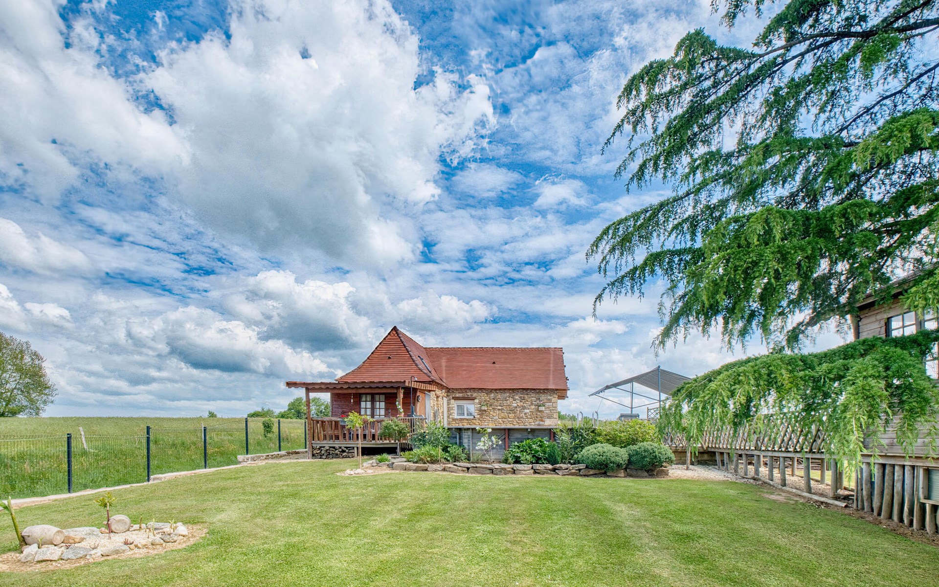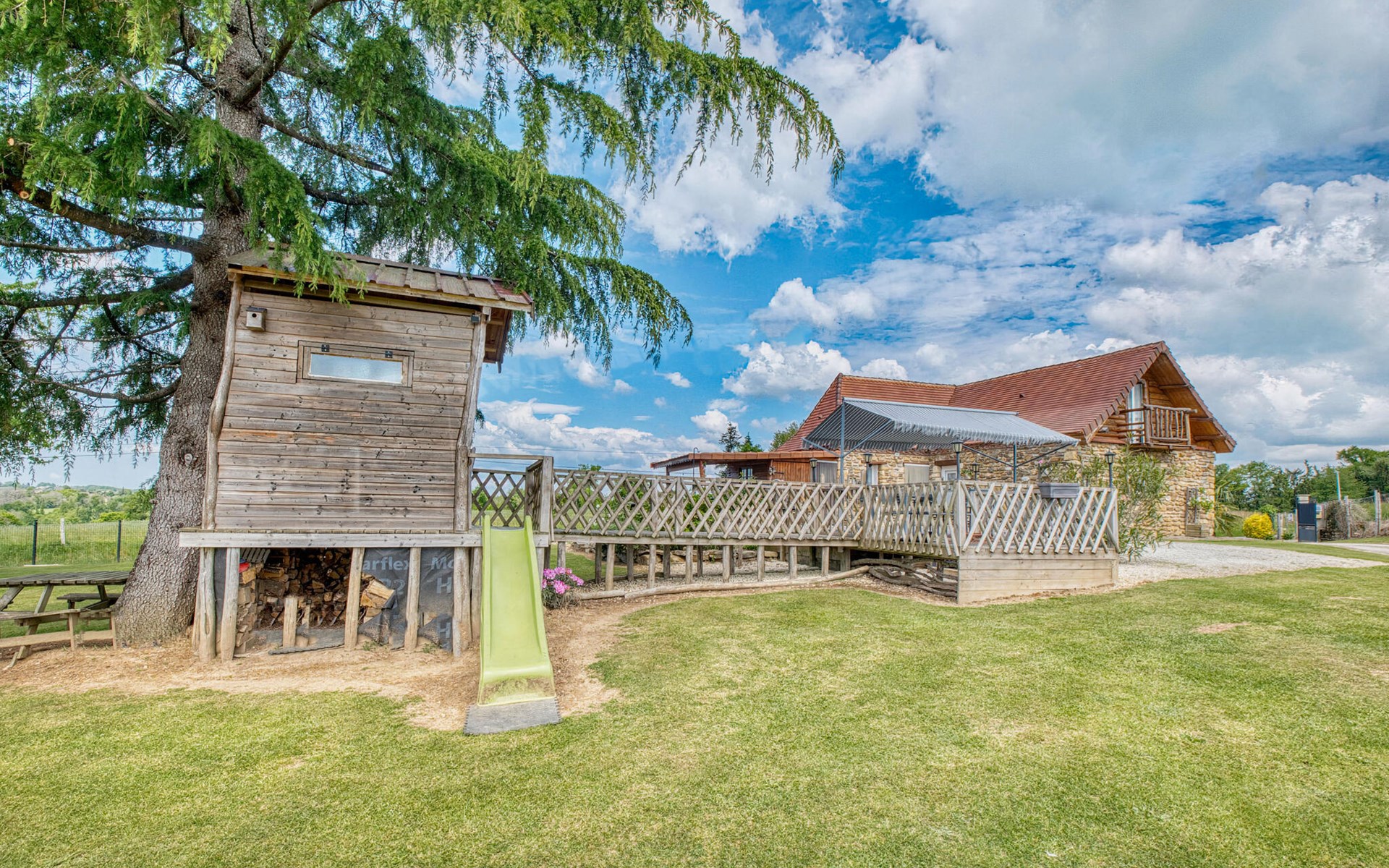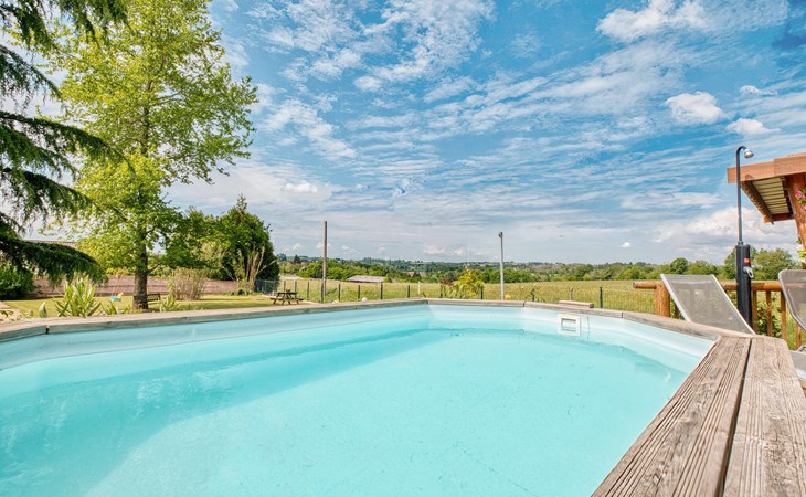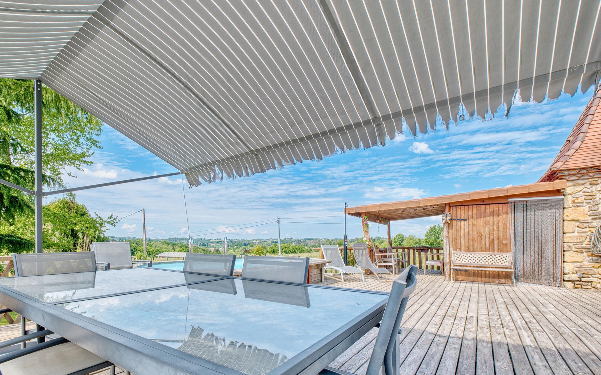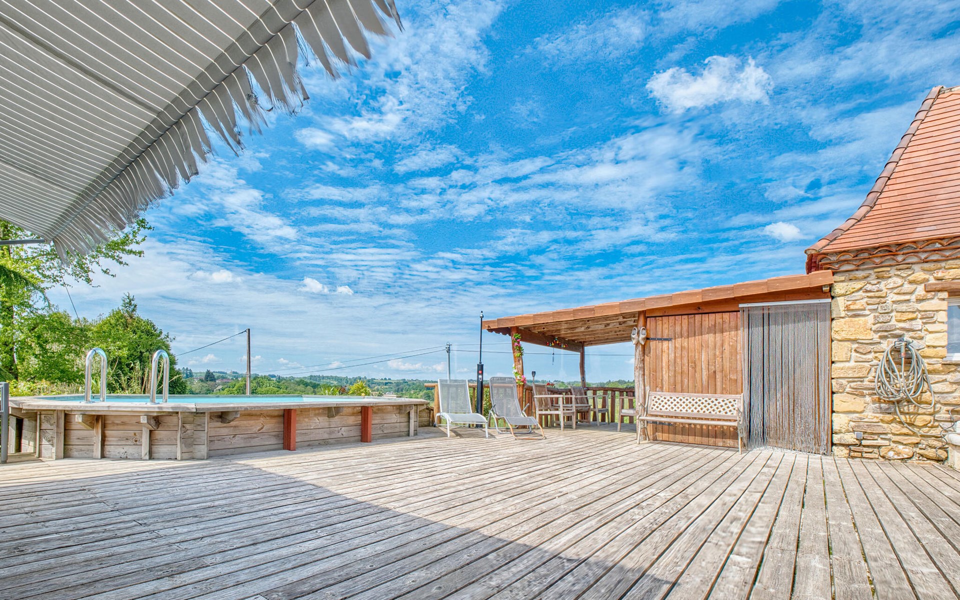 Nutzen Sie den Außenbereich für gesellige Stunden und Erholung. Schwimmen Sie im Pool mit Holzdeck, nehmen Sie Ihre Mahlzeiten im Schatten der Pergola ein oder entspannen Sie auf der Veranda mit weitem Blick über Felder und Hügel. Für Kinder gibt es ein Spielhaus, eine Rutsche, eine Wippe sowie eine Tischtennisplatte und ein Badmintonfeld. Die hölzerne Gartenbar lädt zu kühlen Getränken am Nachmittag ein.