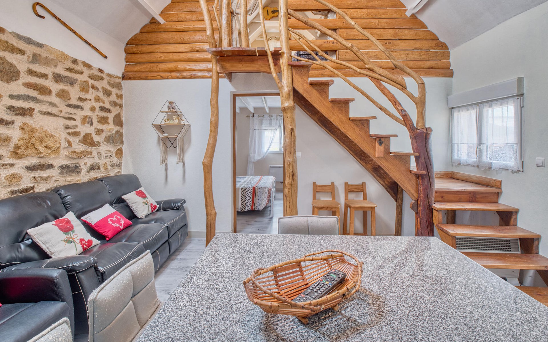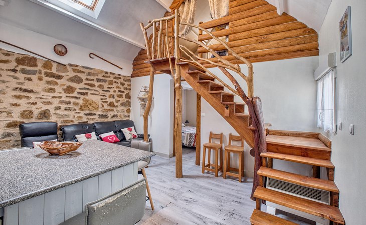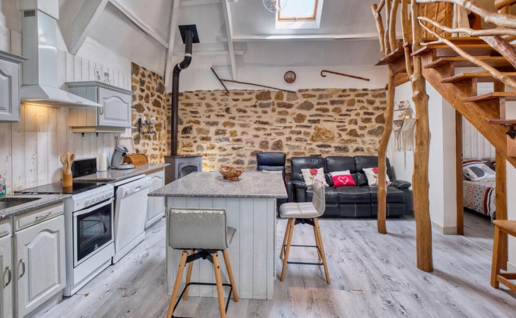 Ihr liebevoll gestaltetes Ferienhaus empfängt Sie mit einer gelungenen Mischung aus rustikalem Charme, modernen Annehmlichkeiten und einem weitläufigen Außenbereich. Genießen Sie die Ruhe und verbringen Sie entspannte Tage mit der Familie oder Freunden inmitten der Natur. Machen Sie es sich im offen gestalteten Wohnbereich bequem. Der gemütliche Wohnraum mit Natursteinwand, Sofaecke und Kaminofen bietet eine angenehme Atmosphäre zum Entspannen.