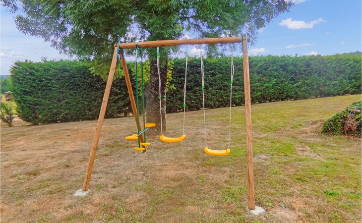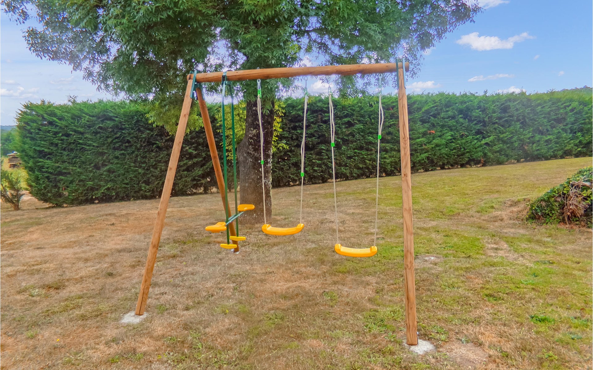 Der Außenbereich ist weitläufig und bietet viele Möglichkeiten zur Entspannung und Aktivität. Ein umzäunter Pool sorgt an warmen Tagen für eine angenehme Abkühlung. Zudem steht eine Schaukel für Kinder bereit, während Sie auf der Terrasse unter einem Sonnenschirm die Ruhe genießen. Die grünen Wiesen und der angrenzende Wald laden zu Spaziergängen ein.