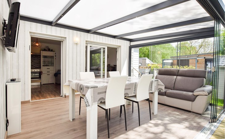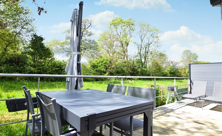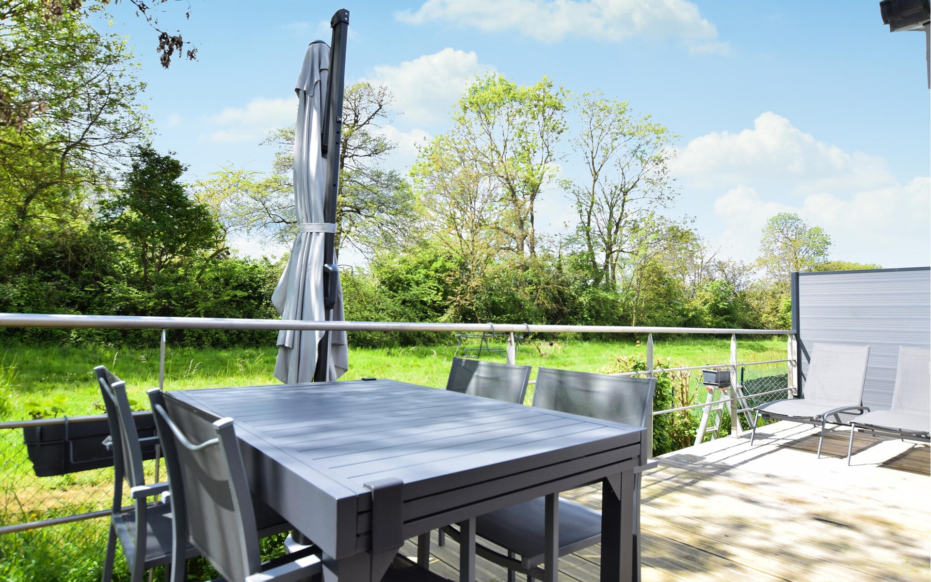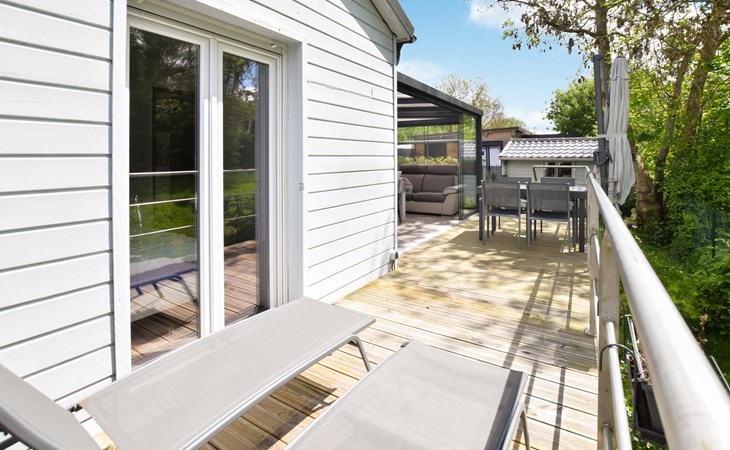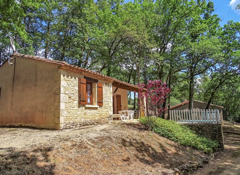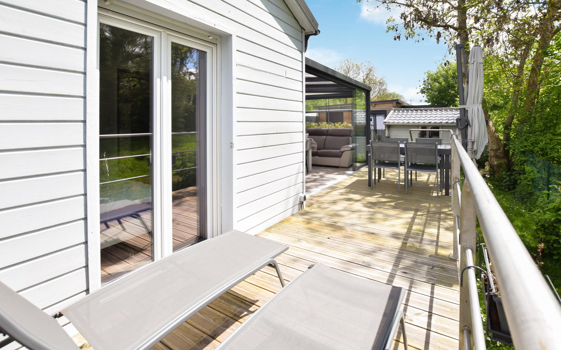 Holzhütte mit Terrasse und Garten mit Blick auf die Natur in einer geschützten Wohnanlage.