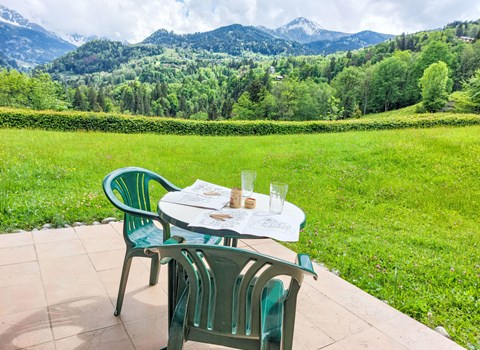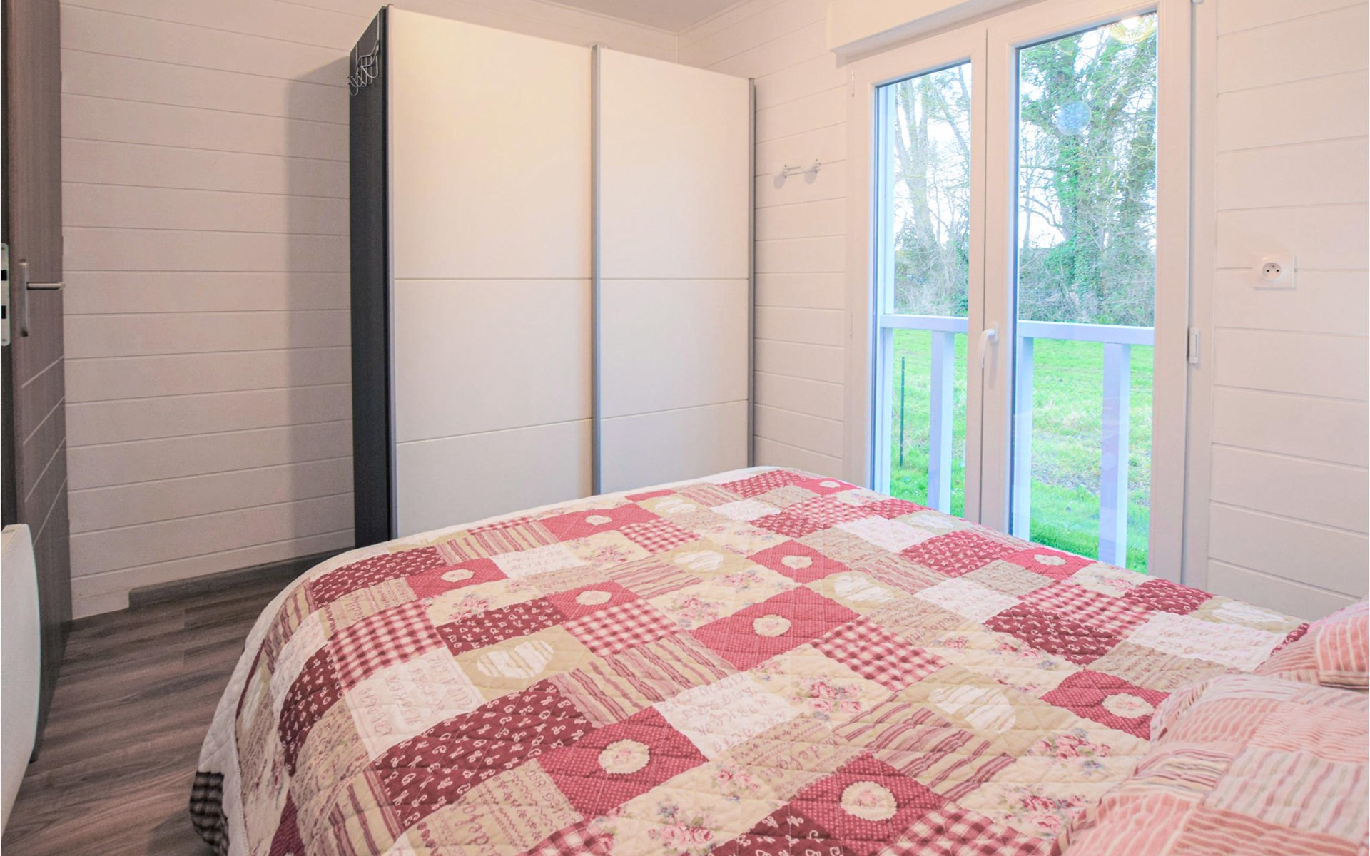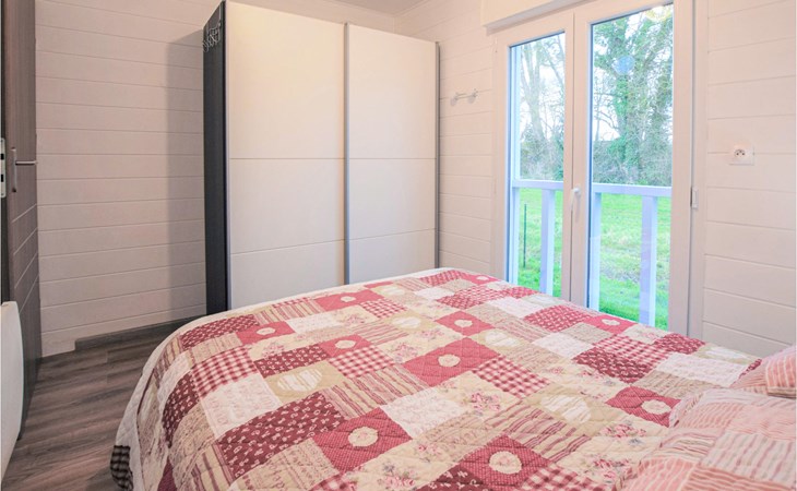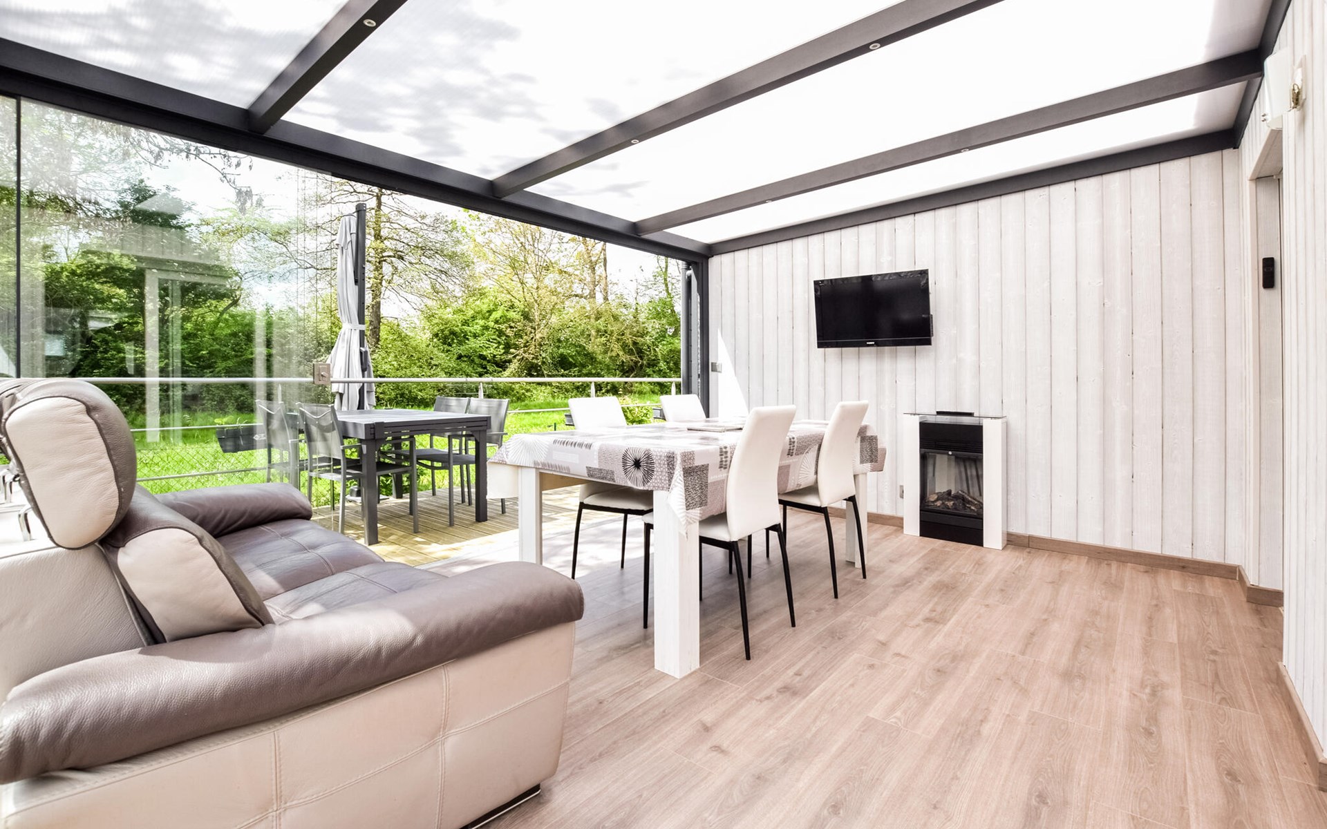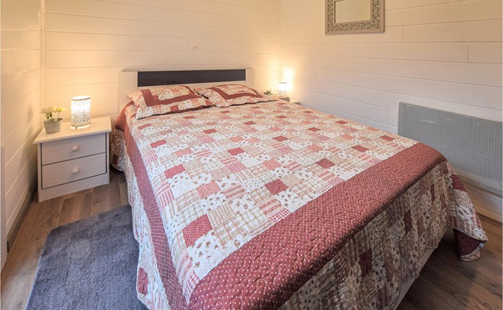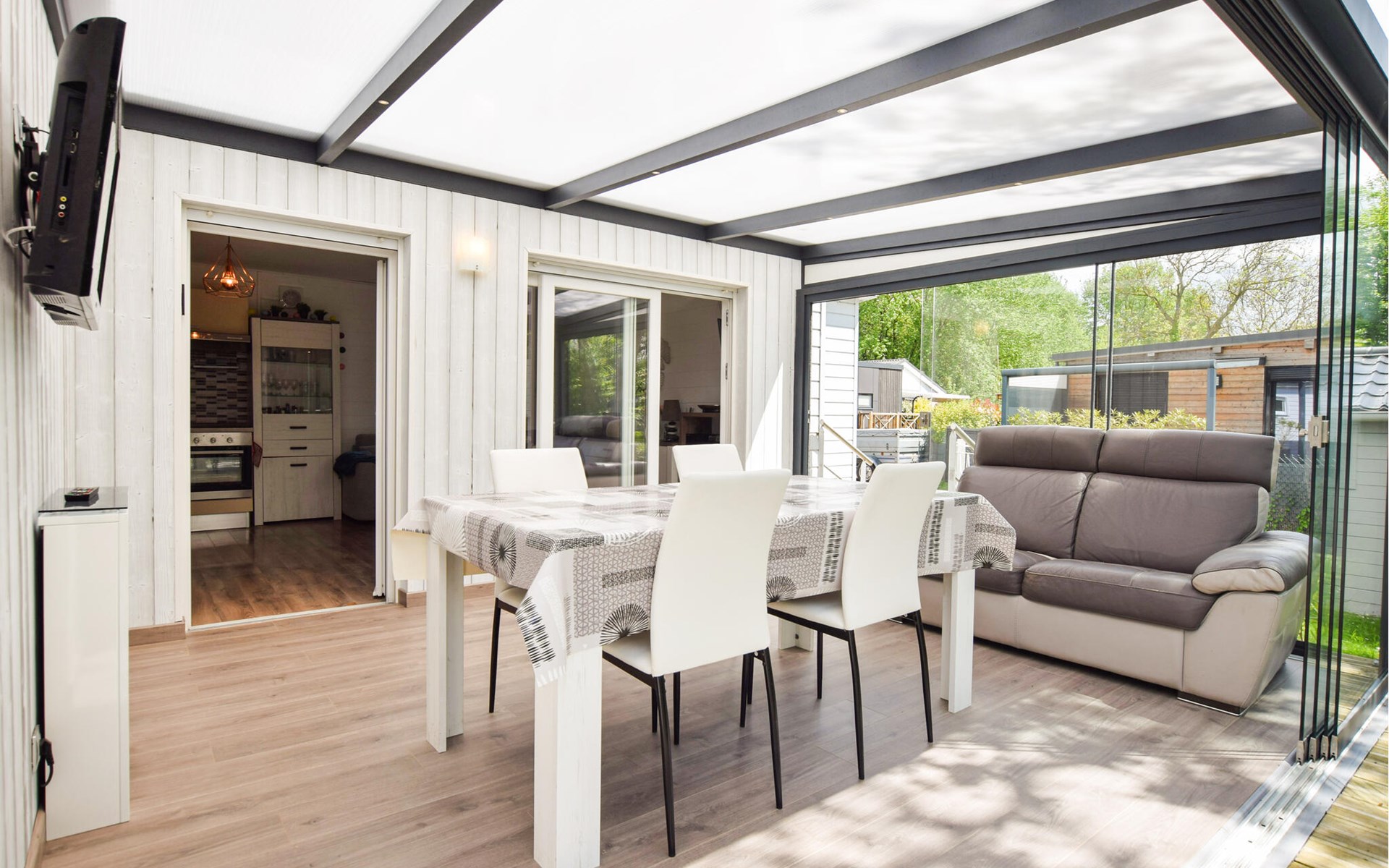 Holzhütte mit Terrasse und Garten mit Blick auf die Natur in einer geschützten Wohnanlage.