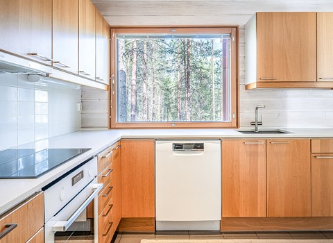 Wooden house, built in 1990. Living room, kitchen, bedroom with double bed (width 180 cm), two other bedrooms with 2 beds in each, sauna, washroom/WC, fireplace room, utility room, also separate WC and large covered terrace (60 m²). In the kitchen, there is a ceramic hob and separate convection oven.