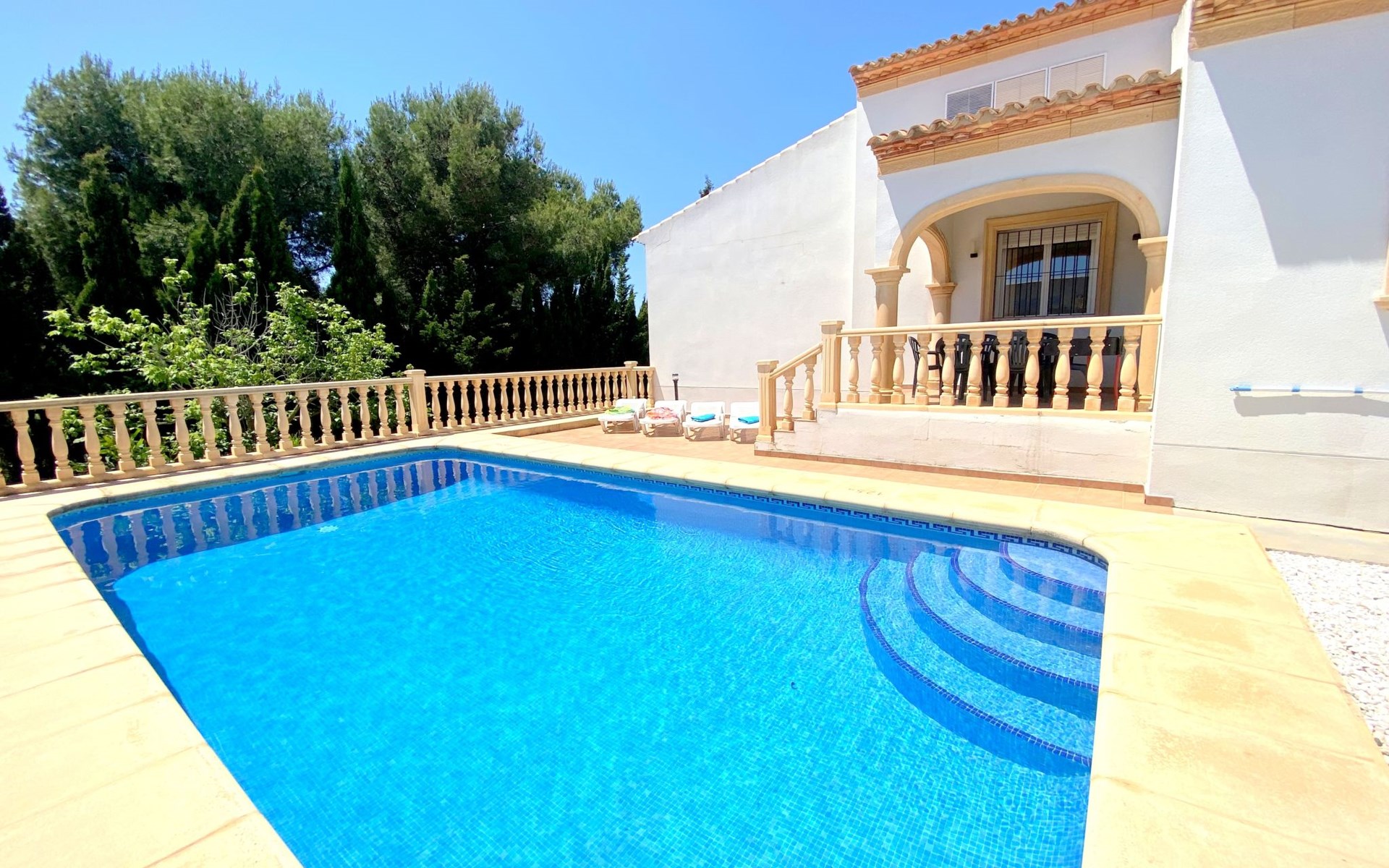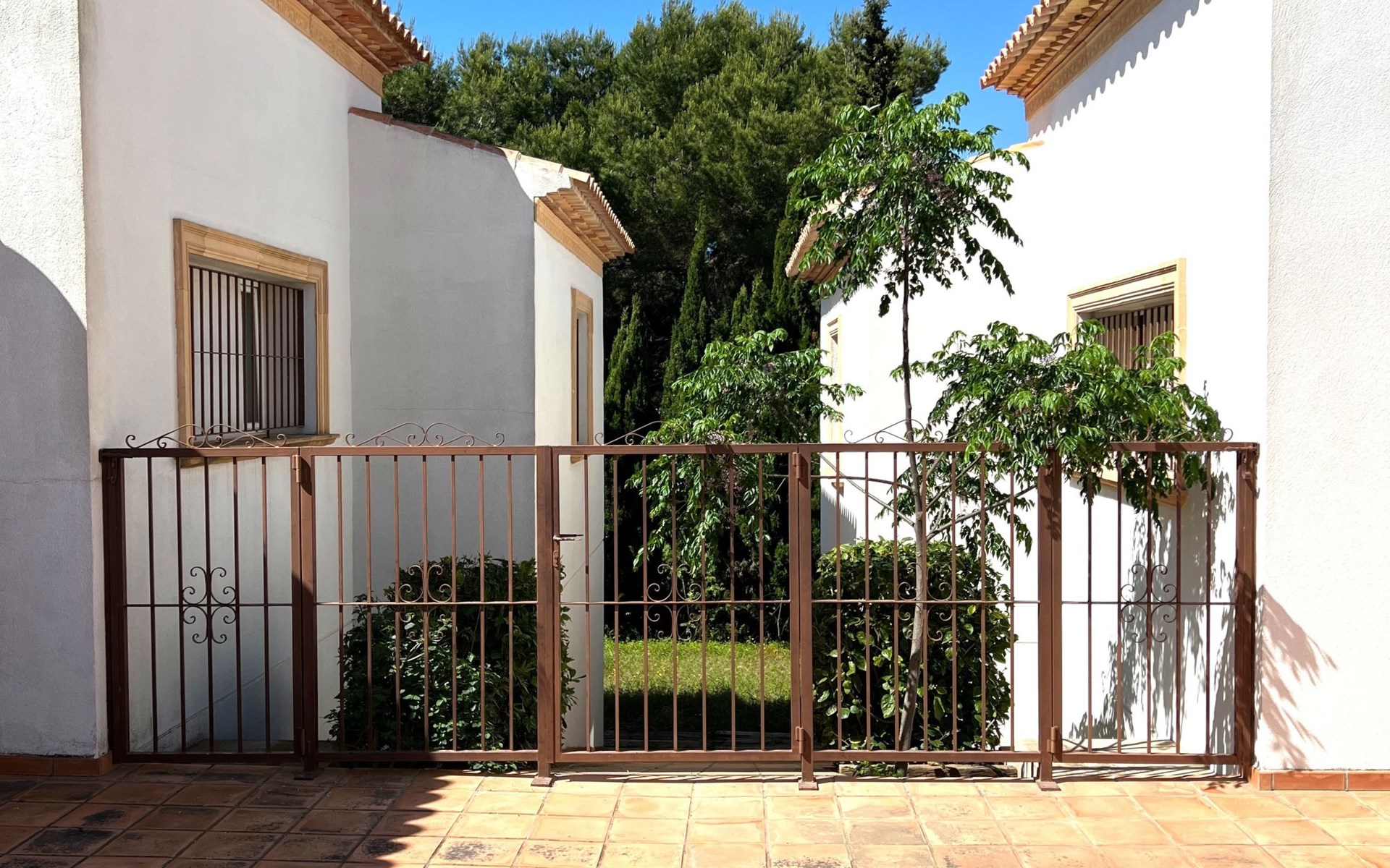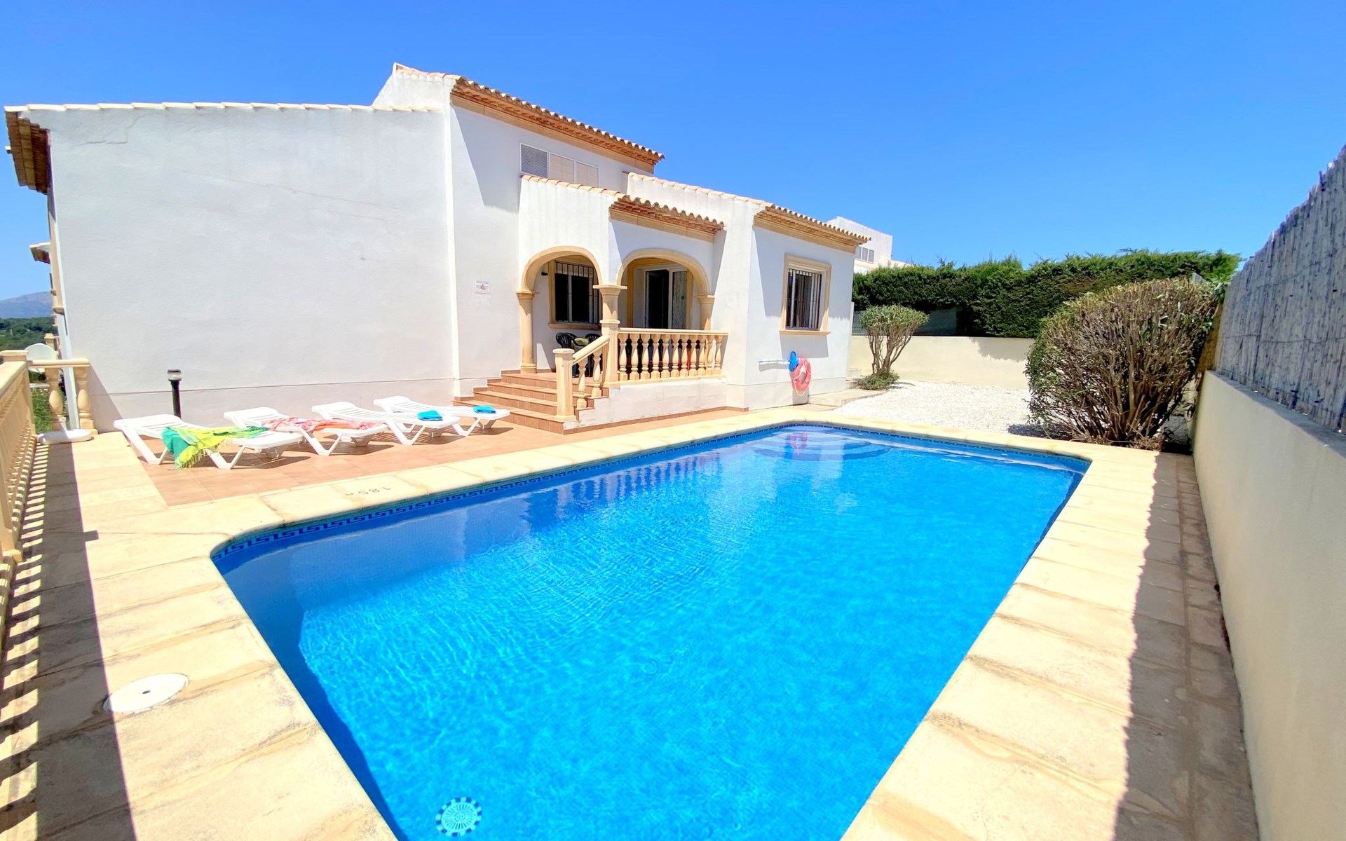 Haus. 24 Häuser in der Residenz. Im Ortsteil Monte Javea, 5 km vom Zentrum von Jávea-Arenal, am Hang, 3 km vom Meer. Zur Alleinbenutzung: Grundstück (eingezäunt) mit Pflanzen und Bäumen, Schwimmbad (8 x 4 m, 120 - 220 cm tief, saisonale Verfügbarkeit: 01.Jan. - 31.Dez.). Öffentliche Parkplätze auf der Strasse. Einkaufsgeschäft 2.5 km, Restaurant 1 km, Bushaltestelle "Calablanca" 3.6 km, Sandstrand "Arenal" 5 km, Kieselstrand "Granadella" 3 km. Tennis 1 km.