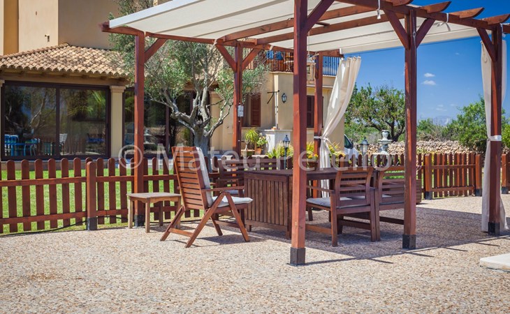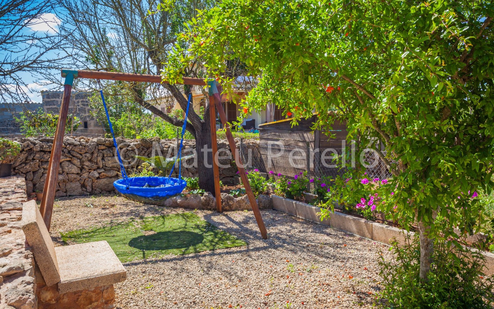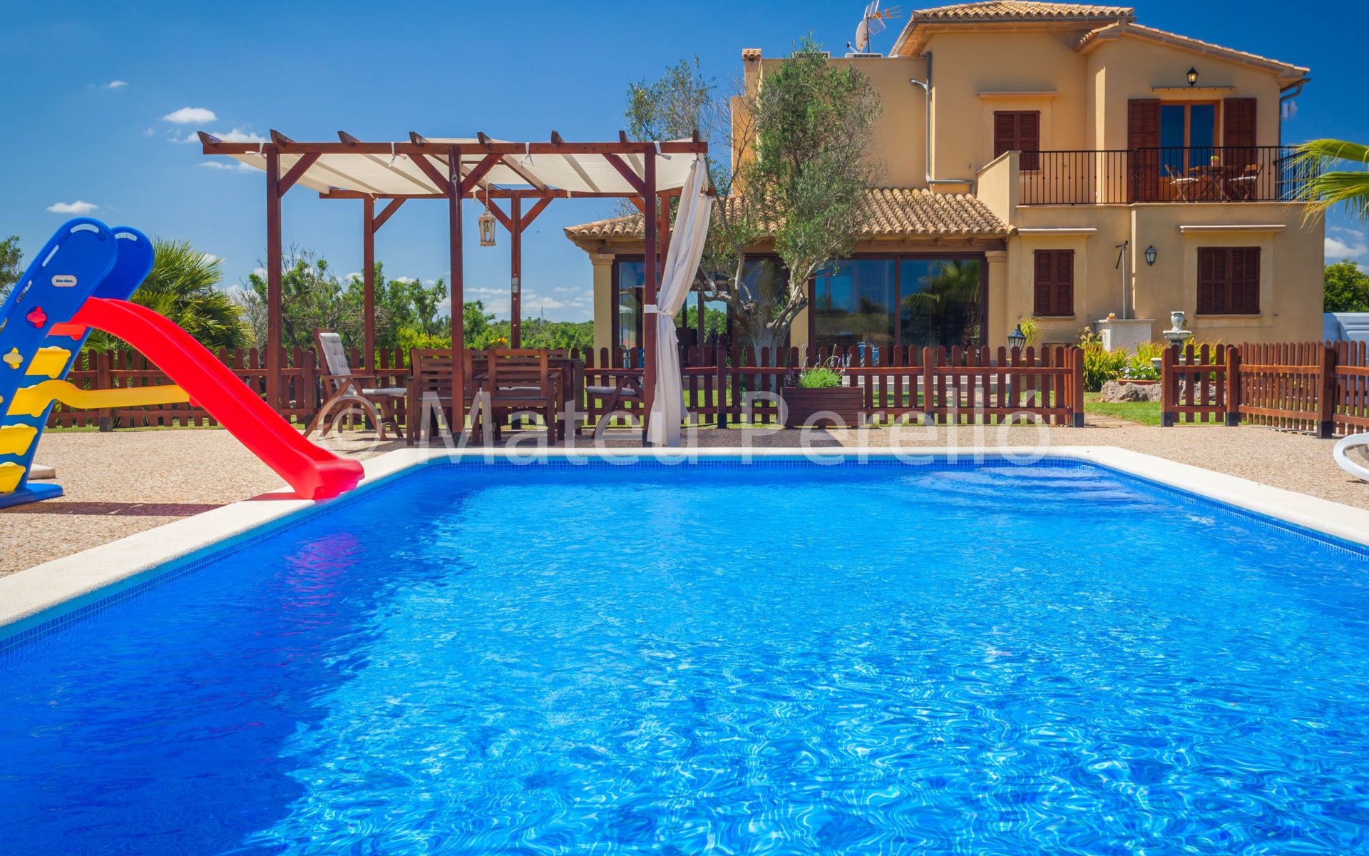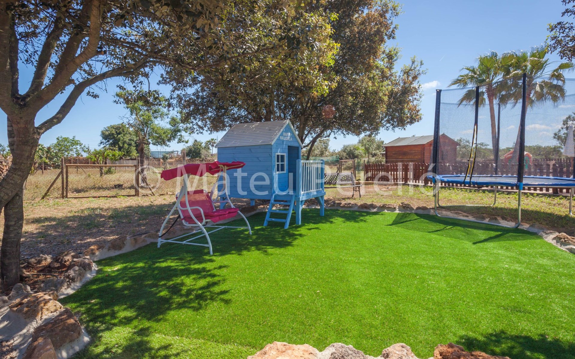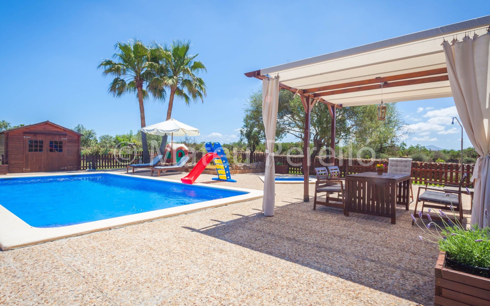 Der Außenbereich der Villa ist ein wahres Paradies, umgeben von weitläufigen Gärten mit einem 9 x 4 m großen Hauptpool, einem Kinderbecken, einer Rutsche und einer möblierten Holzpergola, in der man das mediterrane Klima genießen kann. Das Anwesen verfügt außerdem über einen Holzgrill, Sonnenliegen und eine 2x3 m große Kunstrasenfläche mit einem Kinderspielhaus, alles eingezäunt, um Privatsphäre und Sicherheit zu gewährleisten. Außerdem haben Sie die Gesellschaft mehrerer Tiere auf einem eingezäunten Grundstück, wo Hühner, Enten und Schafe Ihre Tage mit Freude füllen werden.