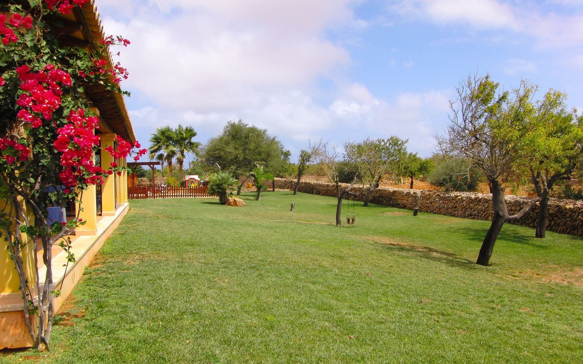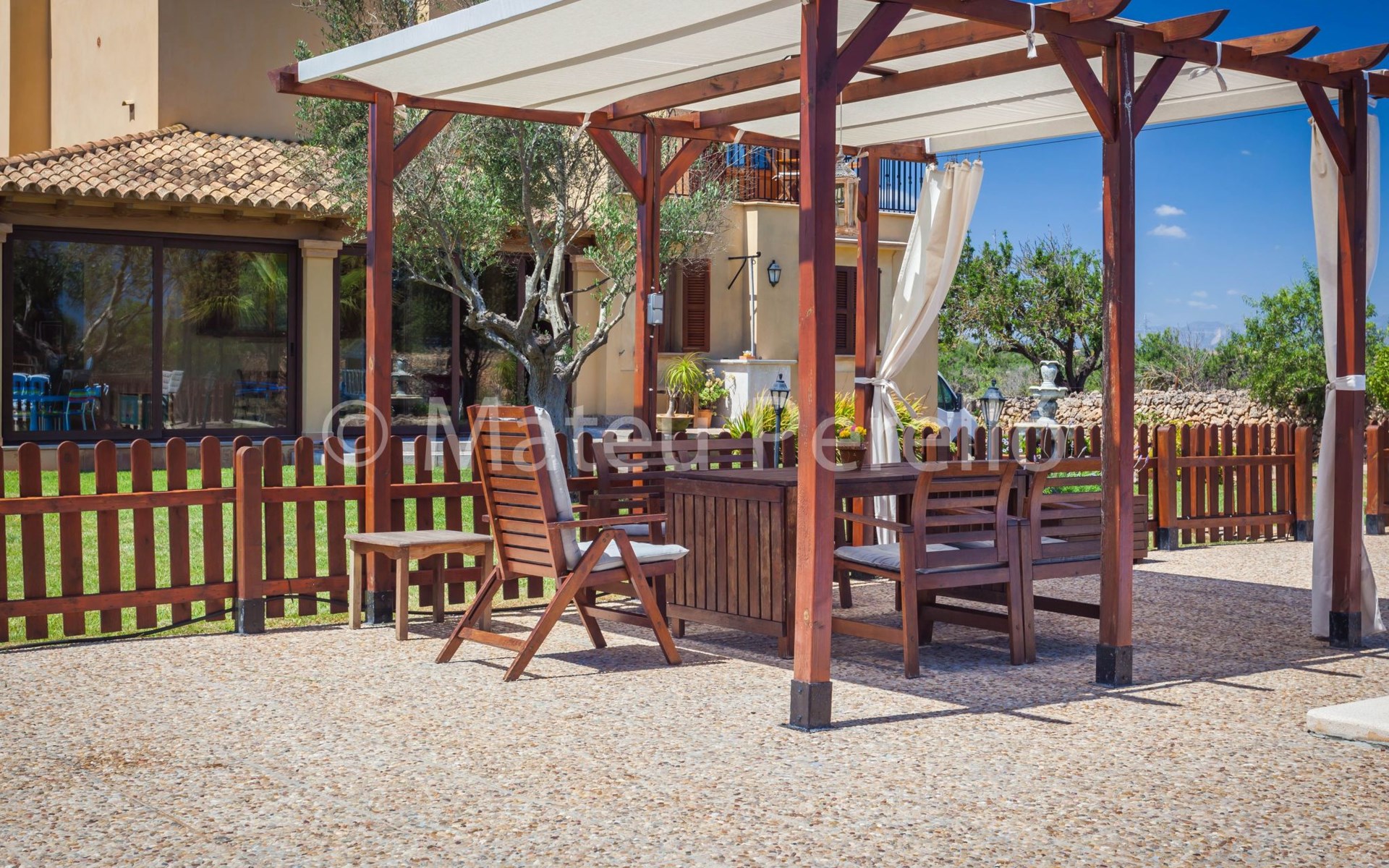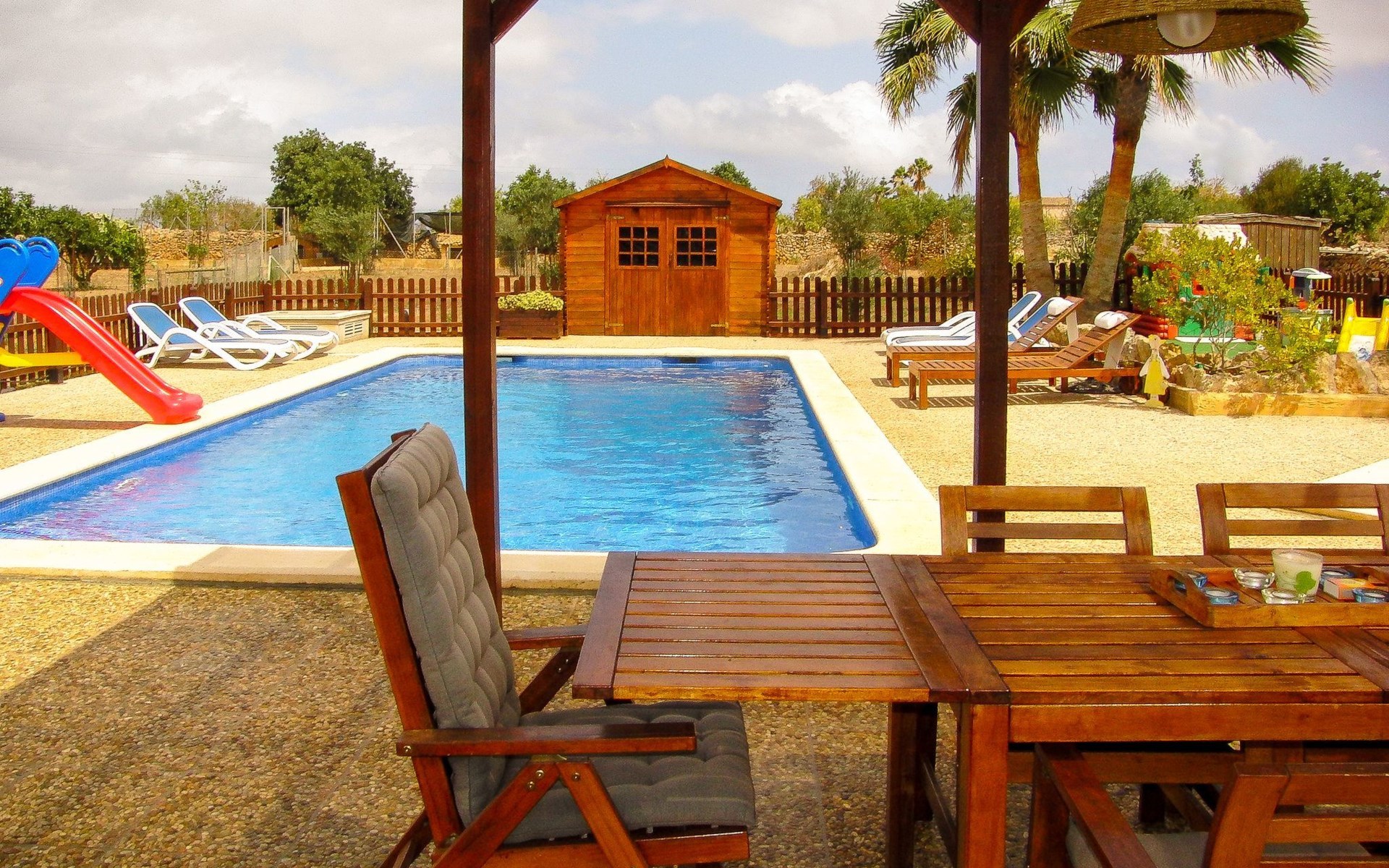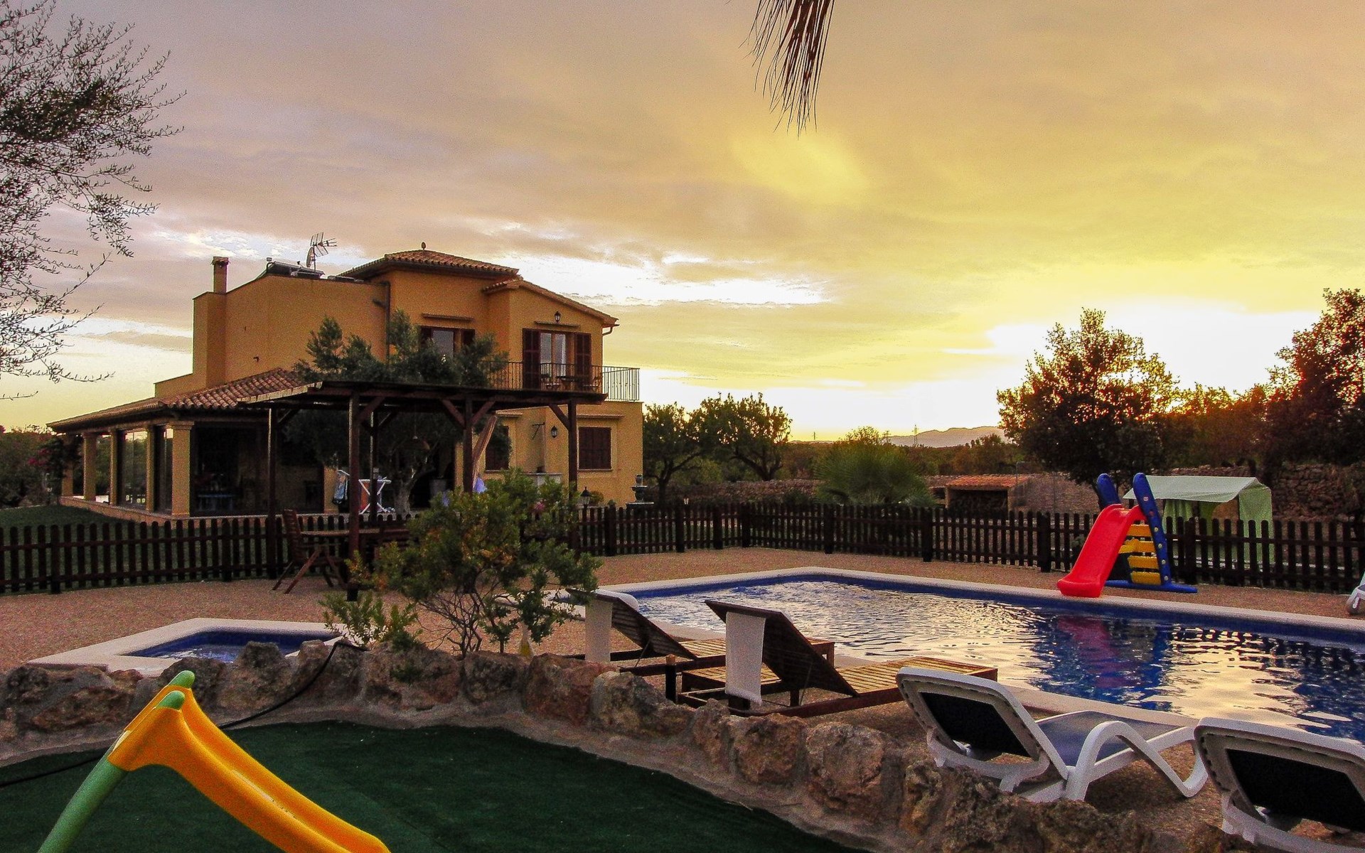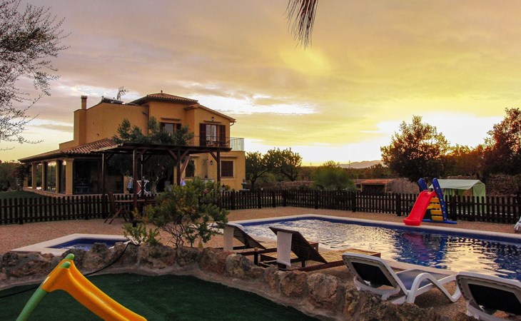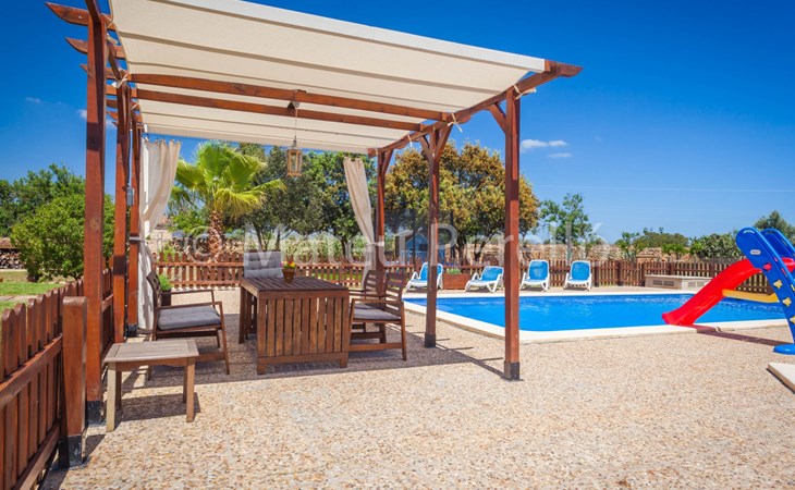 Der Außenbereich der Villa ist ein wahres Paradies, umgeben von weitläufigen Gärten mit einem 9 x 4 m großen Hauptpool, einem Kinderbecken, einer Rutsche und einer möblierten Holzpergola, in der man das mediterrane Klima genießen kann. Das Anwesen verfügt außerdem über einen Holzgrill, Sonnenliegen und eine 2x3 m große Kunstrasenfläche mit einem Kinderspielhaus, alles eingezäunt, um Privatsphäre und Sicherheit zu gewährleisten. Außerdem haben Sie die Gesellschaft mehrerer Tiere auf einem eingezäunten Grundstück, wo Hühner, Enten und Schafe Ihre Tage mit Freude füllen werden.