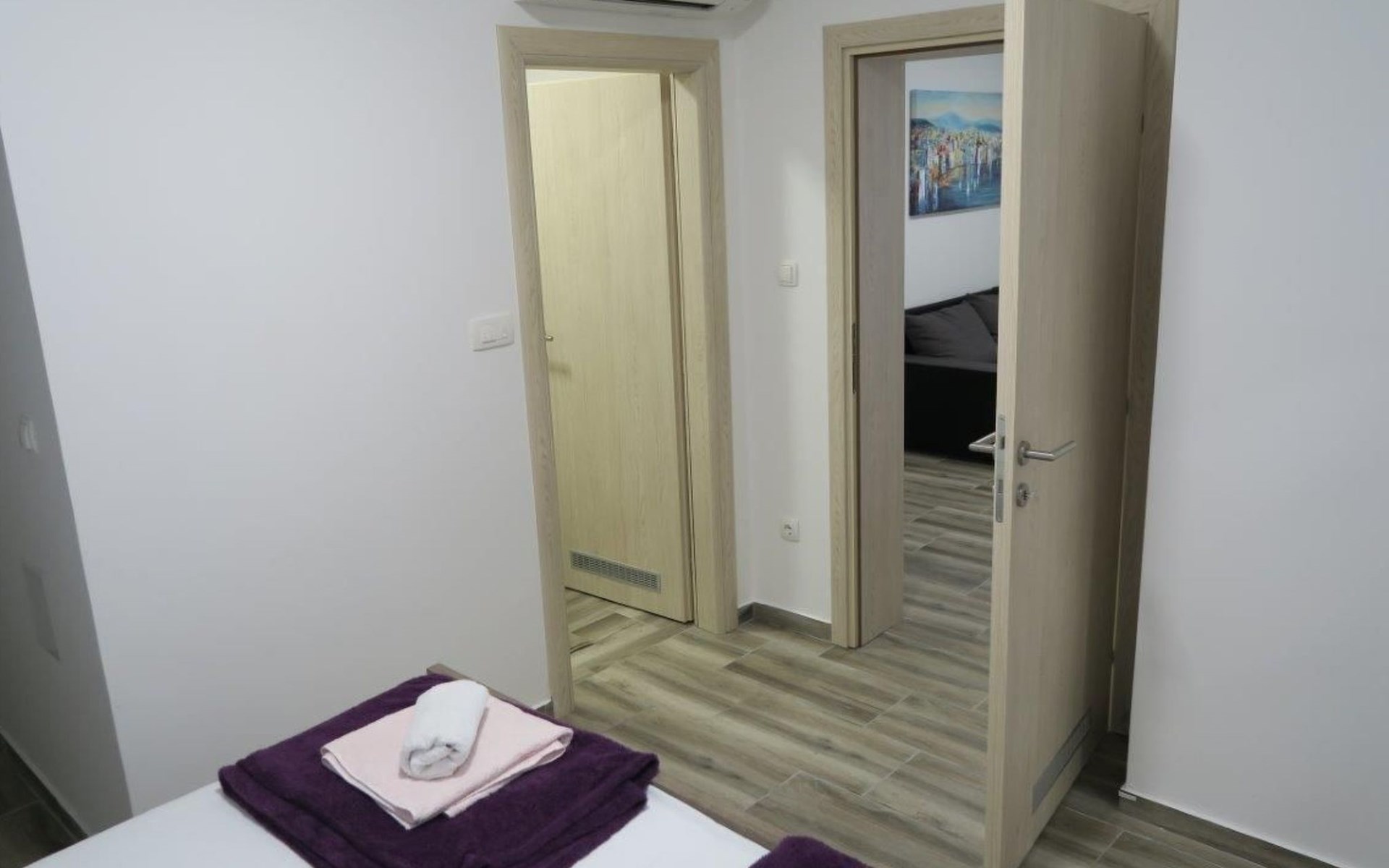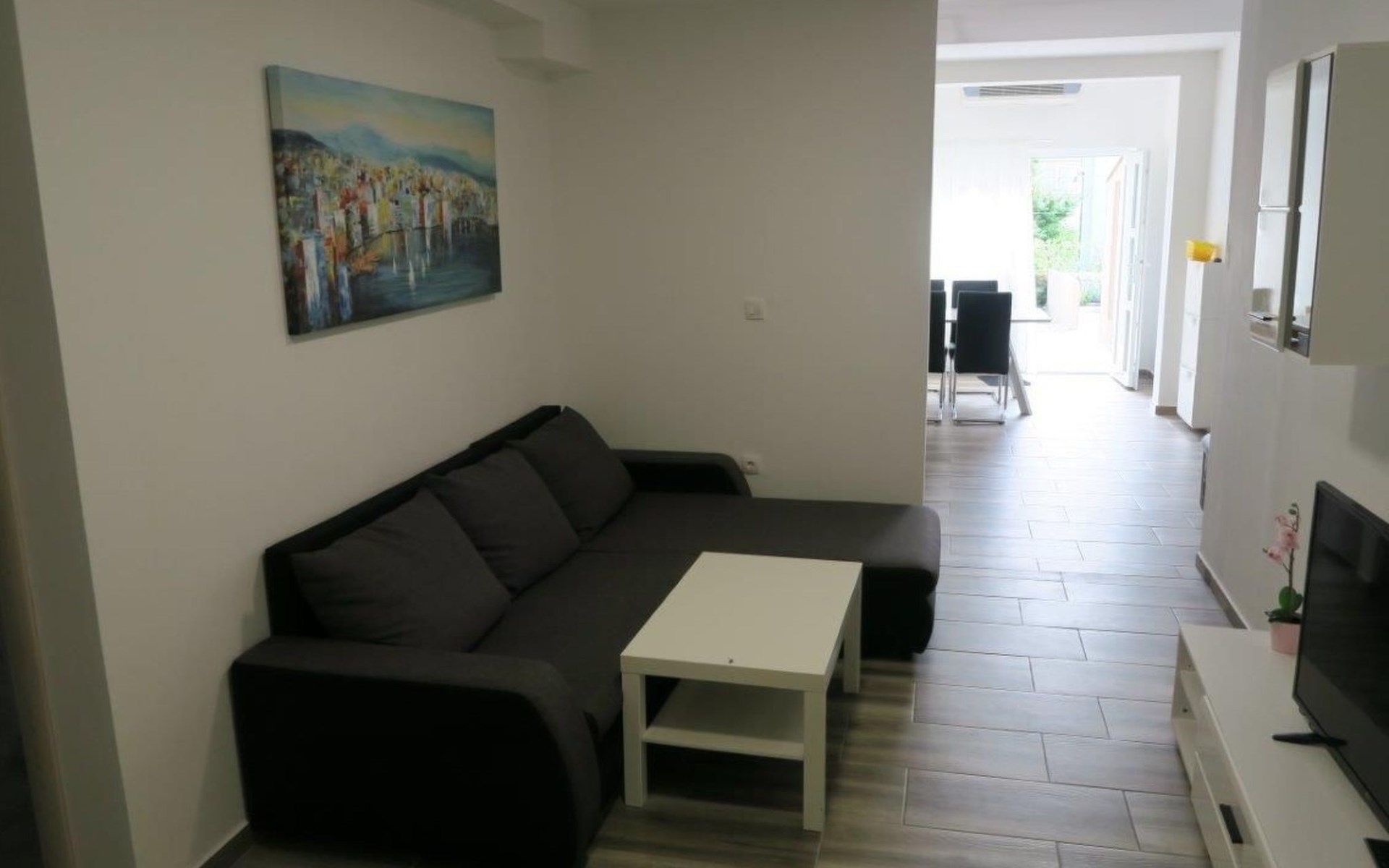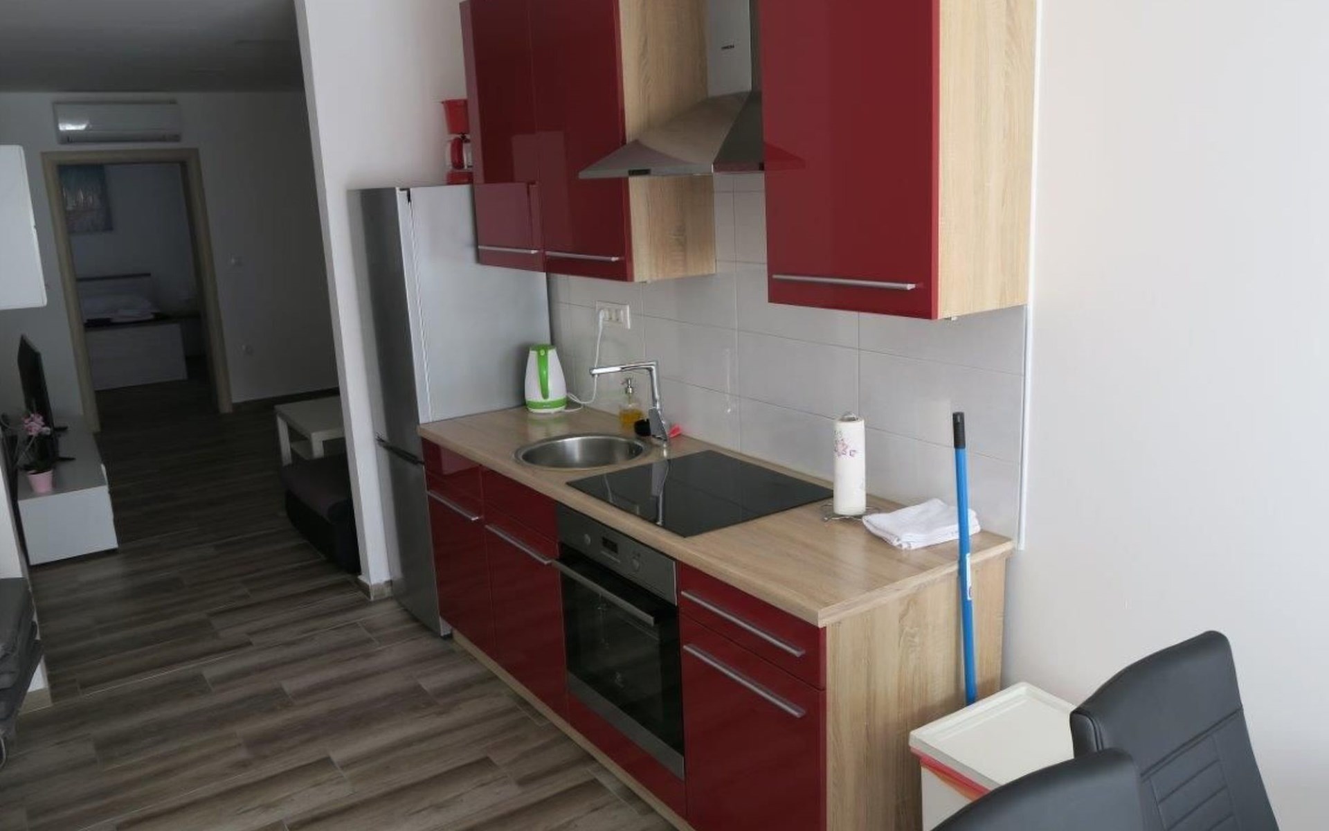 Die Zweibett-Wohnung bietet 65m² Wohnfläche. Die Wohnung hat eine offene Küche, voll ausgestattet mit Herd, Backofen, Kühlschrank, Mikrowelle, Geschirrspüler und Wasserkocher. Es gibt einen schönen großen Tisch mit 6 Stühlen, an dem Sie Ihre Mahlzeiten genießen können. An die Küche schließt sich ein Wohnzimmer mit Flachbildfernseher, Stereoanlage und Doppelschlafsofa an. Das Sofa ist 90 x 200 cm groß und 180 x 200 cm, wenn es ausgezogen ist. Die Wohnung hat auch 2 Badezimmer mit Dusche, WC, Haartrockner und Waschbecken mit Unterschrank und Waschmaschine. Die Wohnung hat 1 großes Schlafzimmer mit einem Doppelbett (180 x 200cm) und ein Schlafzimmer mit 2 Betten von 90 x 200cm. In allen Zimmern gibt es Schränke. Alle Zimmer der Wohnung sind klimatisiert. Internetzugang ist in der ganzen Wohnung verfügbar.