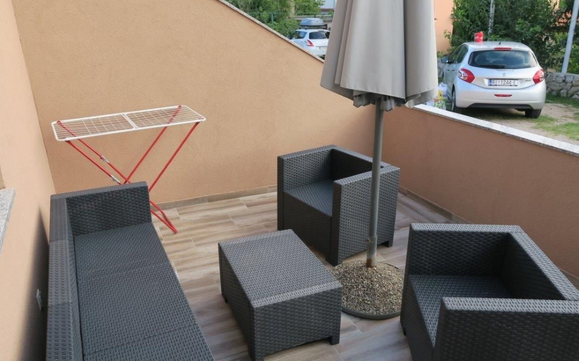Die 30 m² große Terrasse ist mit einem Grill und Gartenmöbeln ausgestattet. Die Parkplätze befinden sich direkt an der Wohnung.