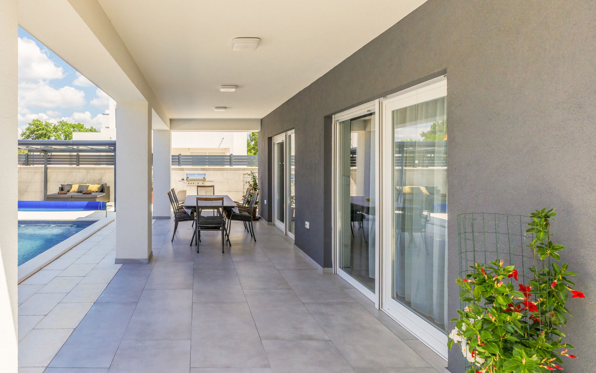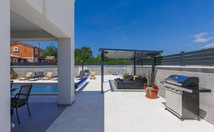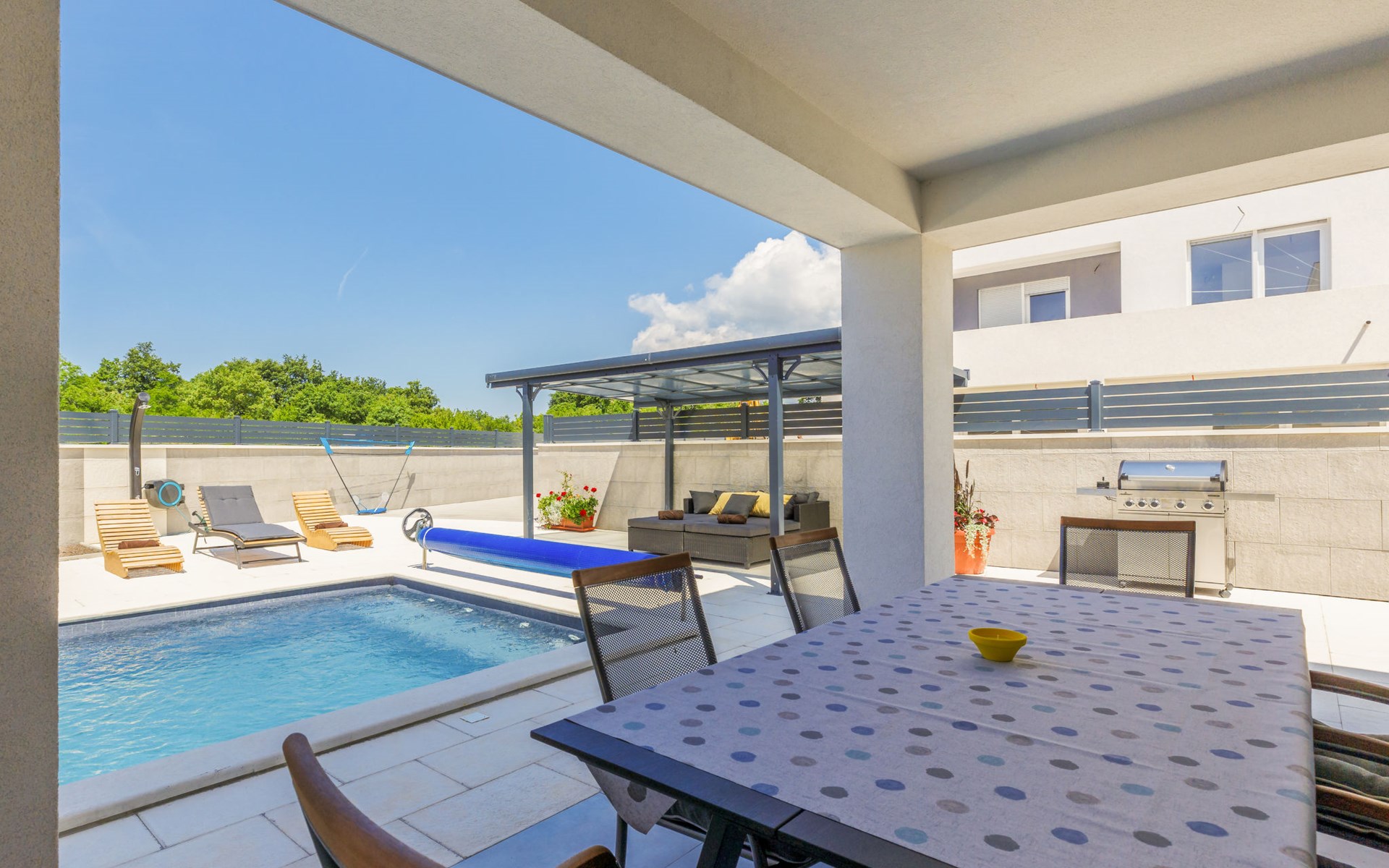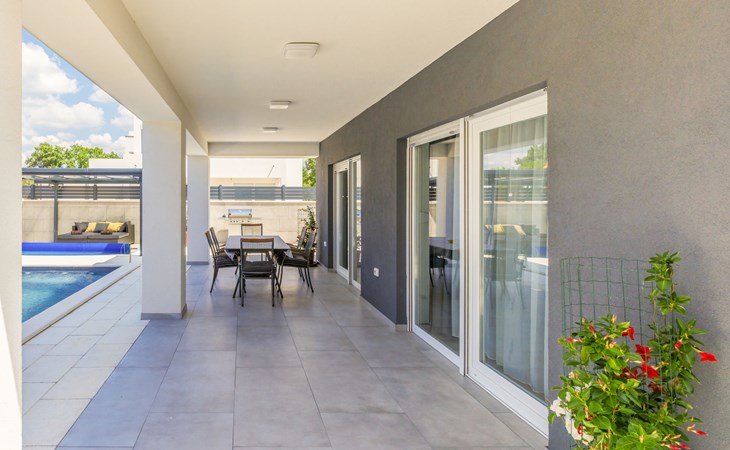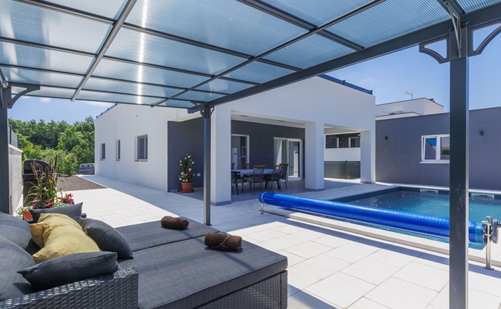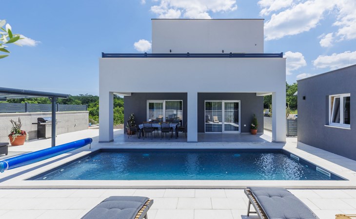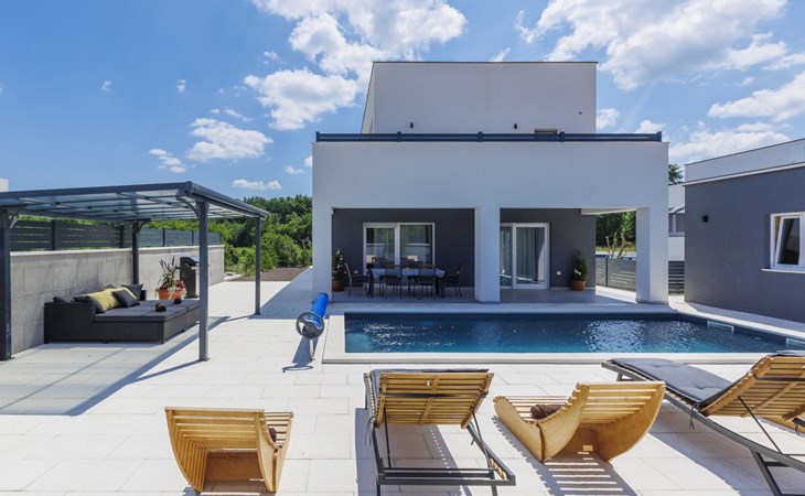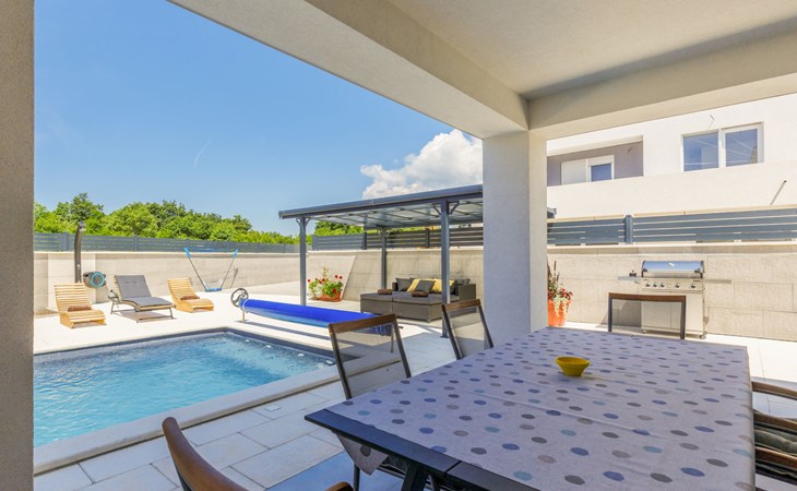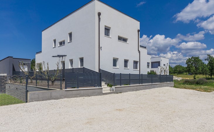 Moderne Villa "Drago", auf 2 Stockwerken. Im Weiler Kacana, 4 km vom Zentrum von Vodnjan, 15 km vom Zentrum von Pula, sonnige Lage, 10 km vom Meer. Zur Alleinbenutzung: Grundstück 500 m2 (eingezäunt) mit Pflanzen und Blumen, Schwimmbad eckig, beheizt (8 x 4 m, 140 cm tief, saisonale Verfügbarkeit: 01.Jan. - 31.Dez.) mit Innentreppe. WC im Poolbereich, Aussendusche, Terrasse (30 m2), Gartenmöbel, Grill, Poolpflege durch den Besitzer/Gärtner. Im Hause: Internetzugang, Sauna, Sprudelbad, Wellnessbereich, Waschmaschine. Zufahrt bis zum Haus (300 m Naturweg). Parkplatz (für 3 Autos) beim Haus auf dem Grundstück. Einkaufsgeschäft 4 km, Restaurant 4 km, Bushaltestelle 2.8 km, Kieselstrand 10 km, Felsstrand 10 km. Surfschule 13 km, Segelschule 13 km, Tennis 14 km, Radweg 100 m. Nahe gelegene Sehenswürdigkeiten: amphitheater 14 km.