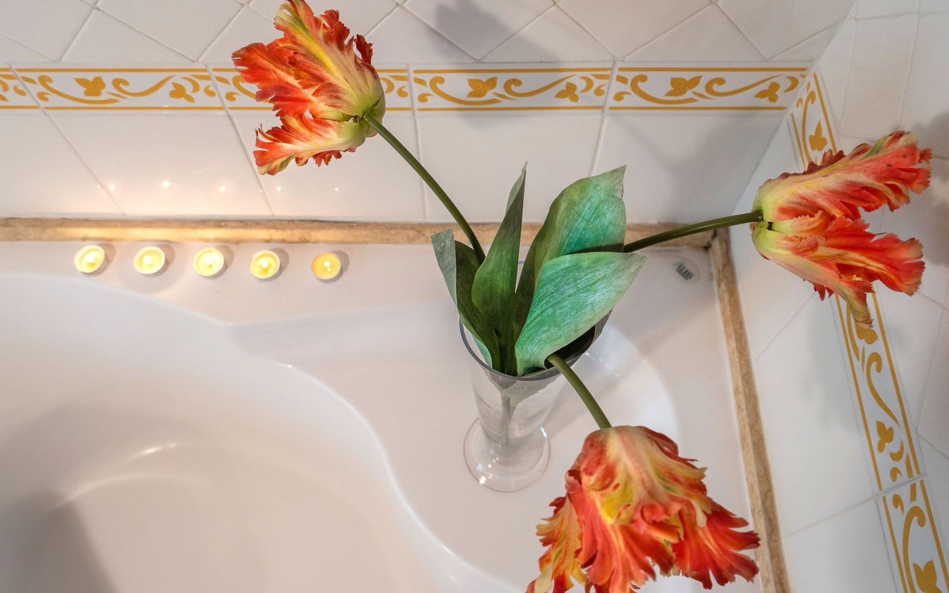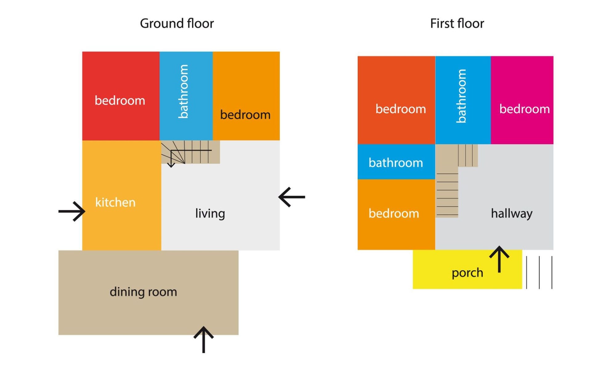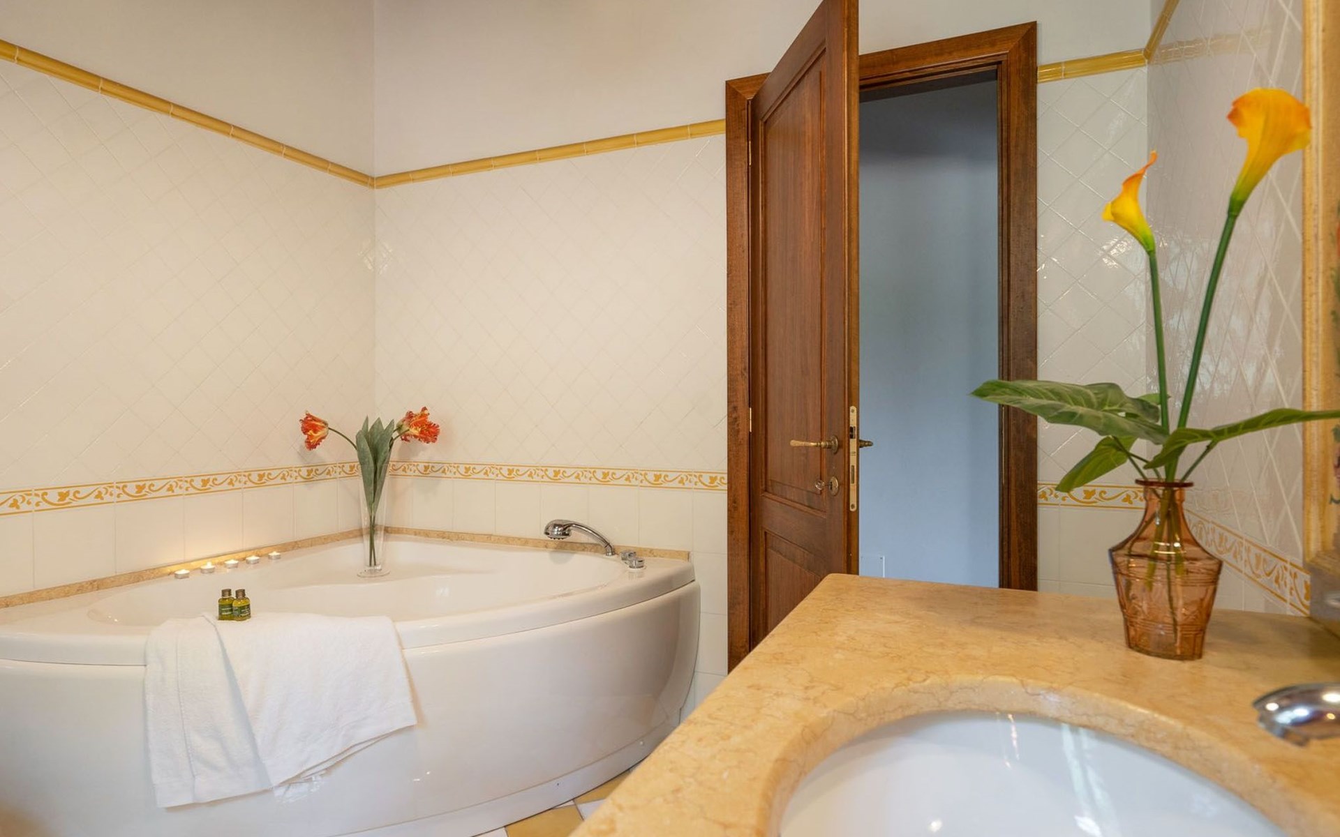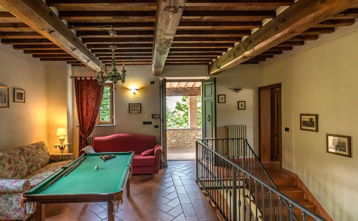 Im Erdgeschoss befinden sich die Küche, das Esszimmer, ein Raum mit einem Billardtisch, das elegante Wohnzimmer mit Sofas und Kamin, zwei Schlafzimmer und ein Bad. Der erste Stock ist über eine Innen- oder Außentreppe erreichbar, die zu einem Entspannungsbereich mit Blick auf die anderen drei Schlafzimmer und zwei Bäder führt.