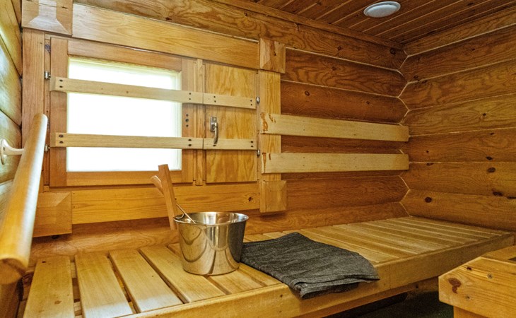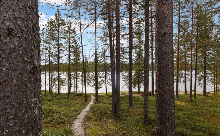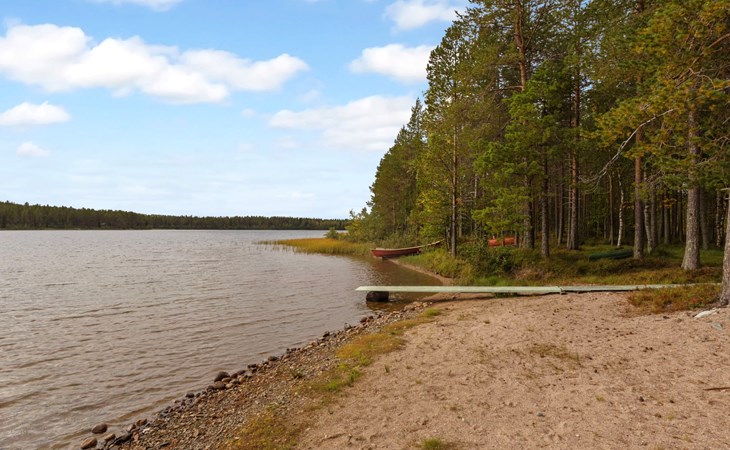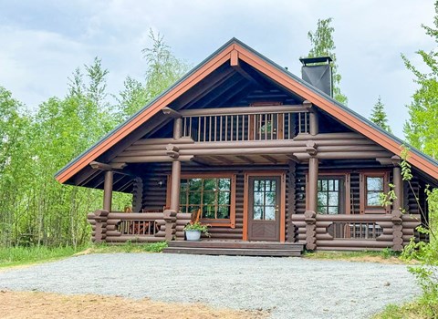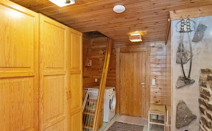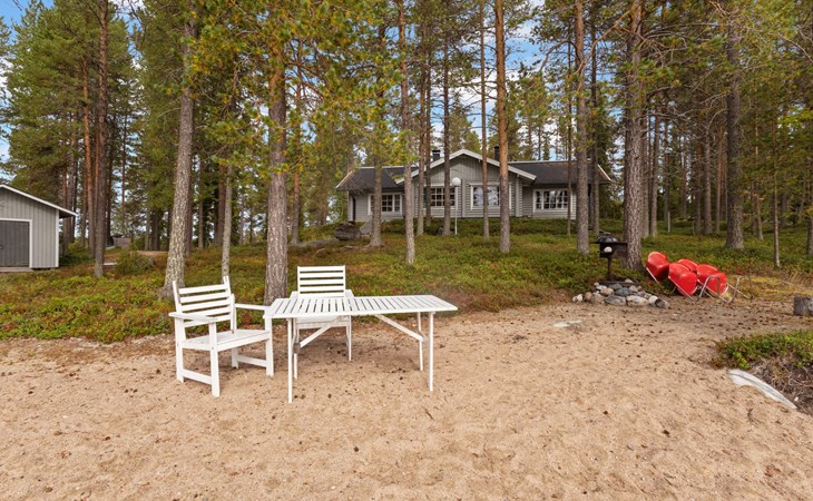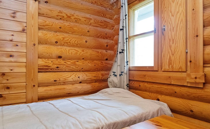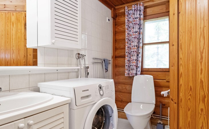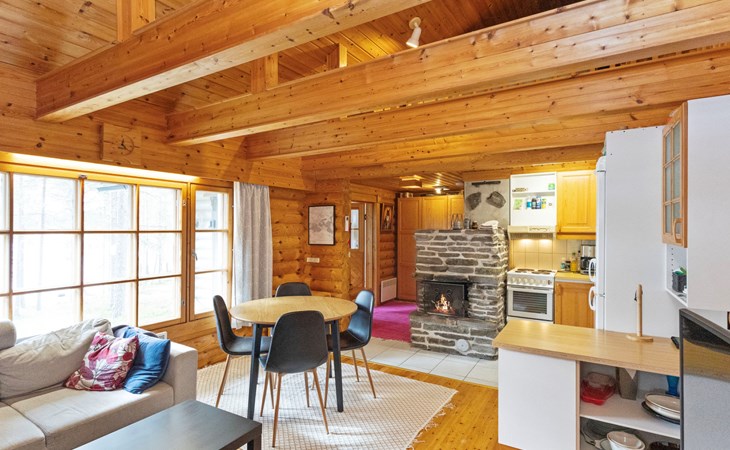 At the heart of the cabin is the inviting living room and open-plan kitchen, providing a comfortable space for spending time together. After a day of outdoor activities, you can unwind in the sauna and washroom — the perfect way to relax in true Finnish style.