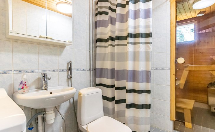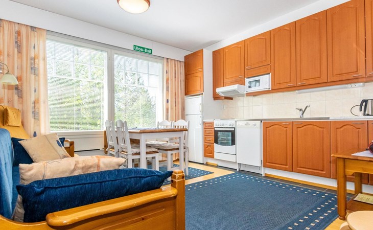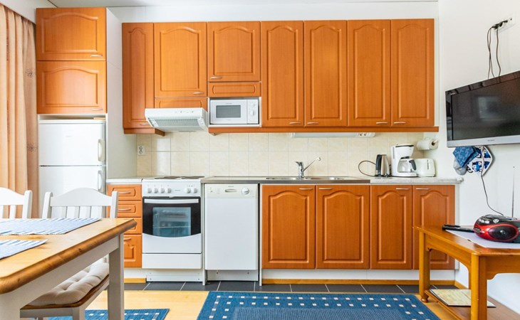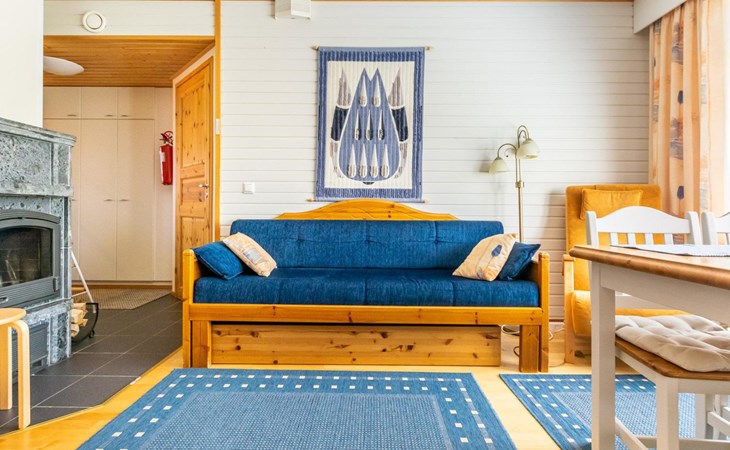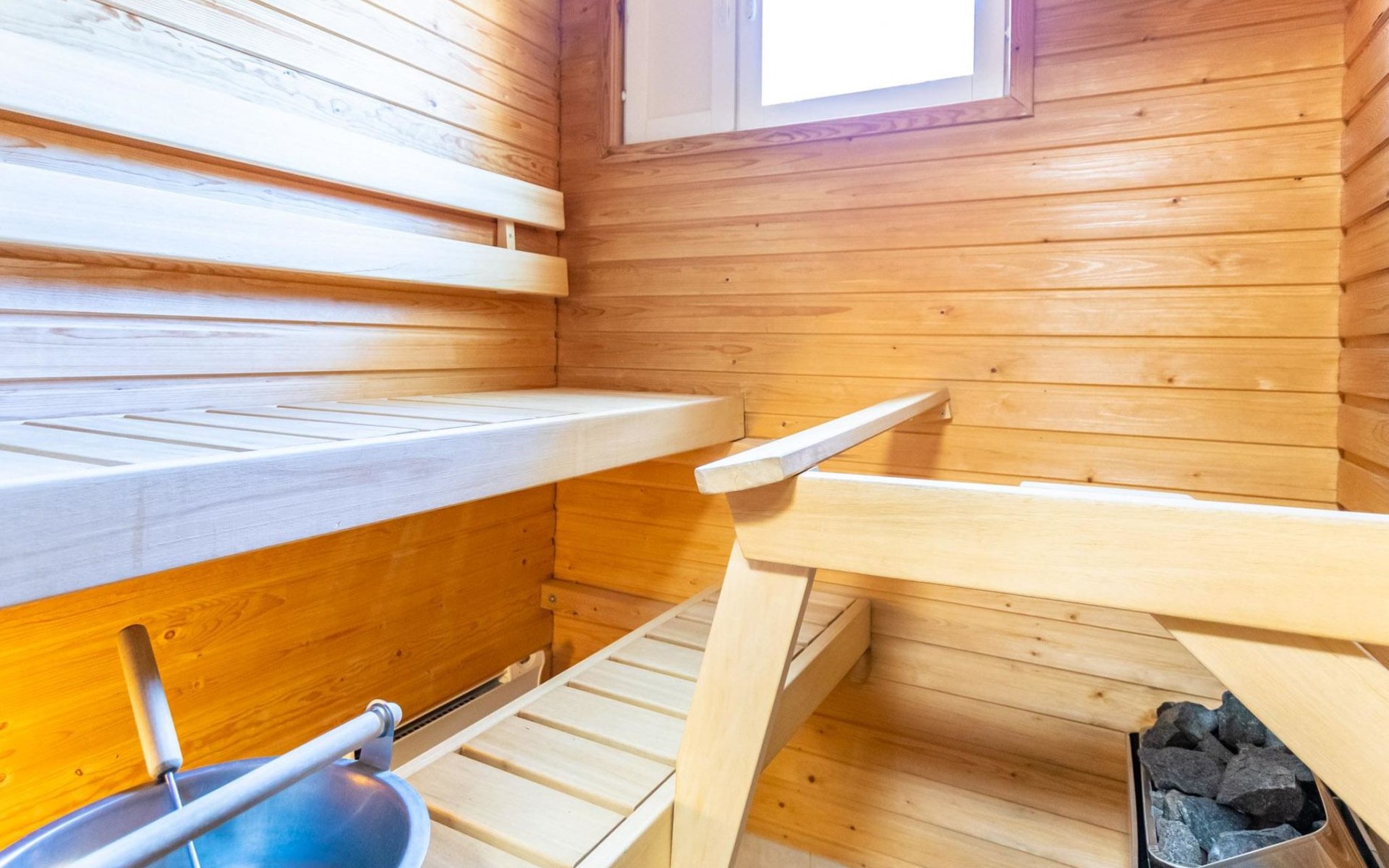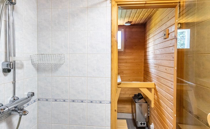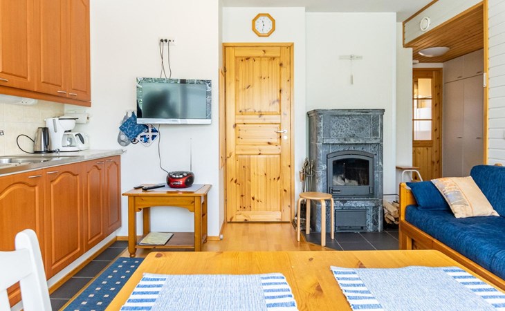 The kitchenette has everything you need for cooking and socialising. You can enjoy the warmth of a fireplace while dining, and the apartment's own sauna provides extra warmth after a day's excursions.