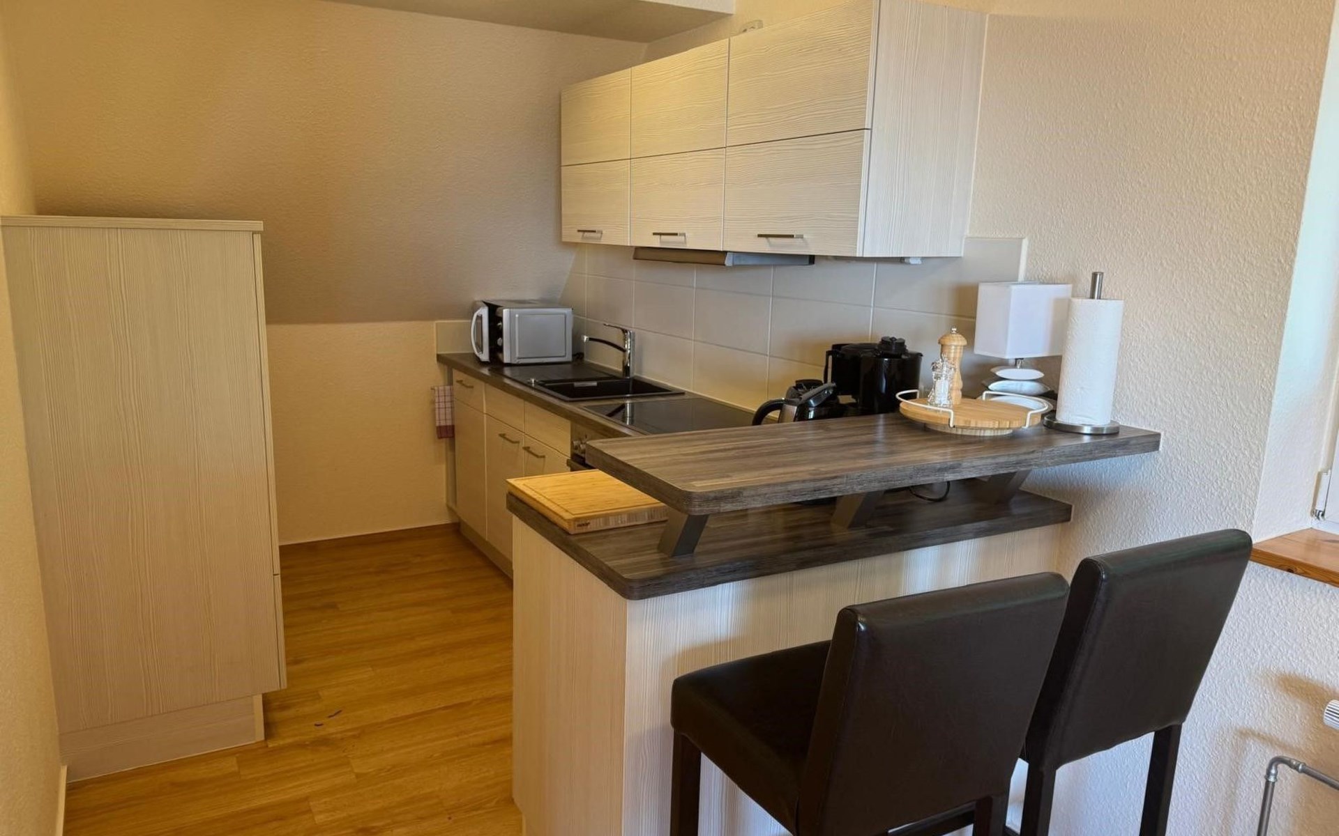 Die Wohnung ist im ersten Obergeschoss gelegen und sorgfältig ausgestattet, um Ihren Aufenthalt so komfortabel wie möglich zu machen. Neben einem gemütlichen Schlafzimmer und einem Badezimmer mit Dusche erwarten Sie praktische Annehmlichkeiten wie eine Spülmaschine, eine Kaffeemaschine und ein Wasserkocher. Diese durchdachten Details garantieren, dass Sie während Ihres Aufenthalts eine sorglose Zeit verbringen können.