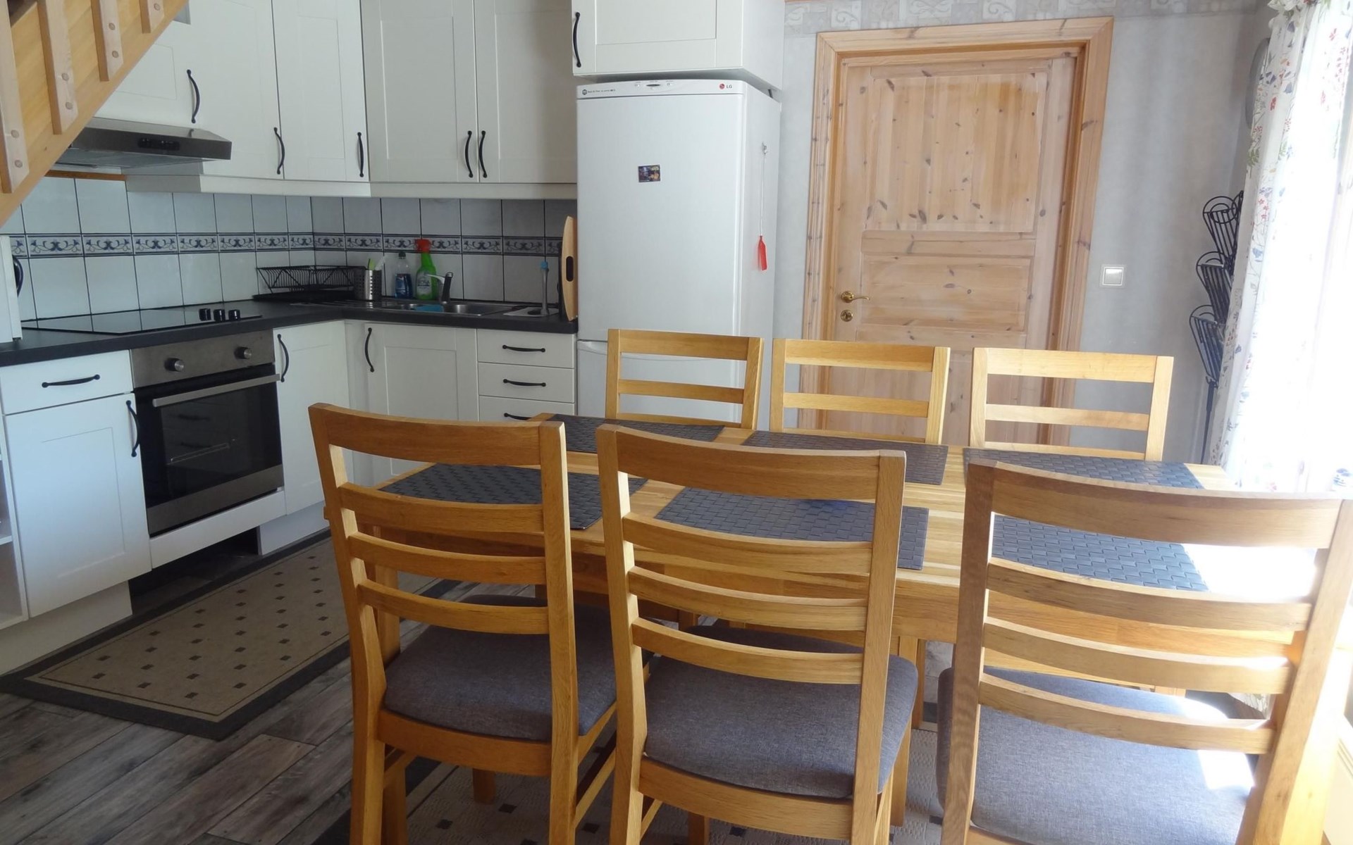 Im Inneren finden Sie ein durchdacht eingerichtetes Ferienhaus, das sich über zwei Etagen erstreckt und mit allem Komfort ausgestattet ist, um einen reibungslosen Aufenthalt zu gewährleisten. Im Erdgeschoss erwartet Sie eine geräumige Küche, die mit einem großen Esstisch, Stühlen und allen notwendigen Geräten wie Herd, Backofen, Kühl- und Gefrierschrank, Mikrowelle, Wasserkocher, Toaster und Kaffeemaschine ausgestattet ist. Im Obergeschoss befindet sich ein gemütliches Wohnzimmer mit bequemen Sitzgelegenheiten, einem Flachbildfernseher mit Satellitenkanälen und großen Fenstern, die einen atemberaubenden Blick aufs Meer bieten. Die Unterkunft verfügt über ein Hauptschlafzimmer mit Doppelbett und Kleiderschrank sowie zwei weitere Schlafzimmer mit jeweils zwei Einzelbetten, einer Kommode und Stühlen. Das Haus verfügt über ein Badezimmer mit Dusche, Waschbecken und Toilette sowie über ein separates WC im ersten Stock. Ein kostenloser drahtloser Internetzugang sorgt für zusätzlichen Komfort.