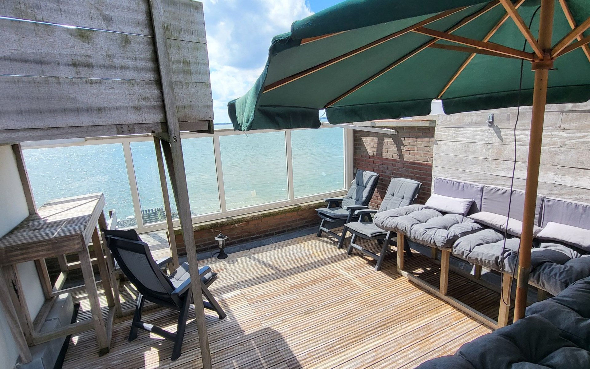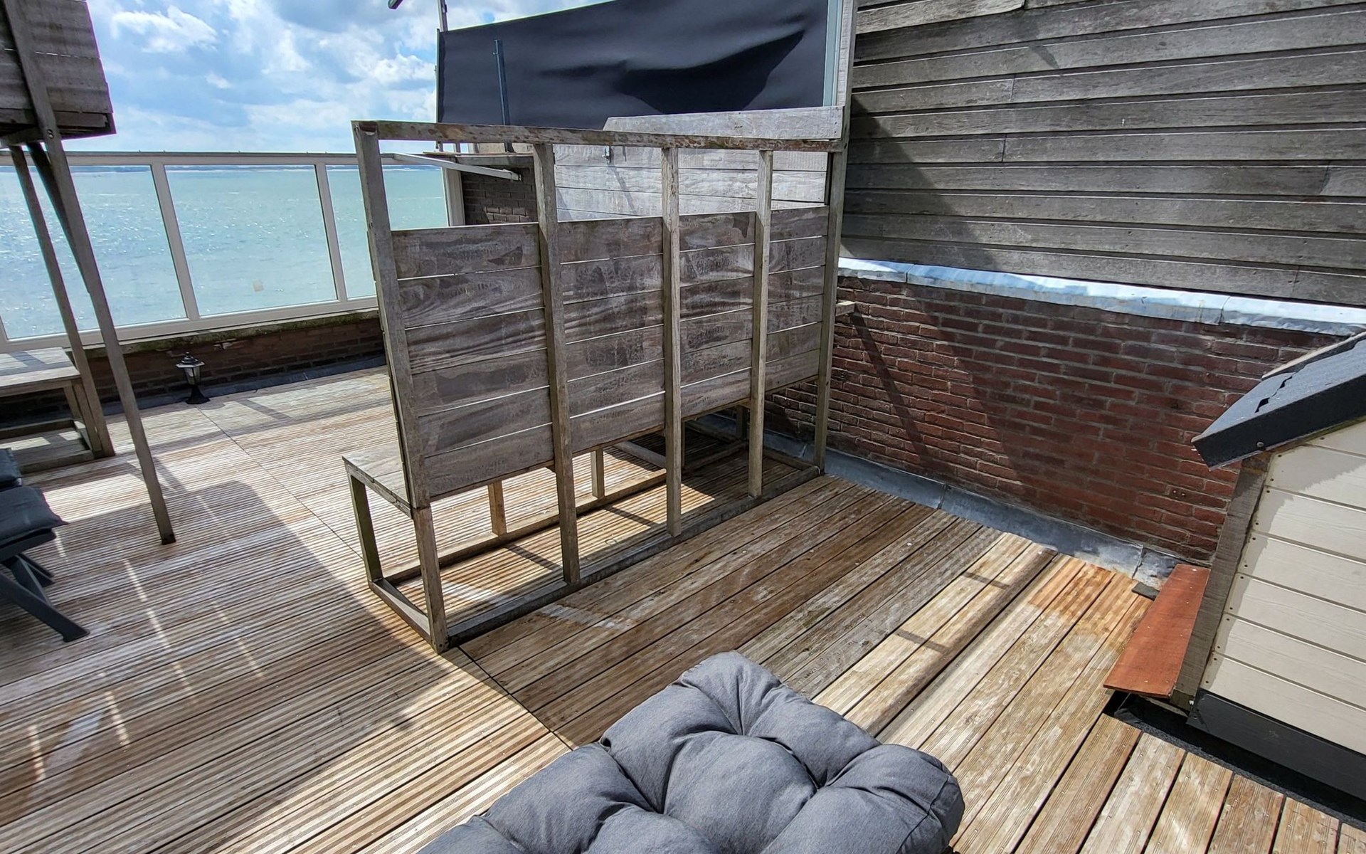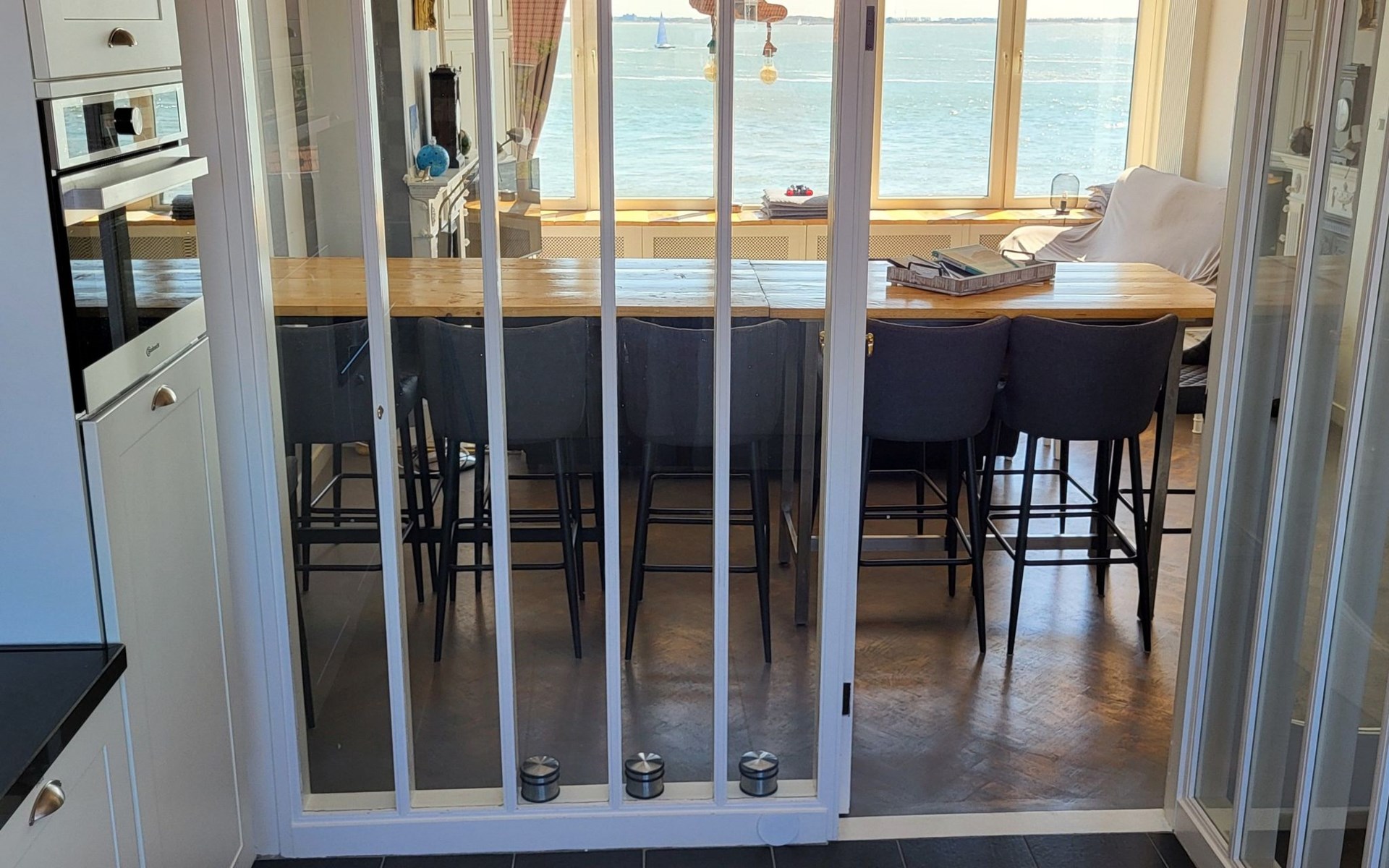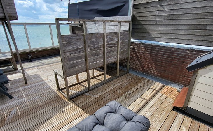 Der Außenbereich ist ebenso beeindruckend mit mehreren Plätzen zum Genießen im Freien: ein sonniger Balkon im zweiten Stock und eine geräumige, sicher abgeschirmte Dachterrasse von nicht weniger als 40 Quadratmetern, die nach Süden ausgerichtet ist und einen spektakulären Blick auf das Meer und die Altstadt bietet. Hier kann man sich sonnen oder die vorbeiziehenden Schiffe bewundern, während man einen Drink genießt oder sich mit anderen trifft.