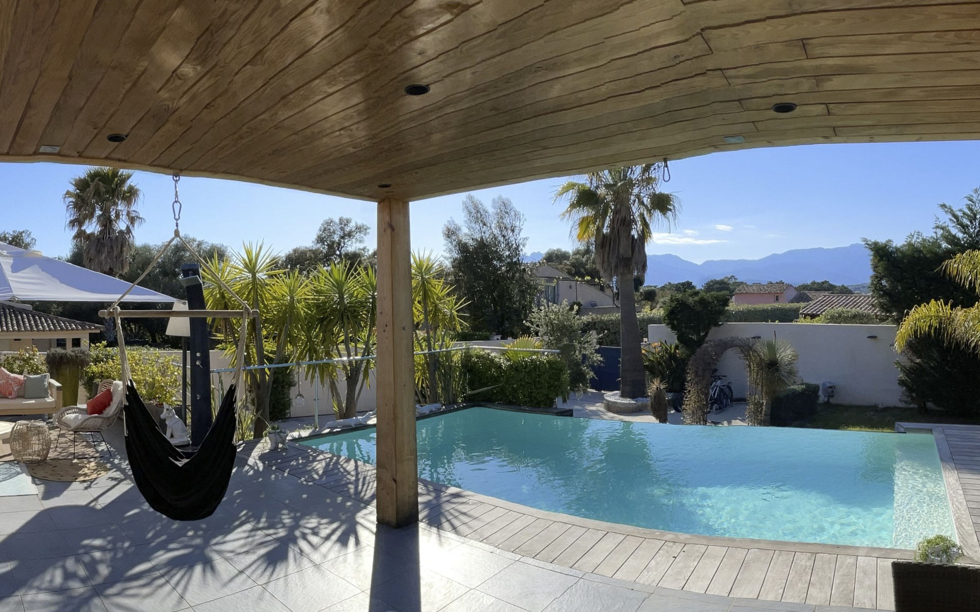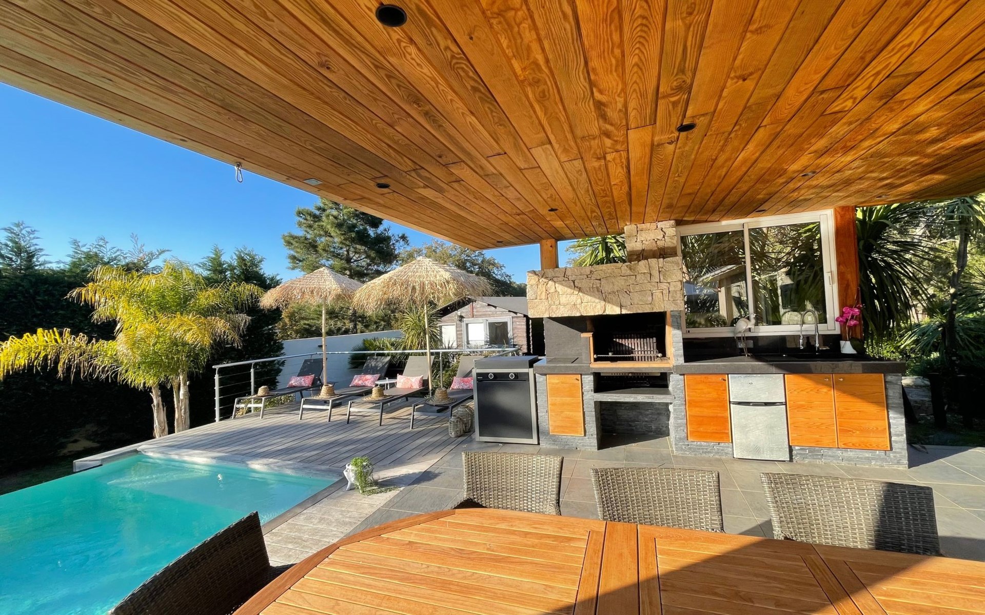 Privates Grundstück und Terrasse mit Gartenmöbeln: Liegestühle, Tische, Stühle, Gartenmöbel und Pergola sowie ein Poolhaus mit TV und Außenküche.