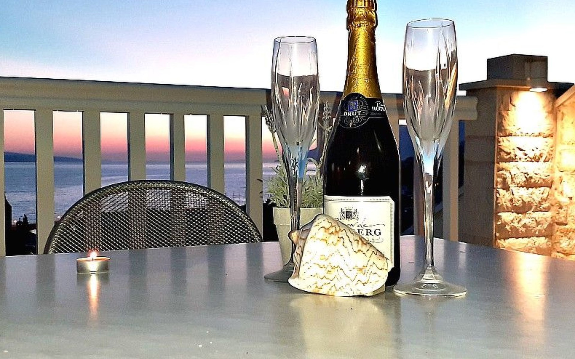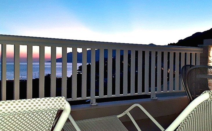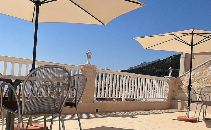 Von der großzügigen Terrasse, die mit der Nachbarwohnung geteilt wird, mit Gartenmöbeln und Sonnenschirm genießen Sie einen wunderbaren Blick auf das Meer und die bergige Landschaft.