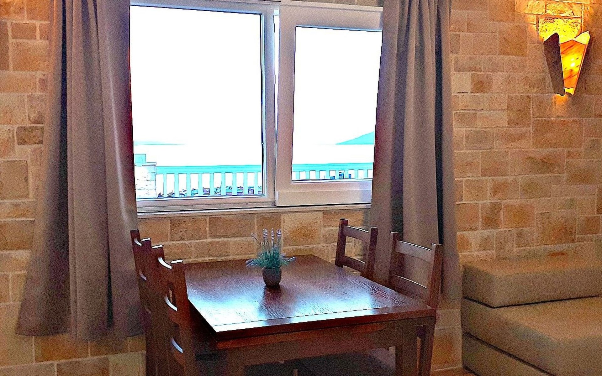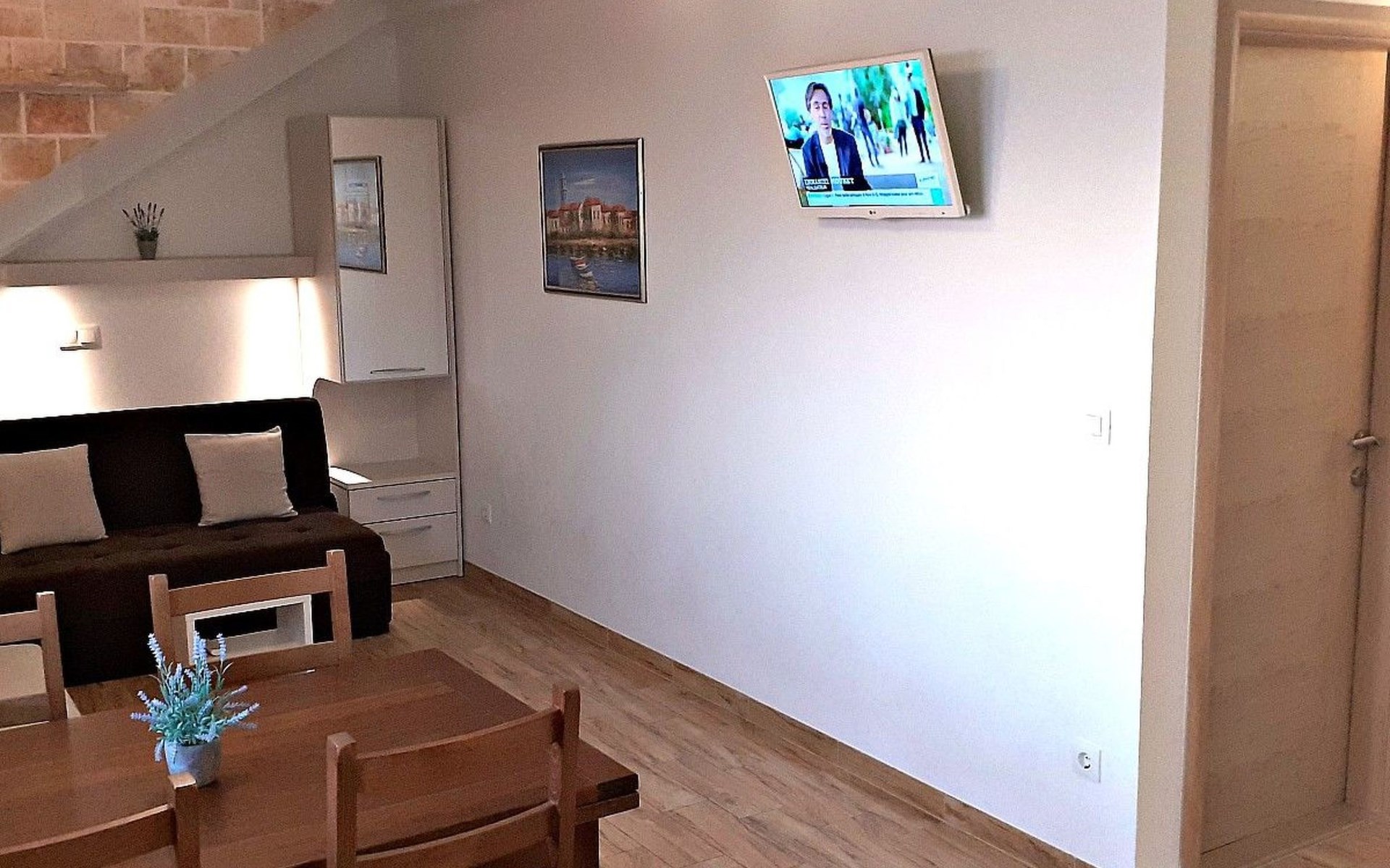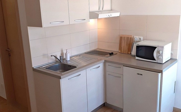 Diese schöne Ferienwohnung befindet sich auf der vierten Etage und bietet Platz für bis zu 4 Personen. Sie verfügt über ein Schlafzimmer mit einem Doppelbett . In der Wohnküche steht noch ein Doppelbett sowie ein Esstisch mit Stühlen bereit. Die Küchenzeile ist gut ausgestattet mit allen erforderlichen Küchenutensilien. Das Badezimmer ist mit einer Badewanne und Toilette eingerichtet. Klimaanlage, Internet und ein Fernseher mit Sat.-TV sind verfügbar.