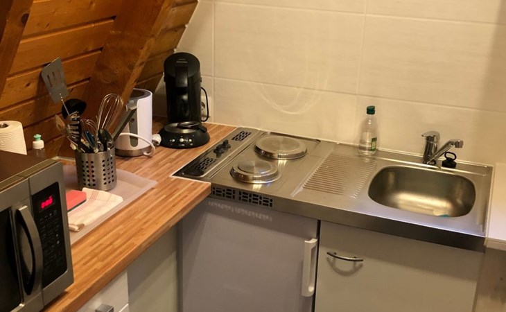 - praktische Küche (Senseo Kaffeemaschine,Toaster, Eierkocher, Geschirr, usw….)