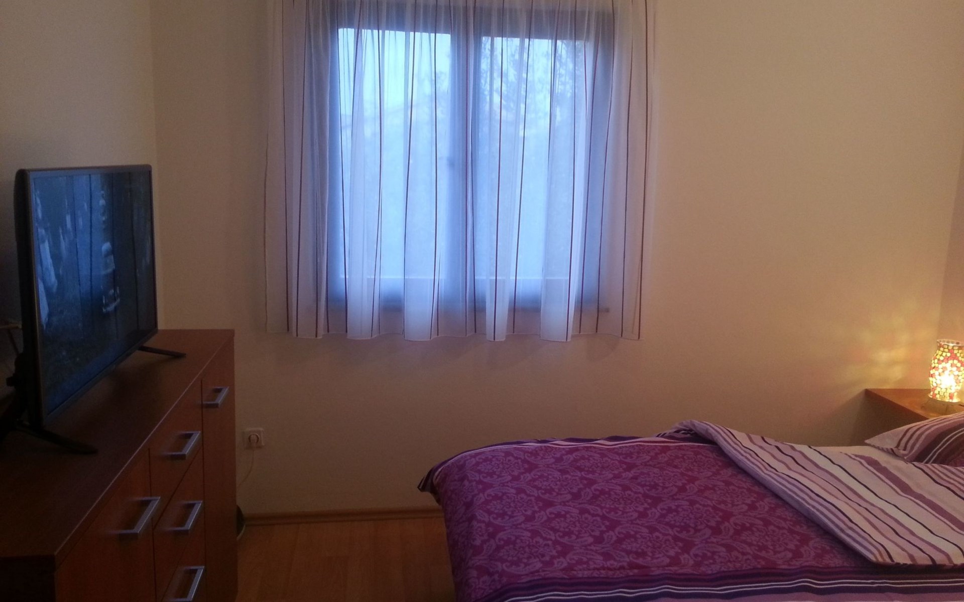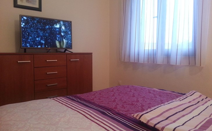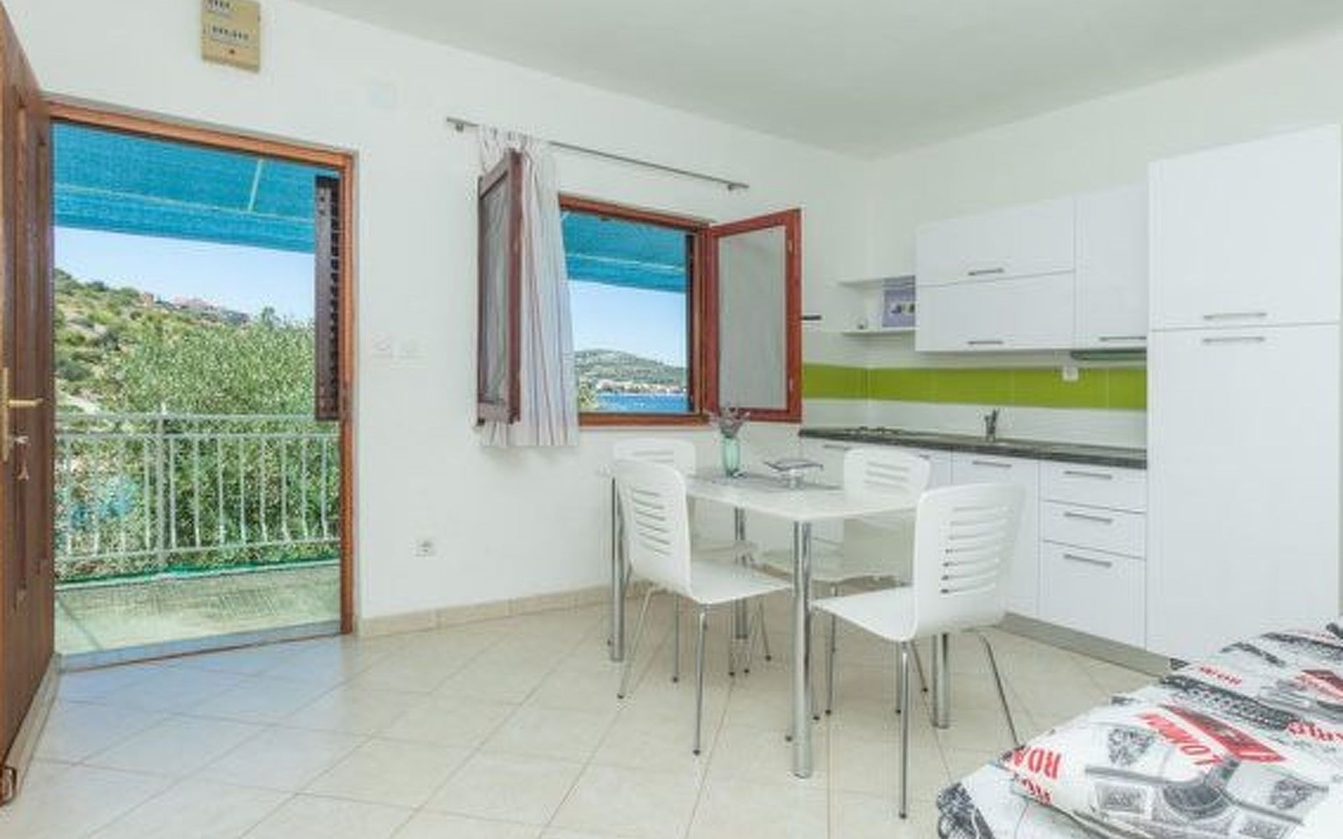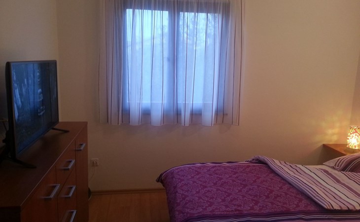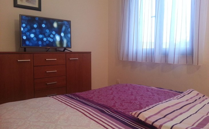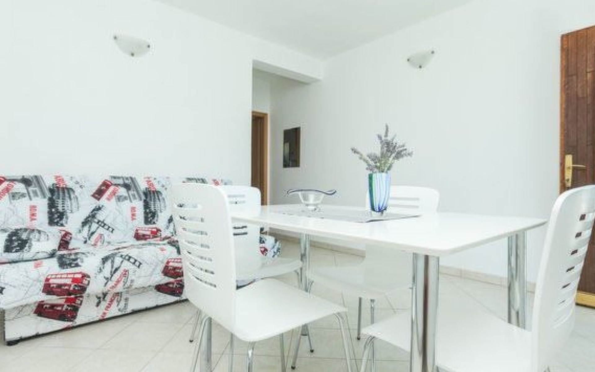 Dieses Appartement mit separatem Eingang liegt auf der ersten Ettage und bietet bis zu vier Personen Platz. Das Schlafzimmer verfügt über ein großes Doppelbett, einen Kleiderschrank und einen Flachbildfernseher mit Sat.-TV. Das Badezimmer besteht aus einer Dusche, Waschbecken und Toilette. Das offen gestaltete Wohn- und Esszimmer mit der Küche ist mit einer Schlafcouch für zwei Kinder und einem Esstisch mit vier Stühlen eingerichtet. Die Küchenzeile ist mit 2-Platten-Herd, Kühl-Gefrierschrank, Mikrowelle und Kaffeemaschine ausgestattet.