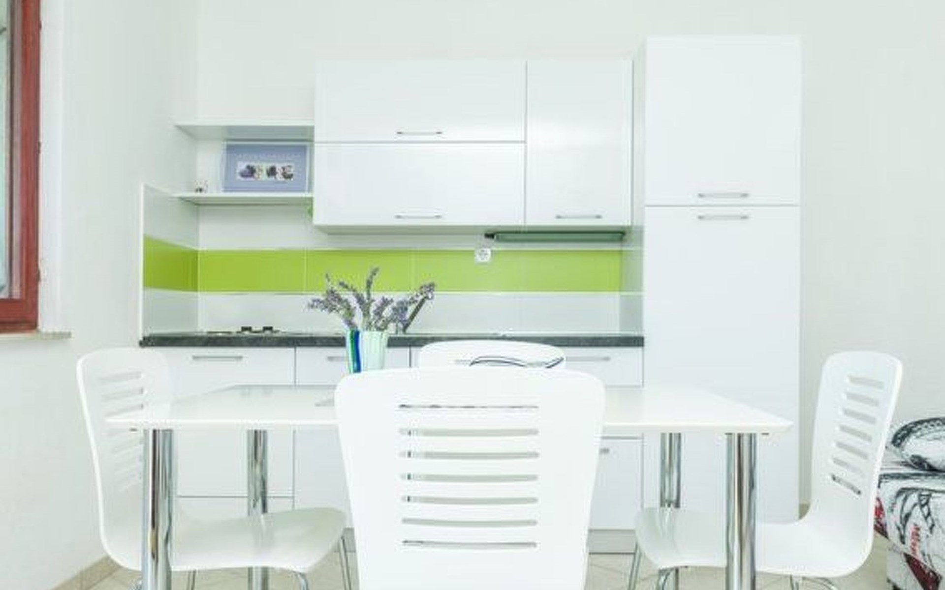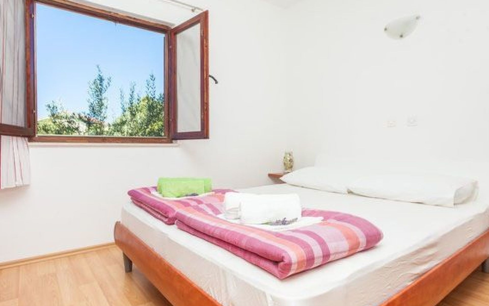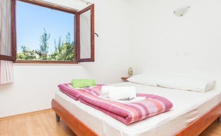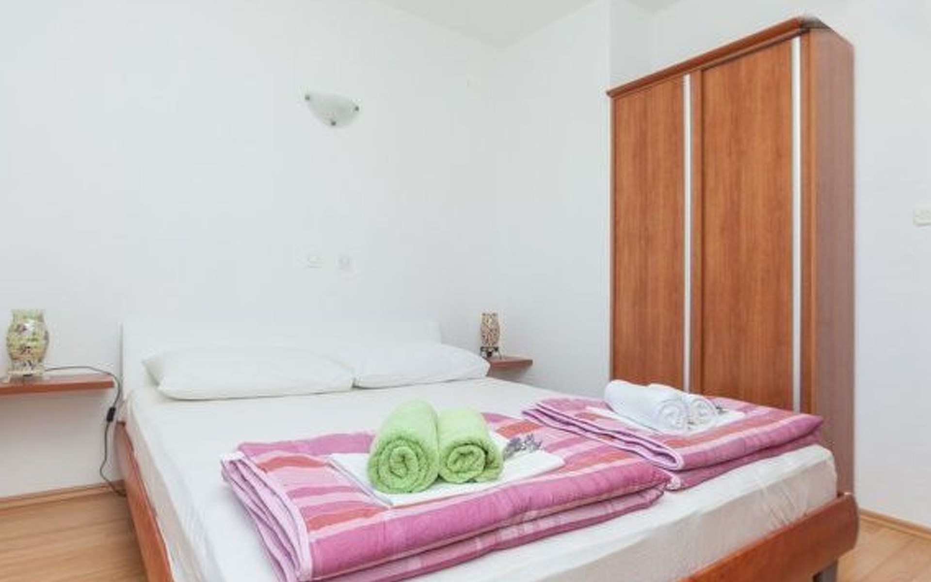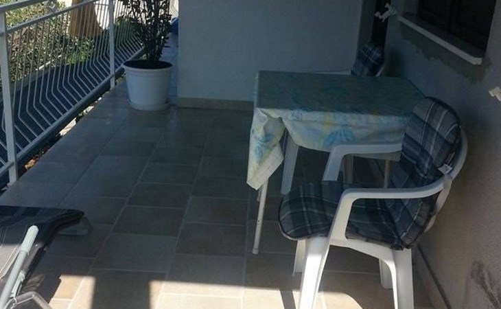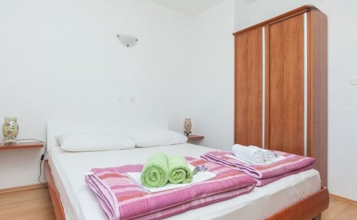 Dieses Appartement mit separatem Eingang liegt auf der ersten Ettage und bietet bis zu vier Personen Platz. Das Schlafzimmer verfügt über ein großes Doppelbett, einen Kleiderschrank und einen Flachbildfernseher mit Sat.-TV. Das Badezimmer besteht aus einer Dusche, Waschbecken und Toilette. Das offen gestaltete Wohn- und Esszimmer mit der Küche ist mit einer Schlafcouch für zwei Kinder und einem Esstisch mit vier Stühlen eingerichtet. Die Küchenzeile ist mit 2-Platten-Herd, Kühl-Gefrierschrank, Mikrowelle und Kaffeemaschine ausgestattet.