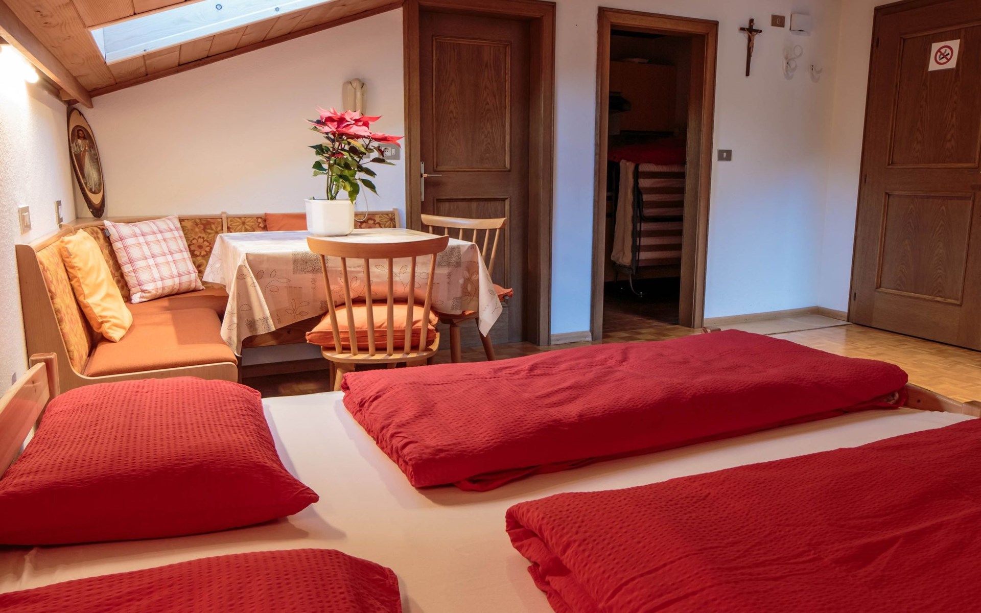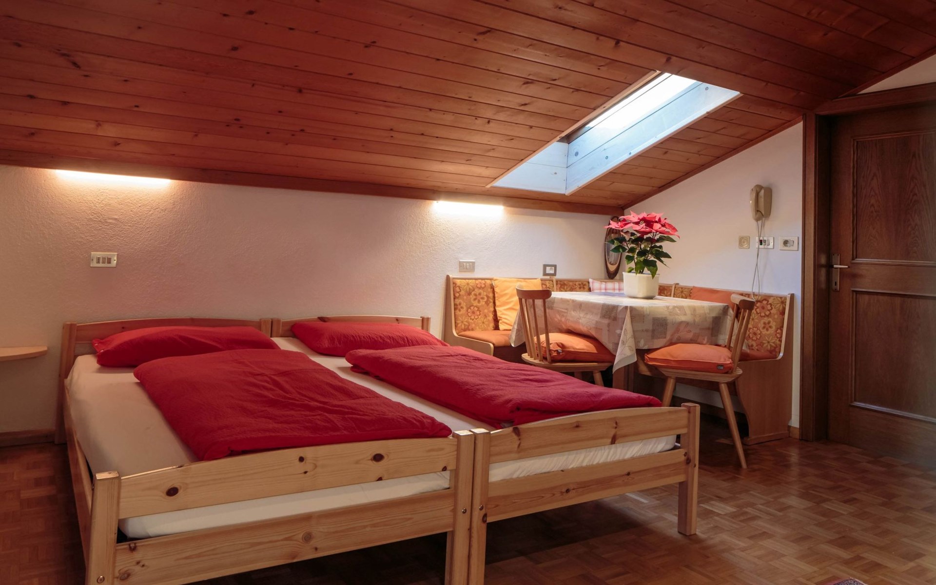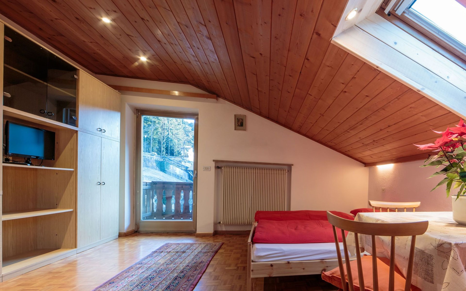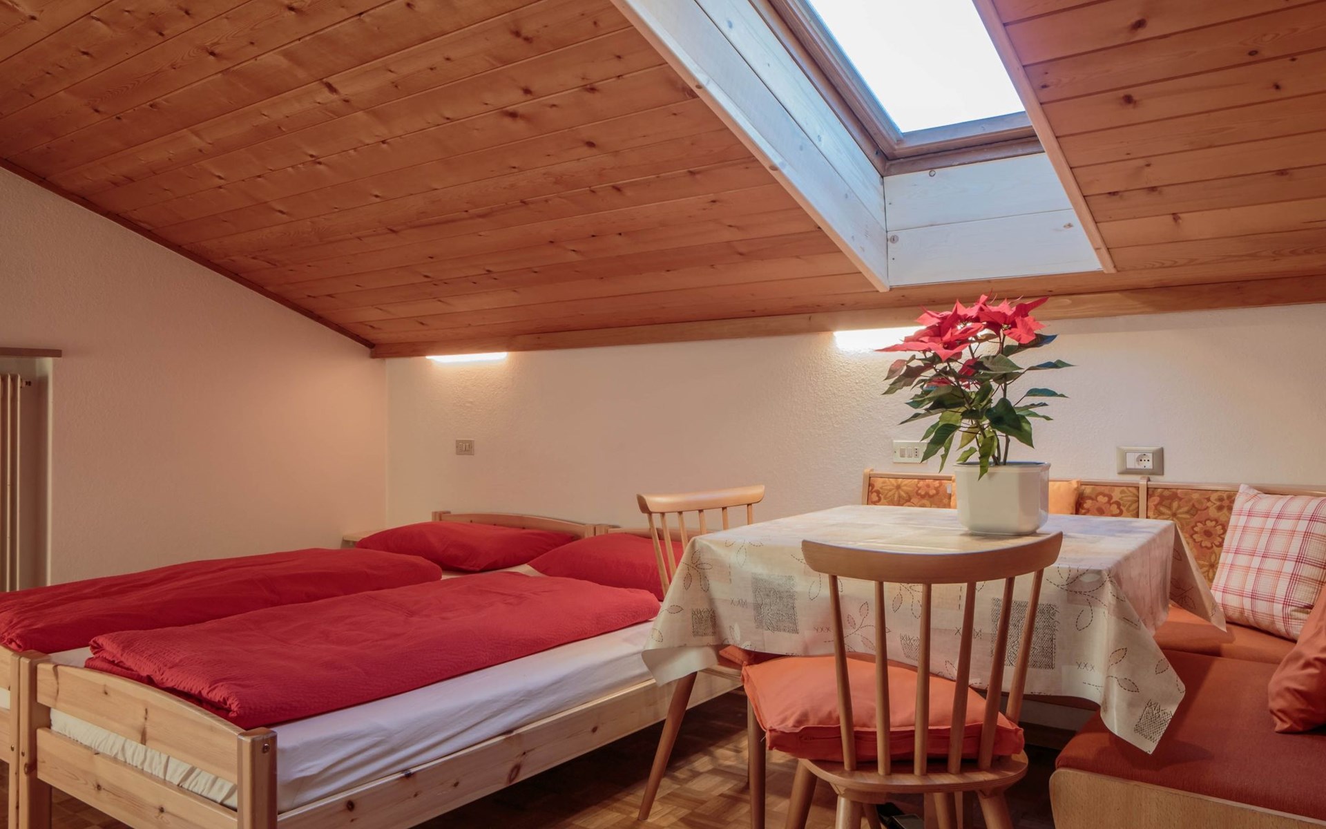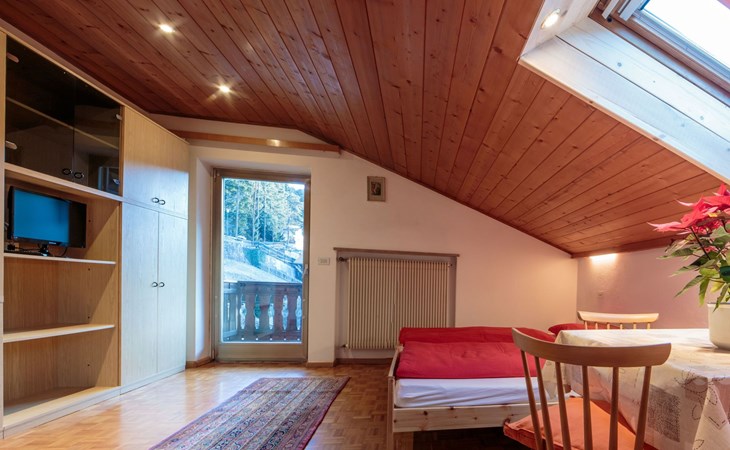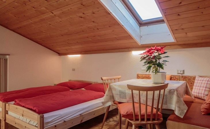 Die Mansarde hat eine Fläche von ca. 30 m² und ist für maximal zwei Personen geeignet. Sie wurde mit natürlichen Materialien wie Holz gebaut und ist nachts frei von Elektrosmog, damit die Gäste eine erholsame Ruhe genießen können. Das Schlafzimmer und das Wohnzimmer sind mit einem Doppelbett ausgestattet. Der Essbereich besteht aus einer Eckbank und einem Tisch. Vom Zimmer aus gelangt man in die Kochnische, in der sich eine voll ausgestattete Küche befindet. Diese ist mit einem Gasherd, einer Kaffeemaschine, einem Wasserkocher und einem Kühlschrank sowie mit Geschirr und Kochutensilien ausgestattet. Daneben befindet sich das Bad mit Dusche, Bidet, Waschbecken und Haartrockner. Die Wohnung ist sowohl im Sommer als auch im Winter ideal für einen Urlaub in den Bergen. Sie kann beheizt werden und benötigt aufgrund ihrer erhöhten Lage in den Bergen auch in den Sommermonaten keine Klimaanlage. Die Wohnung ist außerdem mit Bettwäsche, Handtüchern und WLAN-Internetzugang ausgestattet. Ein Kinderbett für Kleinkinder ist auf Anfrage erhältlich. Ostbalkon mit Panoramablick.