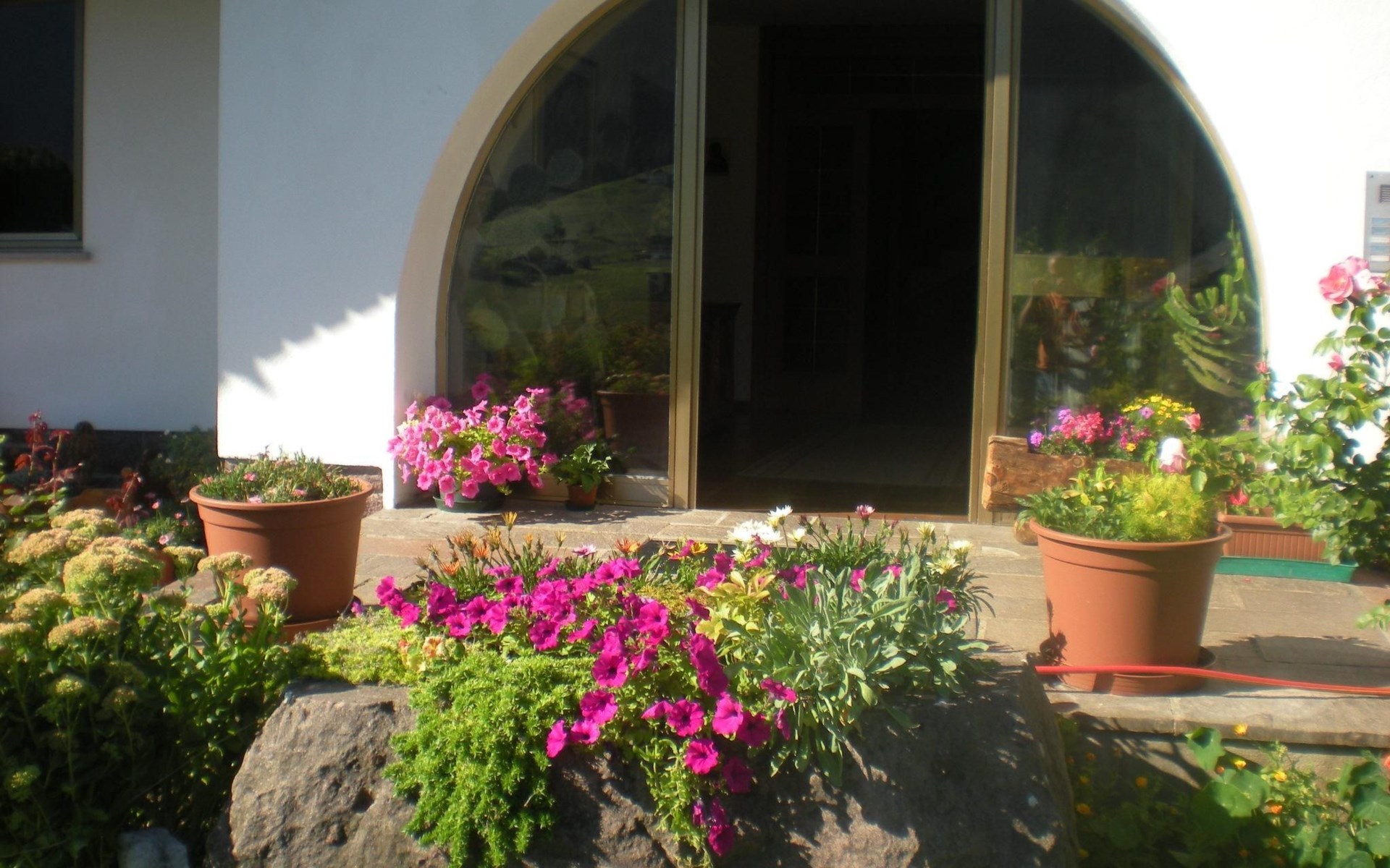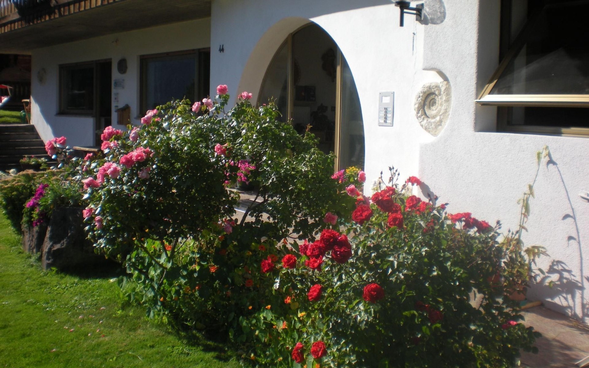 Die Außenanlagen werden mit den anderen Hausgästen geteilt. Das eingezäunte Grundstück verfügt über einen Blumengarten und eine Terrasse mit Tischen, Stühlen, Liegestühlen und Sonnenschirmen, die zum Genießen von Mahlzeiten oder einfach zum Entspannen und Sonnenbaden einladen. Den Gästen steht auch ein Parkplatz in der Garage zur Verfügung.