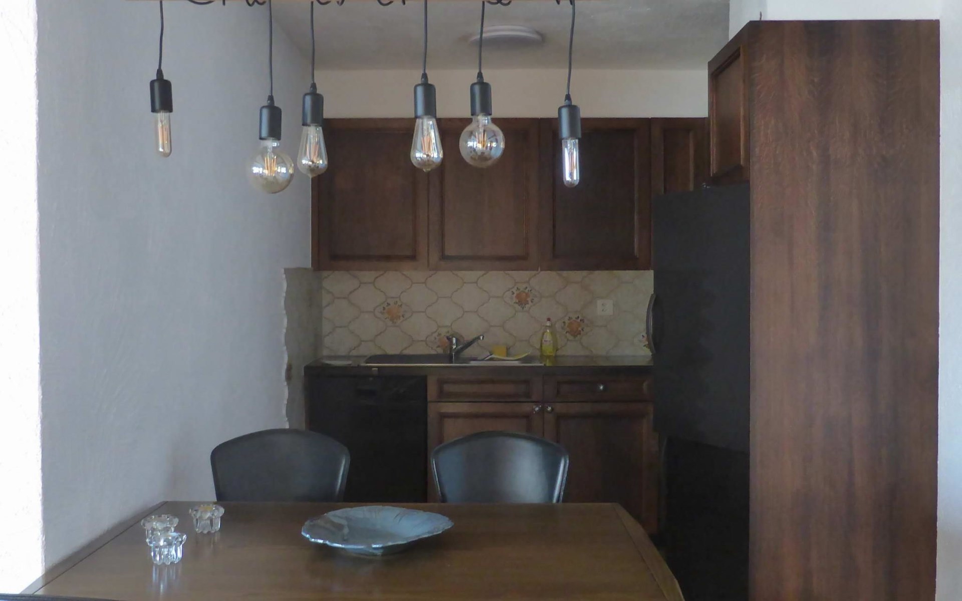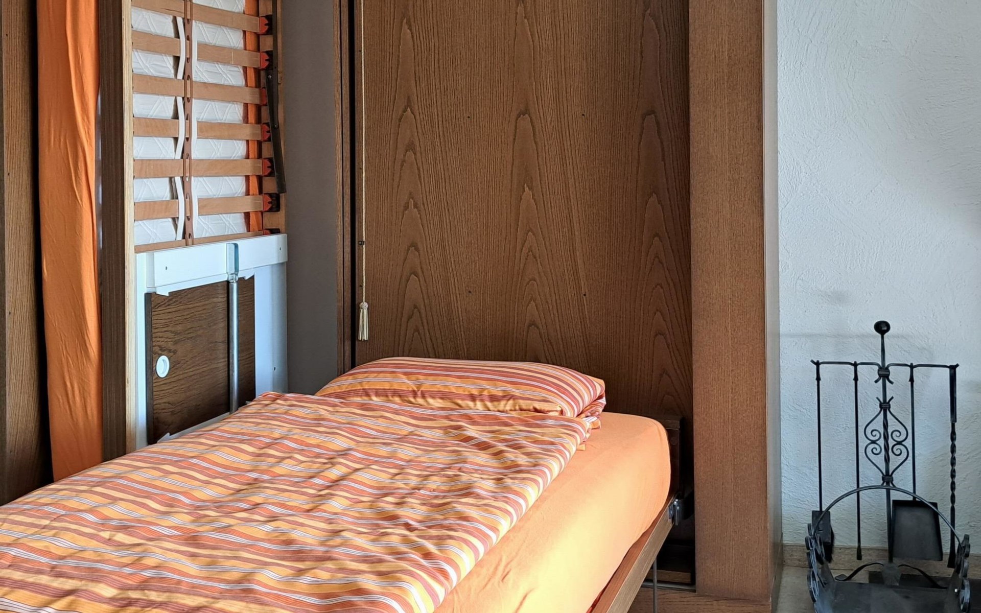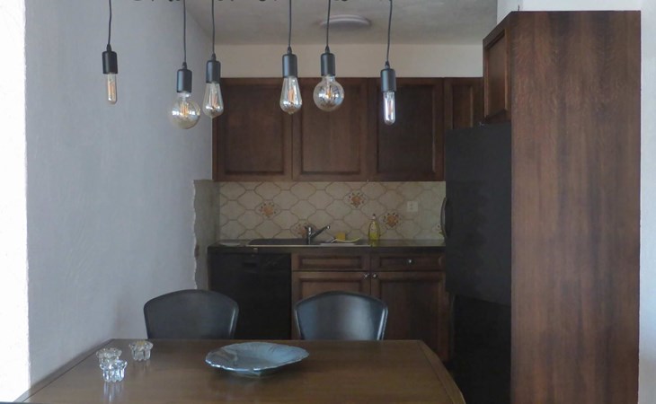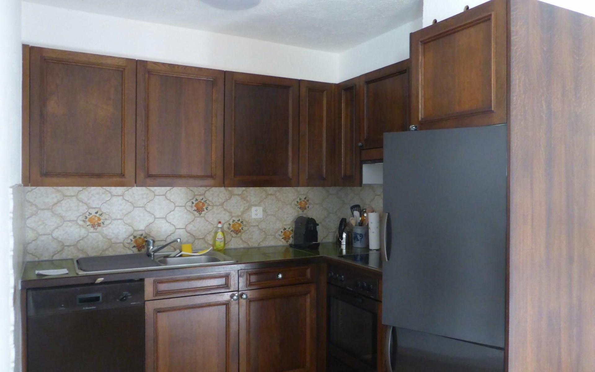 Offener Grundriss des Wohn-/Esszimmers mit Küchenecke. Gut ausgestattete Küche mit Nespresso-Kaffeemaschine. Keine Haustiere erlaubt. Nichtraucher-Wohnung. Geeignet für Erwachsene / Familien ohne Kleinkinder. Die Schrankbetten im Wohnzimmer sind Zusatzbetten bei der Belegung der Wohnung mit drei oder vier Personen.