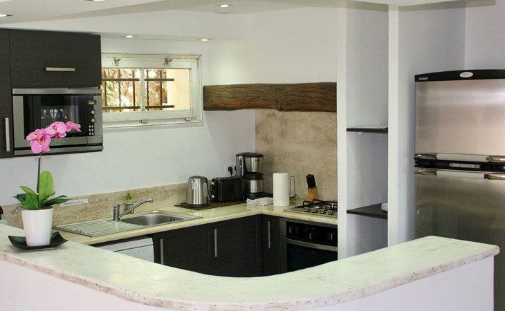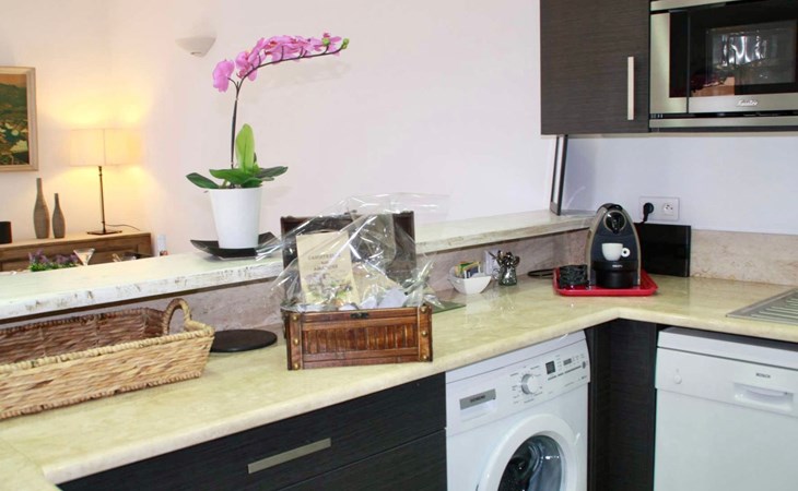 Das Innere der Villa ist auf Ihren Komfort und Ihr Wohlbefinden ausgerichtet und verfügt über zwei Schlafzimmer, die bis zu sechs Personen beherbergen können. Jedes Zimmer ist sorgfältig eingerichtet und klimatisiert und bietet einen außergewöhnlichen Meerblick für ein unvergessliches Erwachen. Das geräumige Wohnzimmer ist mit zwei bequemen Sofas ausgestattet, von denen eines zu einem 140 cm breiten Bett mit Bultexmatratze umgewandelt werden kann. Im Wohnbereich befindet sich außerdem ein großer Fernseher, der ideal für entspannte Abende ist. Die Küche lässt keine Wünsche offen, sie ist komplett mit hochwertigen Elektrogeräten ausgestattet und verfügt über eine Nespresso für Kaffeeliebhaber.