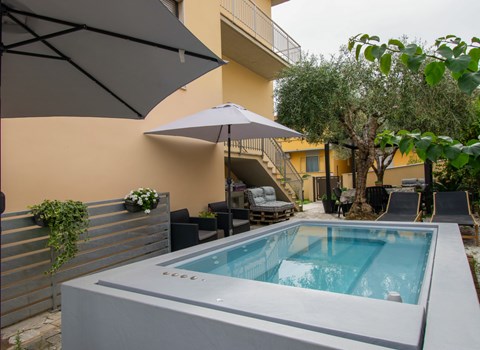 Im Außenbereich haben Sie die Möglichkeit, die Sonnenliegen am Pool zu nutzen, wo Sie sich entspannen können. Es ist der ideale Ort für ein Frühstück im Freien oder einfach nur Momente der Ruhe, um die Schönheit der Landschaft um Sie herum zu bewundern.