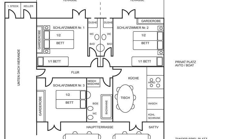 Unsere großzügige 110m² Ferienwohnung bietet einen privaten Eingang, der Sie in den großzügigen Wohnraum führt, der bis zu acht Personen bequem Platz bietet. Ausgestattet mit drei komfortablen Schlafzimmern, die jeweils über ein Doppelbett und teils zusätzliche Schlafmöglichkeiten verfügen, sowie einem eigenen Badezimmer mit Dusche und WC in jedem Zimmer, bietet diese Wohnung höchsten Wohnkomfort. Eine voll ausgestattete Küche, ein gemütliches Esszimmer und ein einladender Wohnbereich mit SAT-TV und kostenlosem WLAN vervollständigen das Angebot und machen diese Wohnung zum perfekten Rückzugsort für Familien und Gruppen, die Komfort und Privatsphäre schätzen.