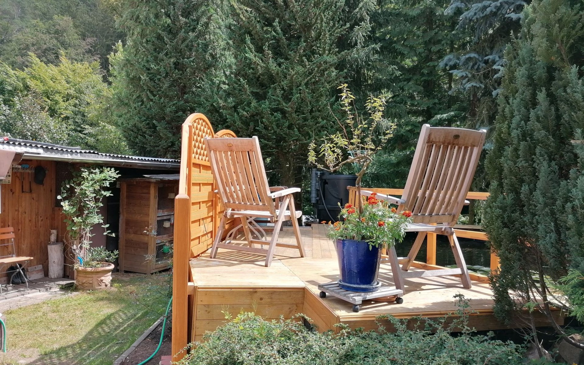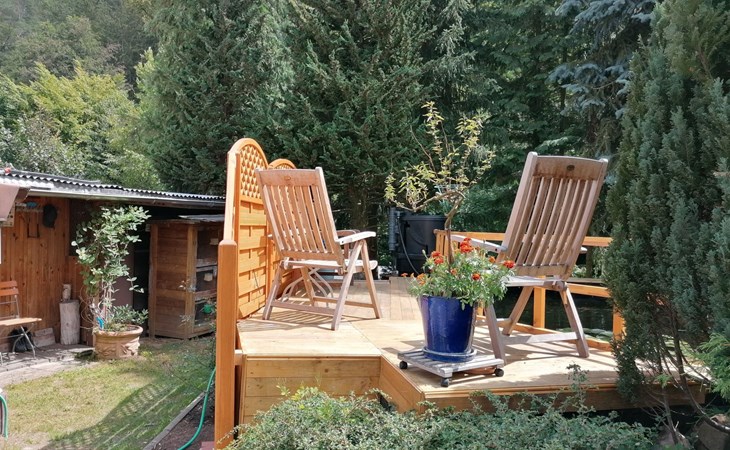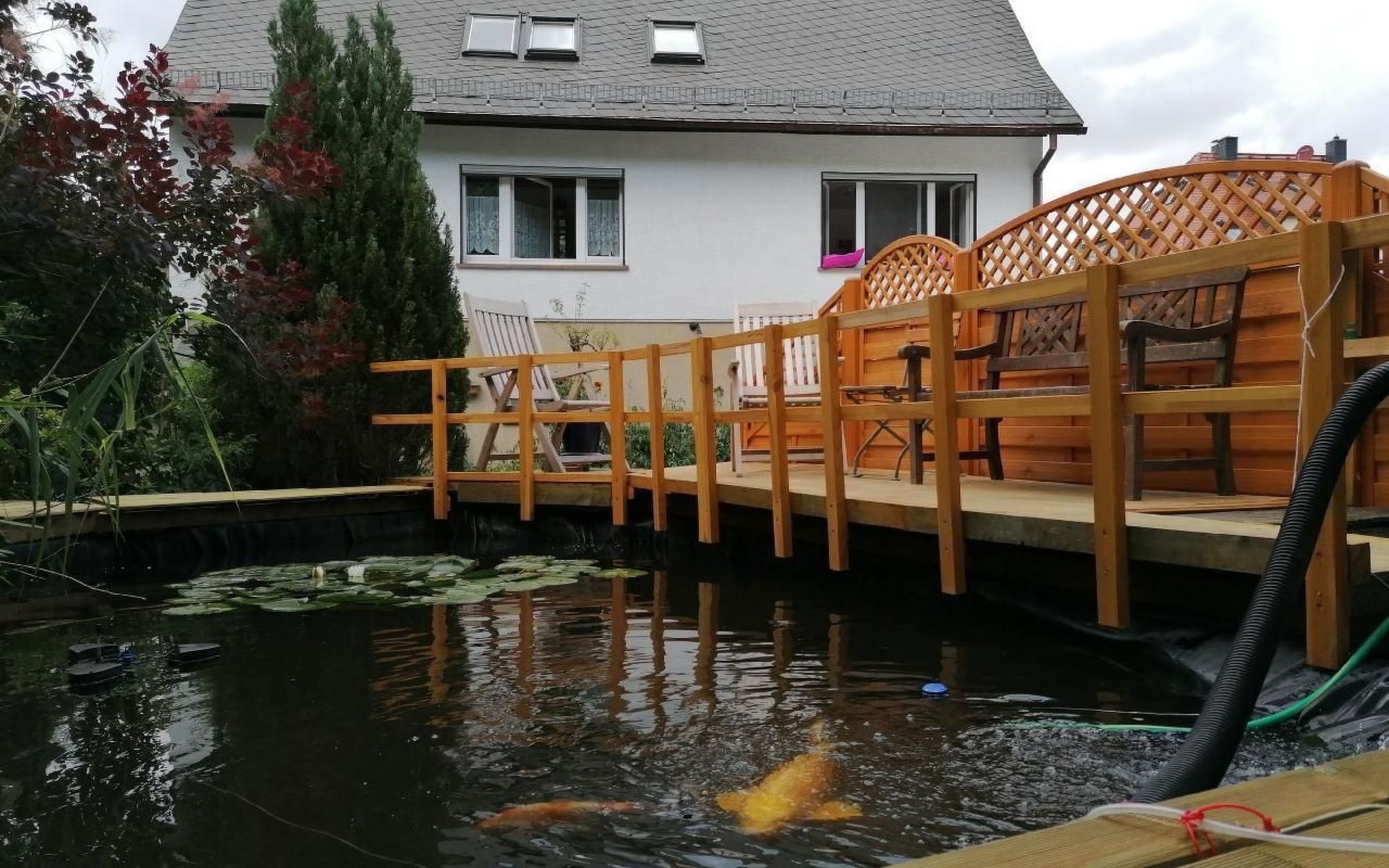 Außen bietet sich ein idyllischer Garten mit einem einladenden Koi-Teich und einer Sonnenterrasse, ideal für erholsame Stunden im Freien. Entspannen Sie auf Liegestühlen, grillen Sie im Gartenhaus oder genießen Sie gemeinsame Momente an der Sitzgruppe. Direkt ab Haus beginnt ein markierter Wanderweg entlang des Vorholzbaches durch den Wald, der Ihnen spektakuläre Aussichten über Freital bietet.