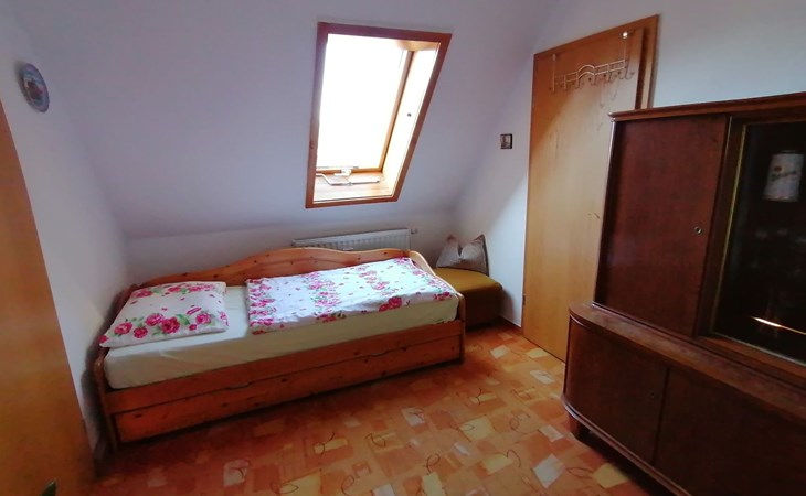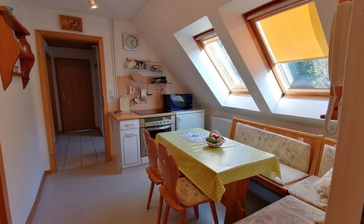 Im Inneren der Ferienwohnung erwartet Sie ein gemütliches, 72 m² großes Dachgeschoss, ausgestattet mit einem Wohnbereich, der eine Schlafcouch, SAT/TV und Radio für entspannte Abende bietet. Die Privatsphäre wird durch drei liebevoll eingerichtete Schlafzimmer gewährleistet: ein Einzelzimmer mit eigener Dusche/WC, ein weiteres Einzelzimmer und ein Doppelzimmer mit einem komfortablen 180 x 200 cm großen Bett und einem zusätzlichen Fernseher. Die vollständig ausgestattete Küche, inklusive Herd, Cerankochfeld, Backofen, Mikrowelle, Geschirrspüler und einer Essecke sowie einem Küchenradio, lädt zum gemeinsamen Kochen und Verweilen ein. Ein weiteres Badezimmer mit Dusche und WC vervollständigt die komfortable Innenausstattung.
