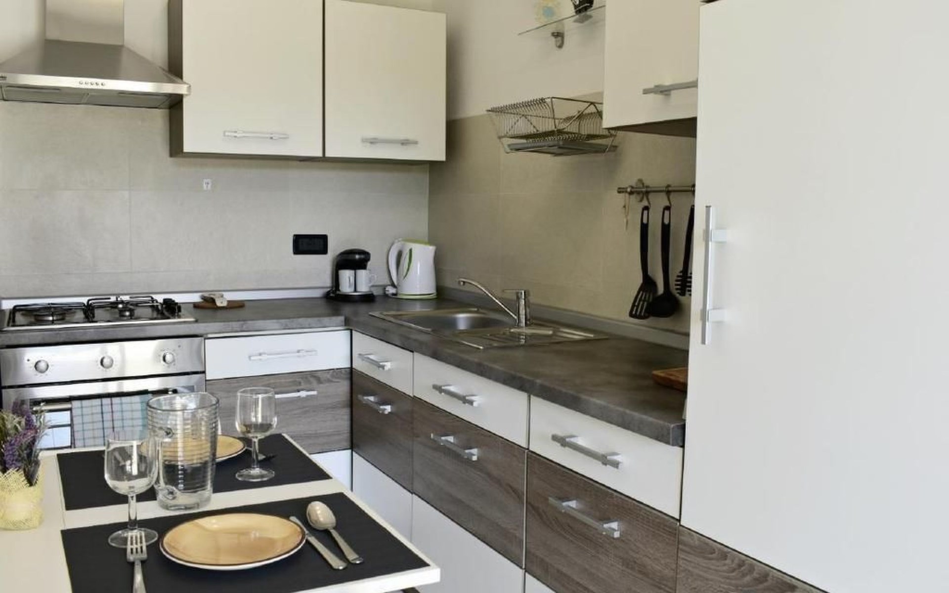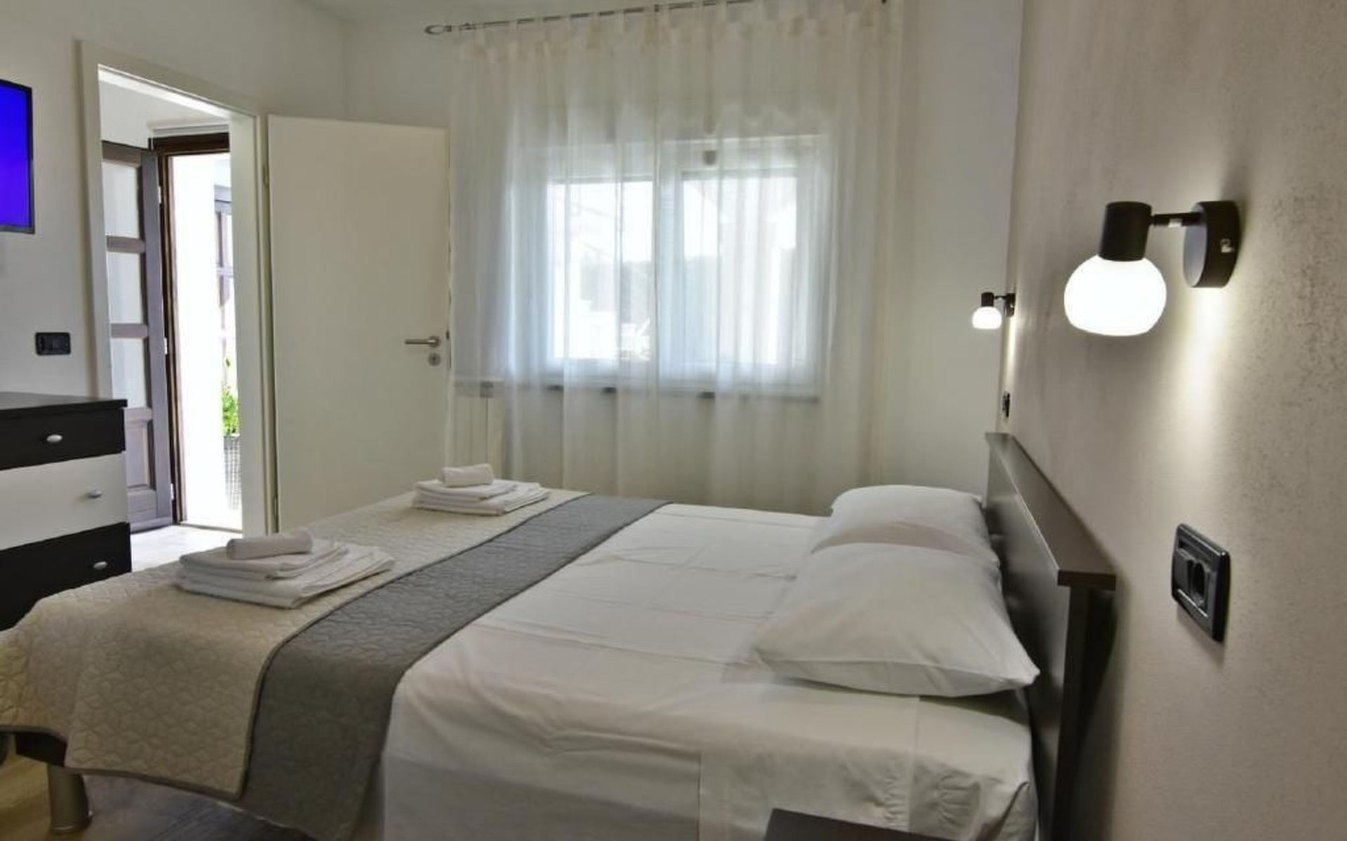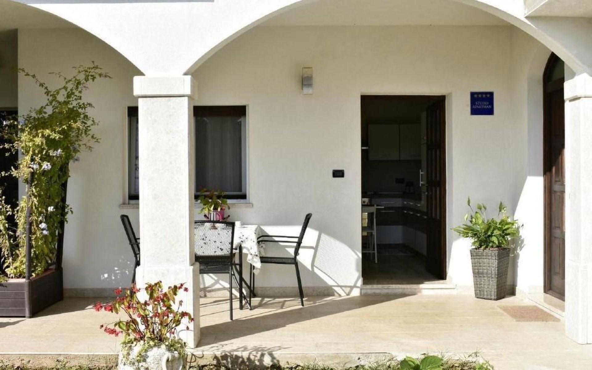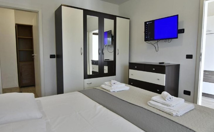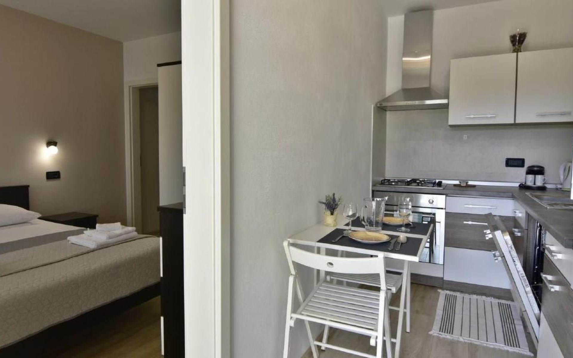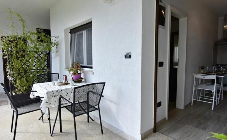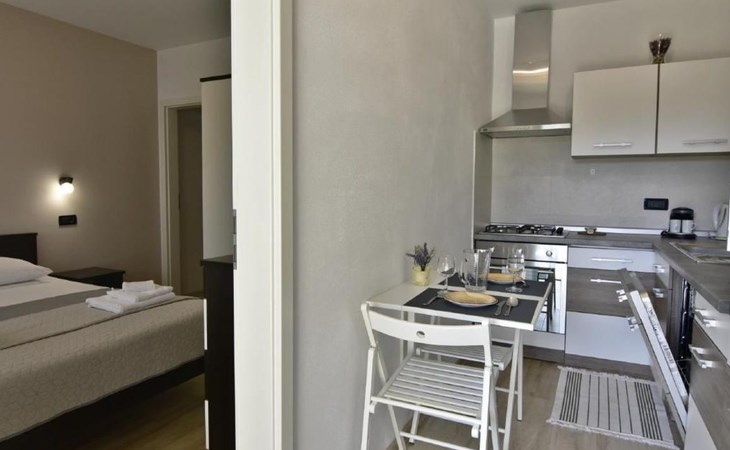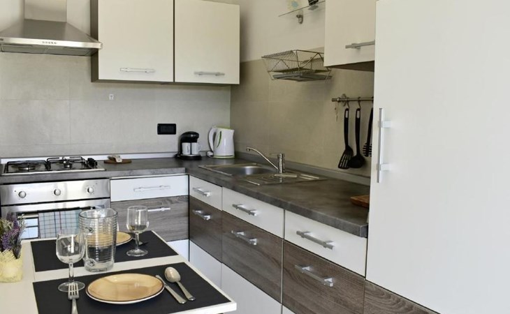 Im Inneren erwartet Sie eine moderne und voll ausgestattete Küche mit Geschirrspüler, Backofen, Herd, Kühlschrank und einem gemütlichen Esstisch für zwei. Das angrenzende Schlafzimmer verspricht mit einem komfortablen Doppelbett, Nachttischen, einem geräumigen Kleiderschrank sowie einem Flachbild-Sat-TV Komfort pur. Zudem steht Ihnen eine Klimaanlage zur Verfügung und das Badezimmer ist mit einem Bidet, WC, einem Waschbecken samt Spiegel und einer Duschkabine komplett ausgestattet. Bettwäsche wird wöchentlich gewechselt und eine kostenlose WLAN-Internetverbindung ist ebenfalls Teil des Angebots.