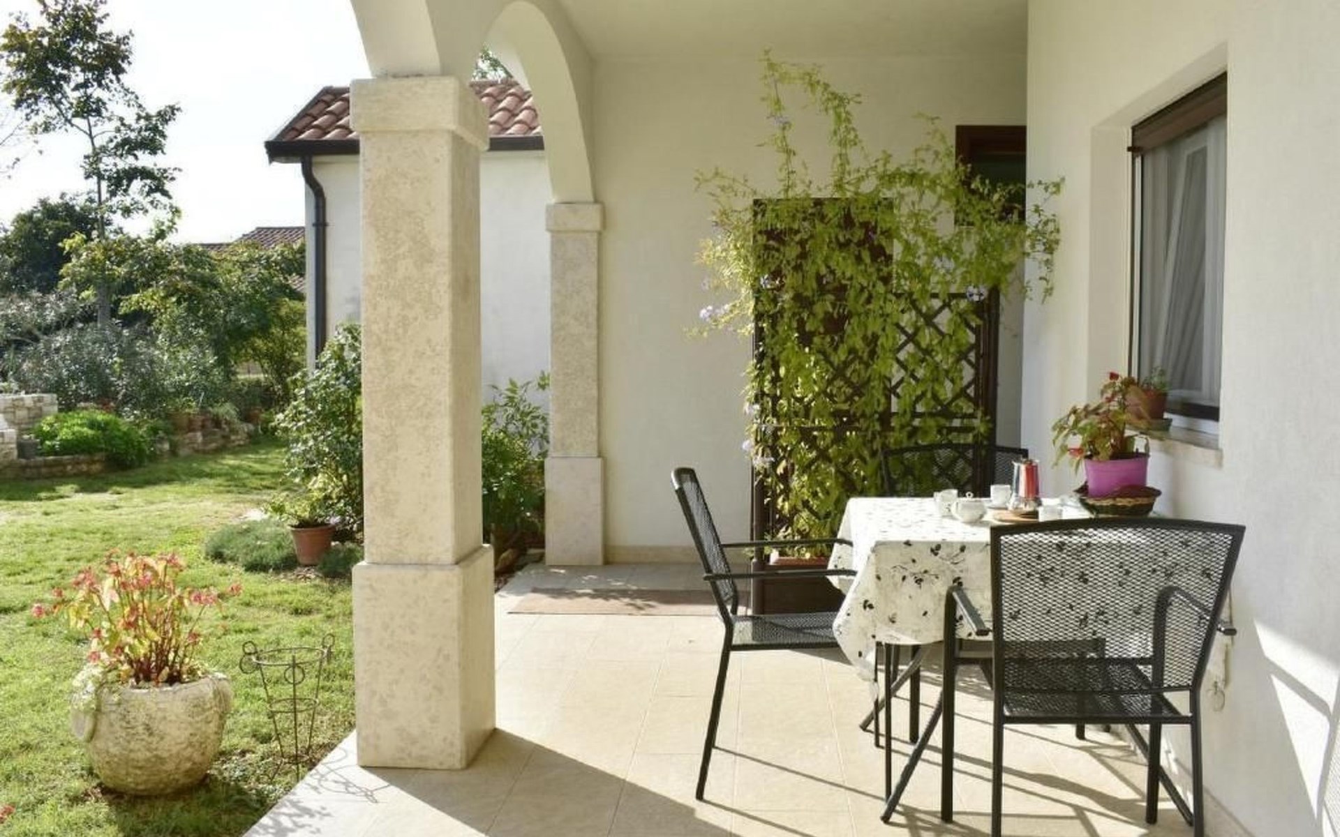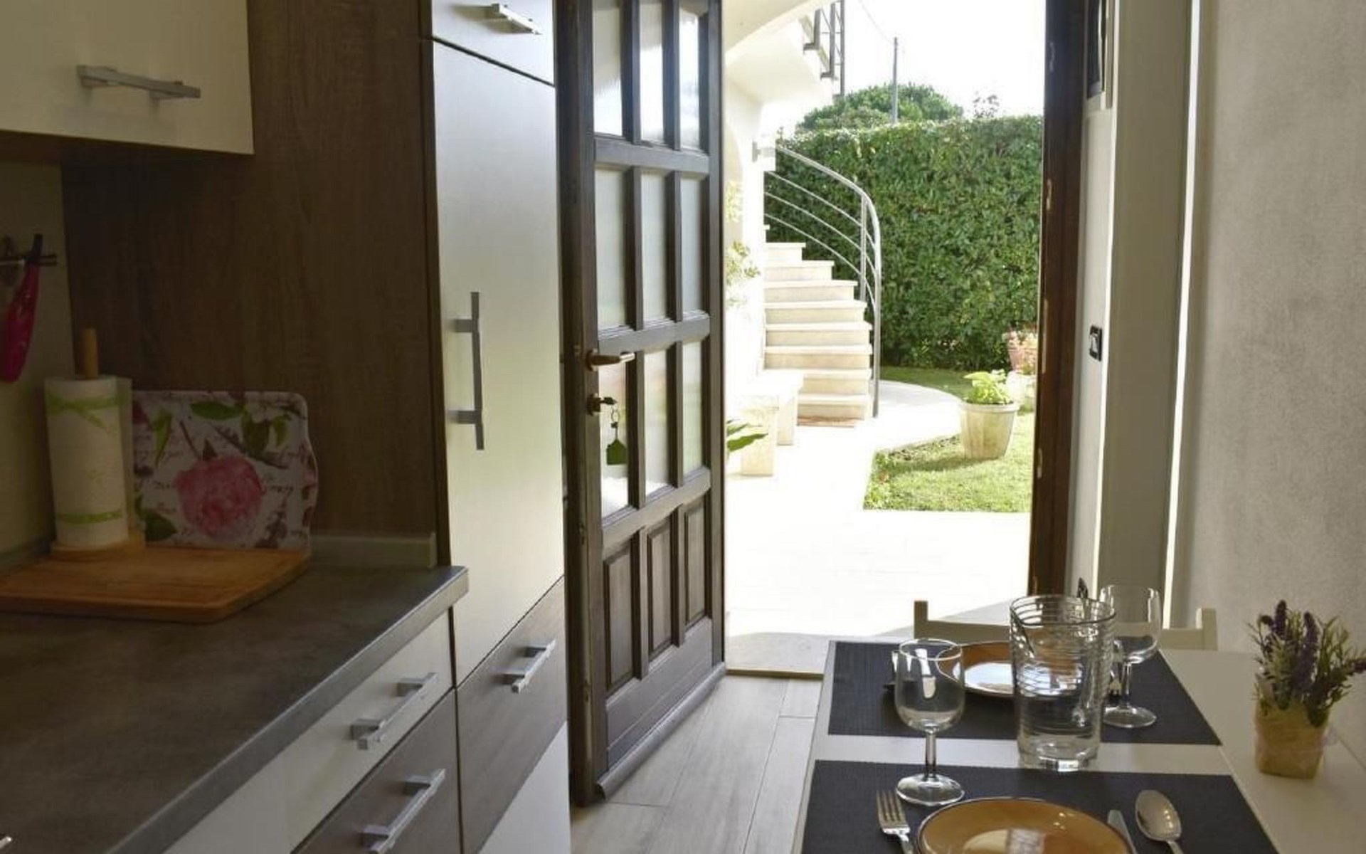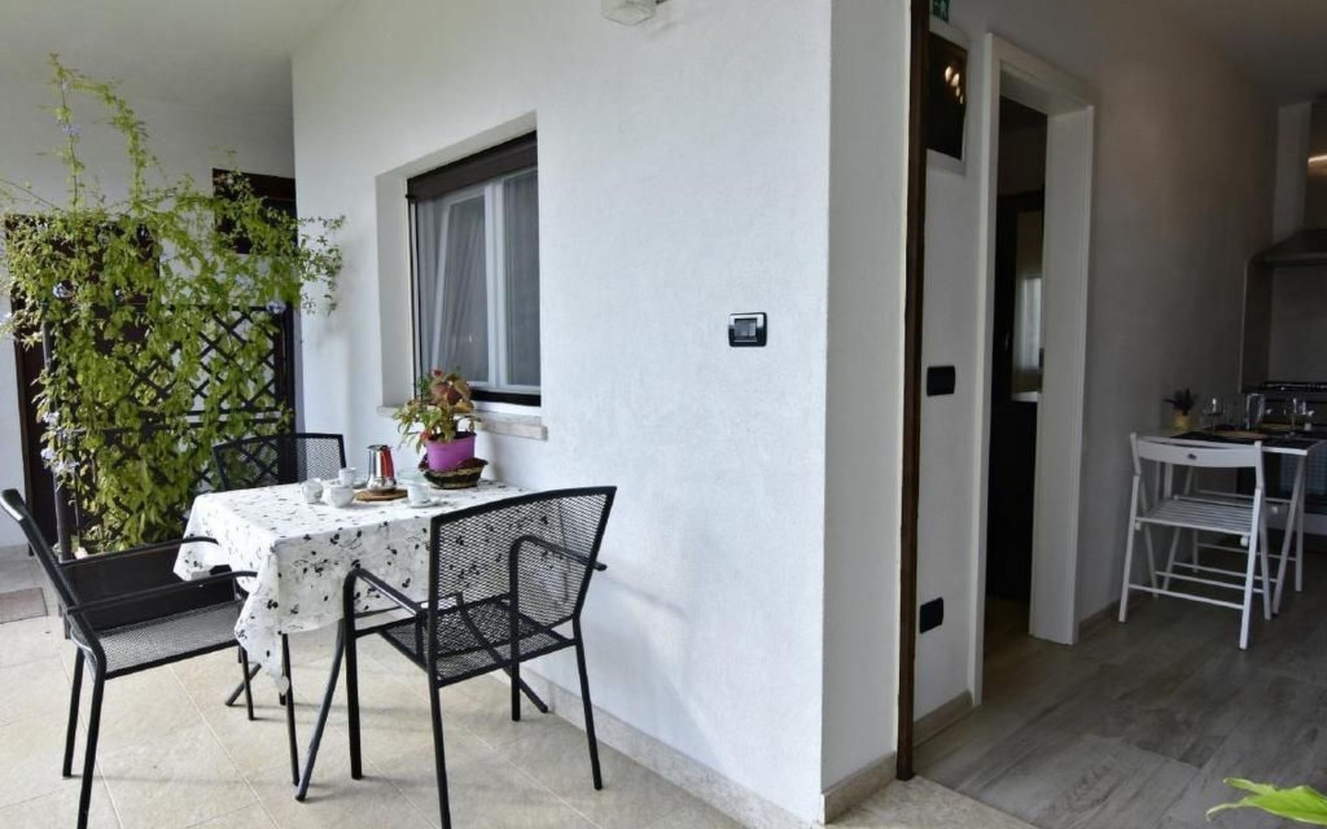 Der Außenbereich bietet eine große Terrasse mit Tisch und Stühlen, ideal, um die Ruhe des Gartens zu genießen oder ein entspanntes Frühstück im Freien zu haben. Ein privater Parkplatz direkt vor dem Haus rundet das Angebot ab und sorgt für zusätzlichen Komfort während Ihres Aufenthalts.